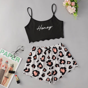 Letter Print Sling Top Leopard Shorts Homewear Set Sleeveless Trim Sexy Pyjamas Lace Pijama Suit Sleepwear Women Sexy Nighties  - Regular price