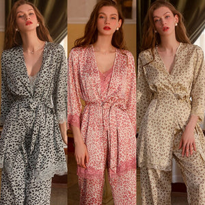 3Piece Pamajas Sets for Women Leopard Print Lace Sleepwear Silk Robe Nightgown Camisole Backless Home Suit Sleep Tops Lingerie