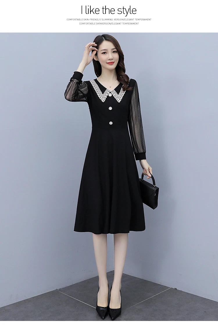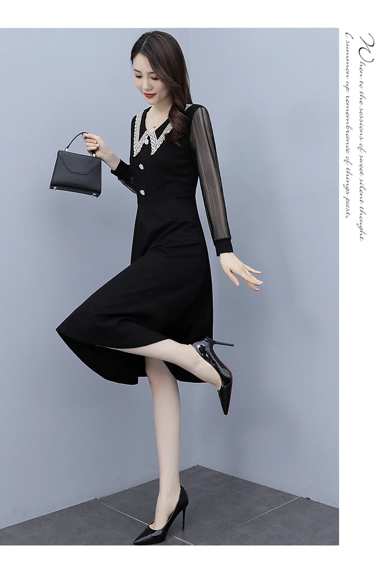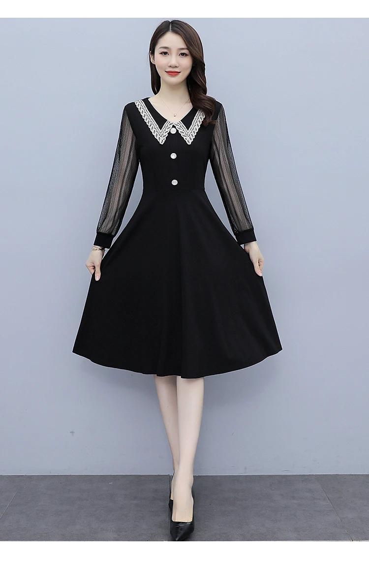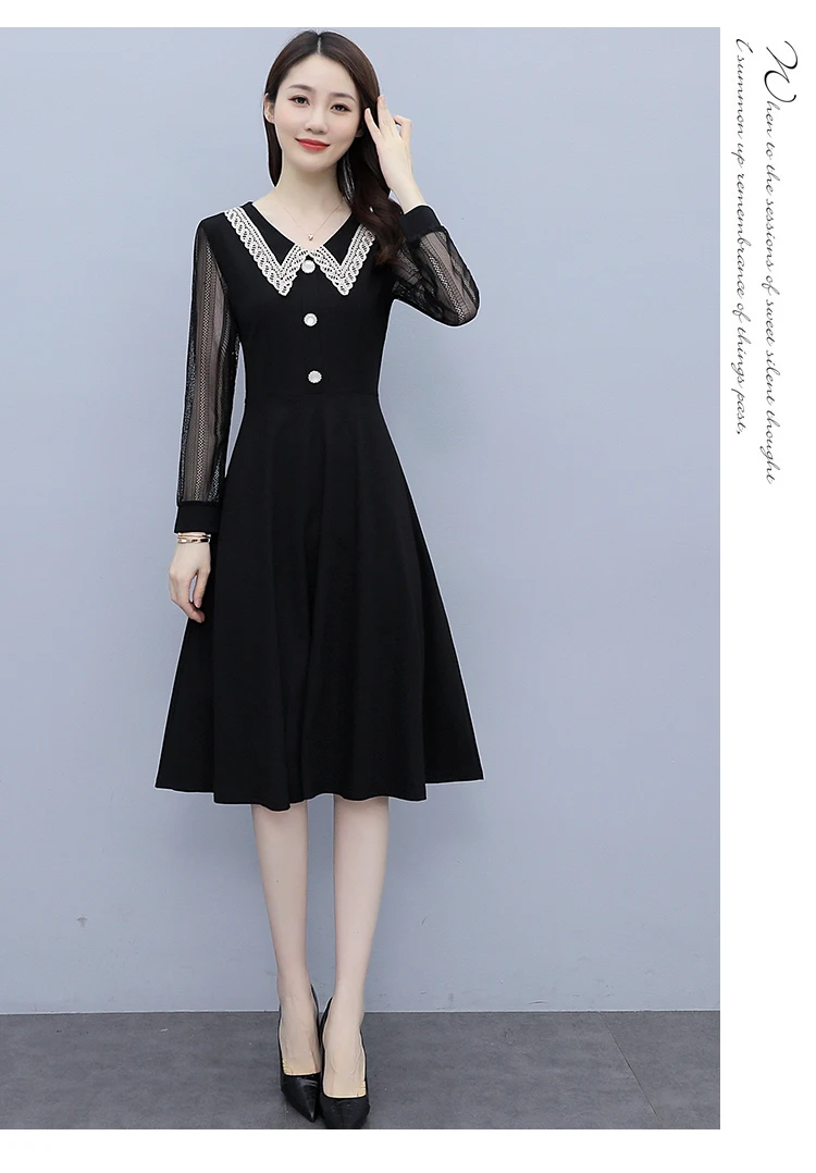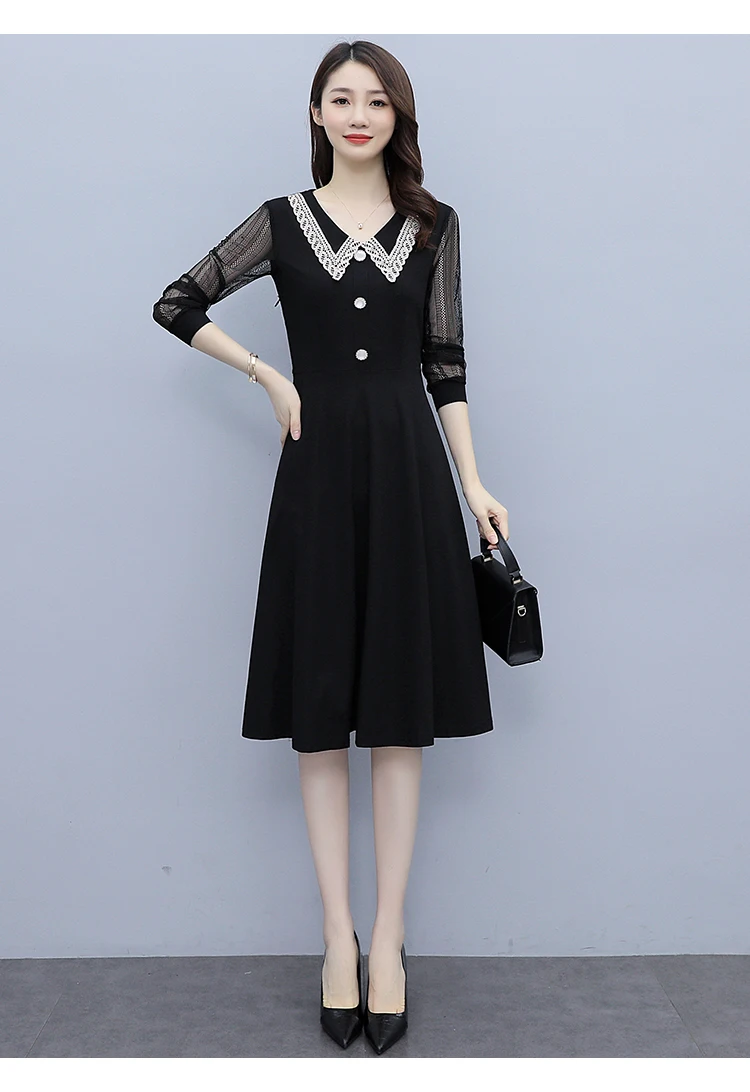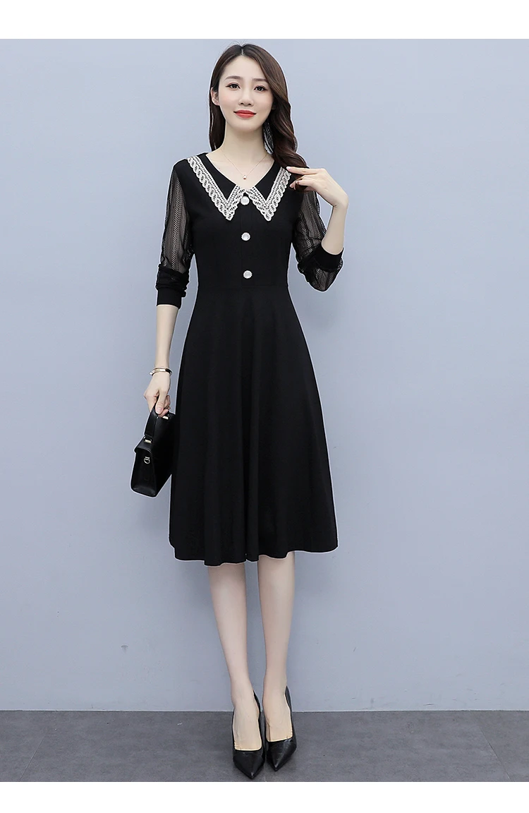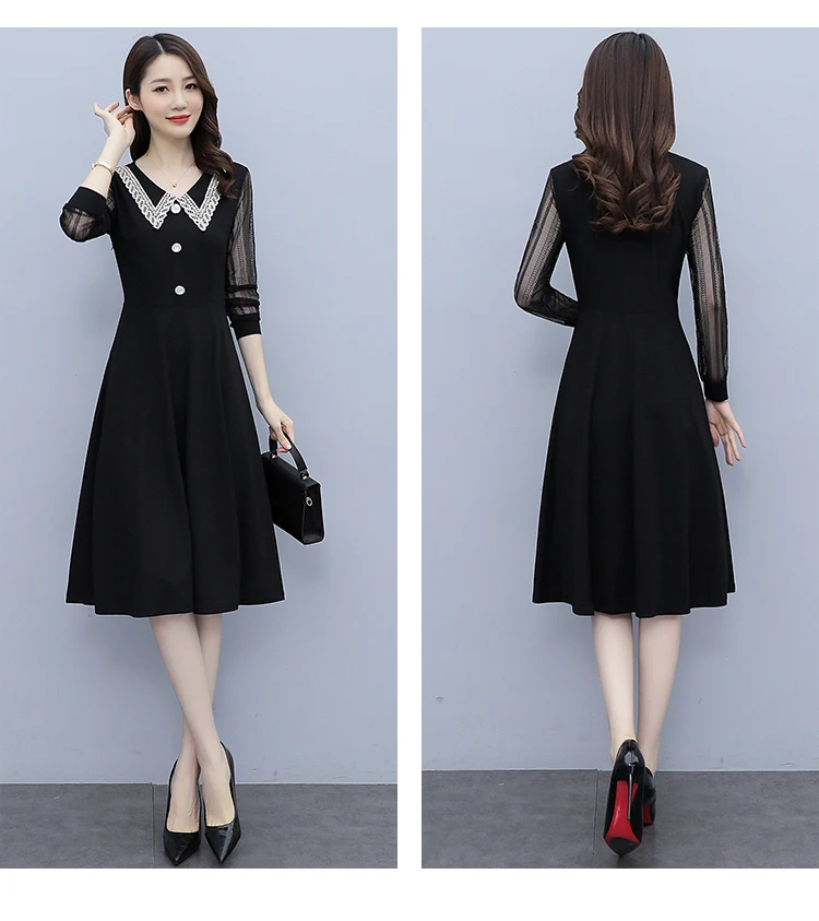 Female Lace Long Sleeve Patchwork V-Neck Button High Waist Plus Size Fashion Korean Slim Knee Length Dress Women Vestidos M-5XL