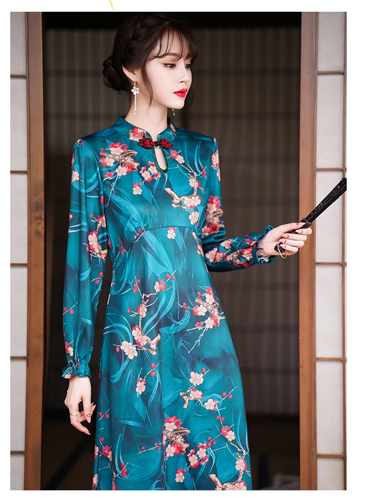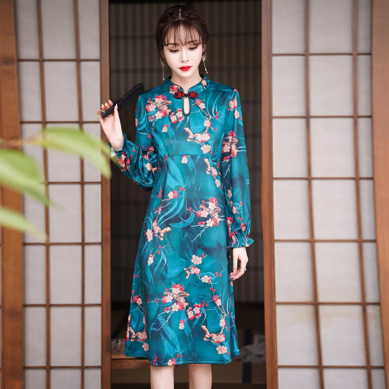 Long Sleeve Retro High Waist Dress Women Autumn Floral Print Plus Size Elegant Chinese Style Improved Cheongsam Ladies Clothes