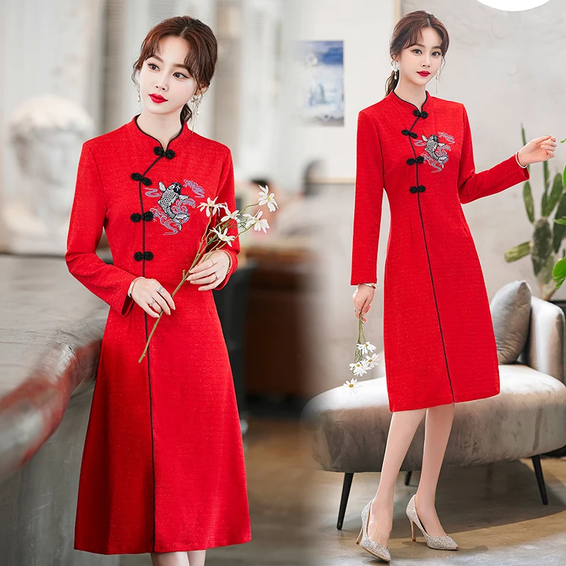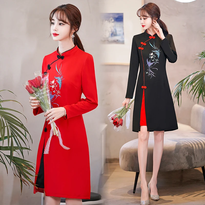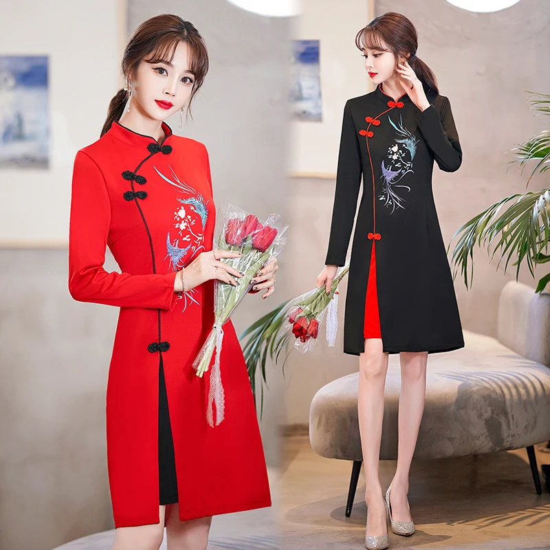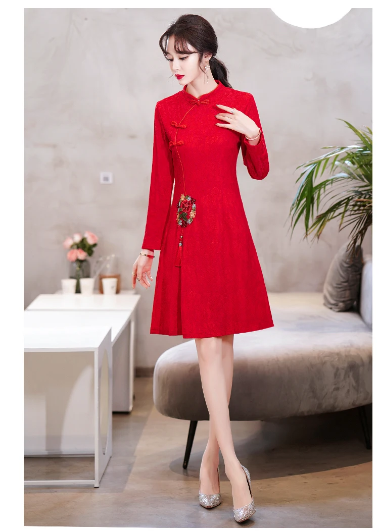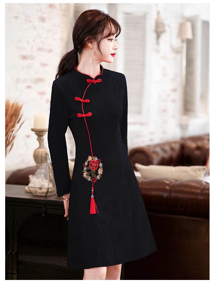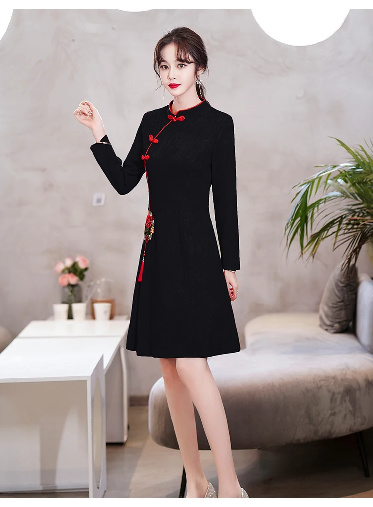 Long Sleeve Stand Collar Retro Buckle Lace Slim Improved Cheongsam Lady Autumn Elegant Plus Size Chinese Style Women Mini Dress