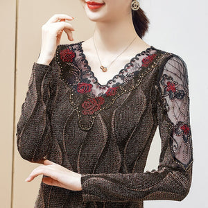 2021 Spring New Women T-shirt Fashion Diamond lace long-sleeved Tops Elegant Slim Hot drilling Tees Plus Size Lady Blusas  - Regular price