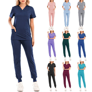 • Nursing Uniforms Two Piece Unisex Shorts Scrub Sets Sleeve Pocket Top Tee Loose Pants Beauty Salon Workwear Overalls Plus Size