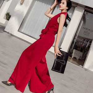 2021 Summer Elegant Ladies Sleeveless Solid Jumpsuits V-Neck High Waist Sashes Women Casual Slim Wide Leg Rompers Female