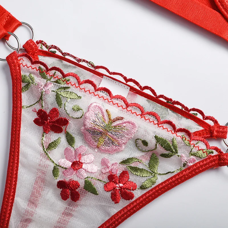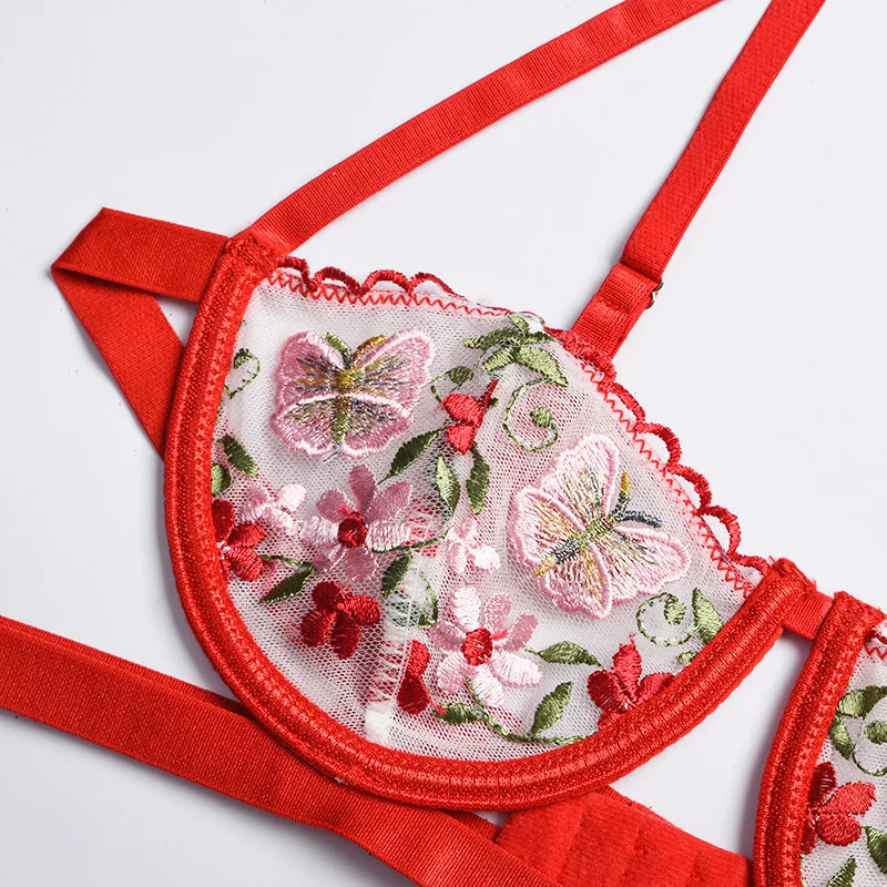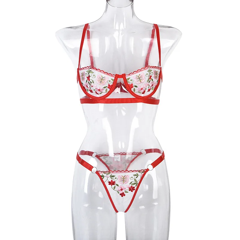 2 Pieces Brief Sets Lace Lingerie Women Butterfly Floral Embroidery Underwear See Through Red Bra and Panty Erotic Lingerie Set
