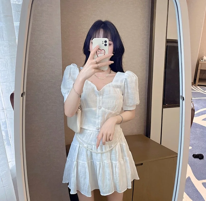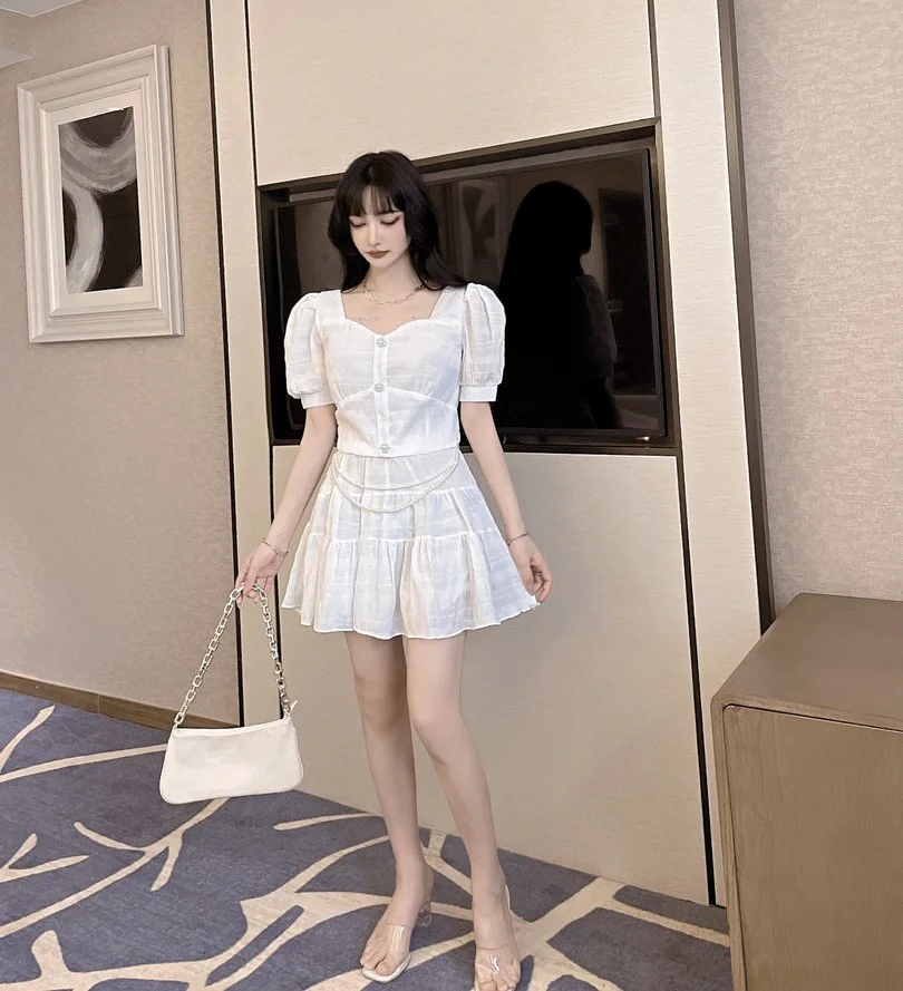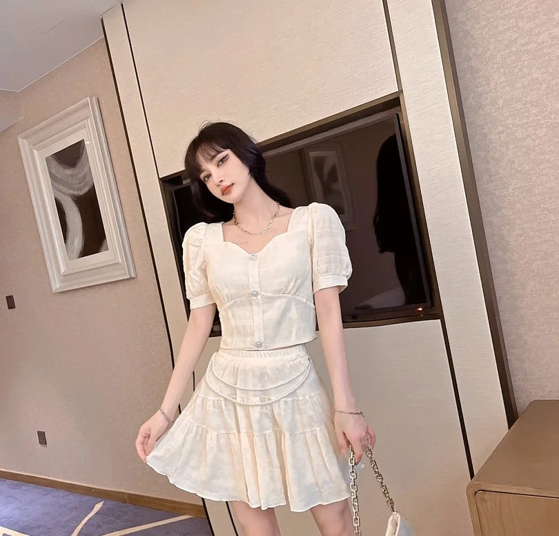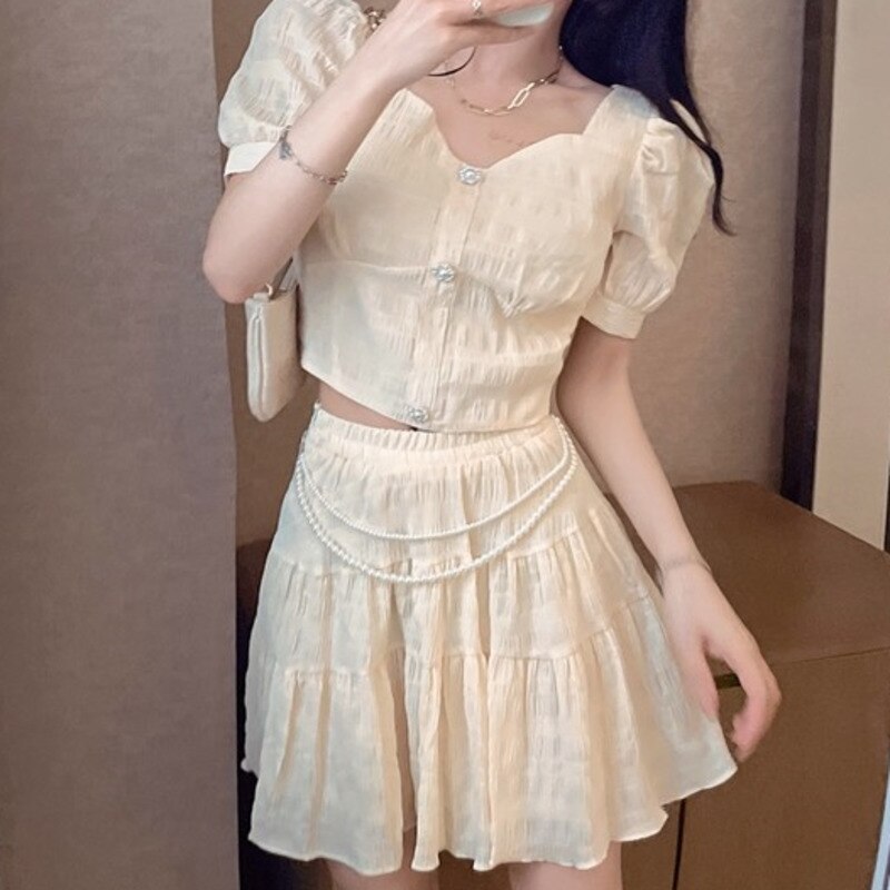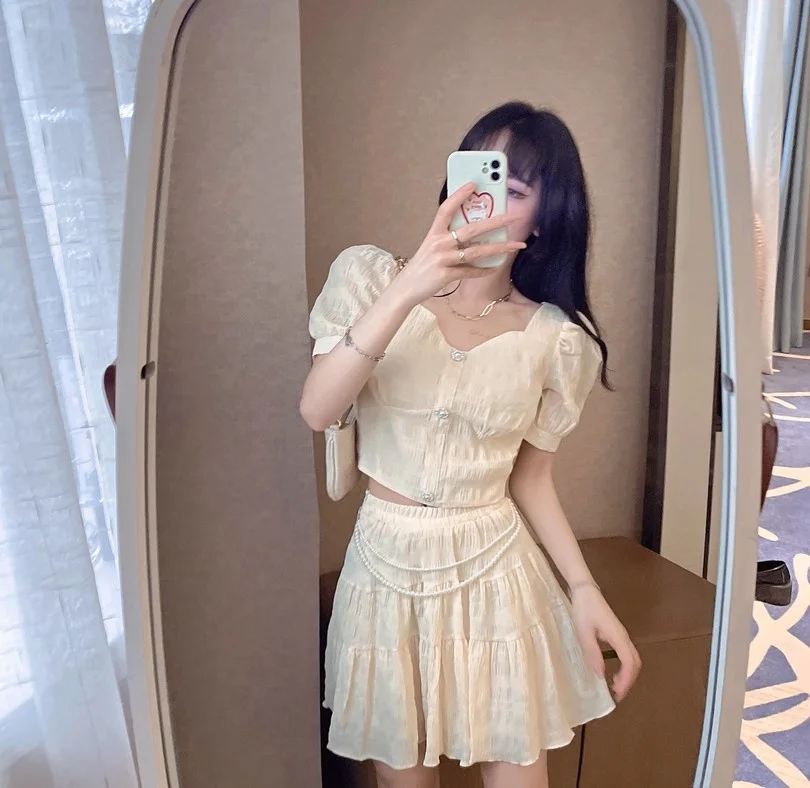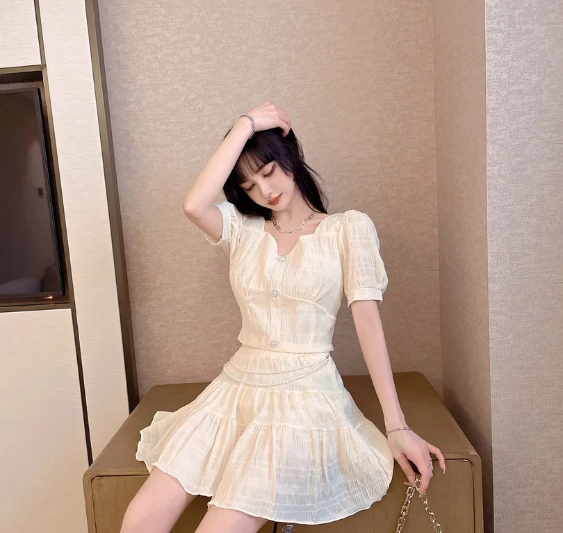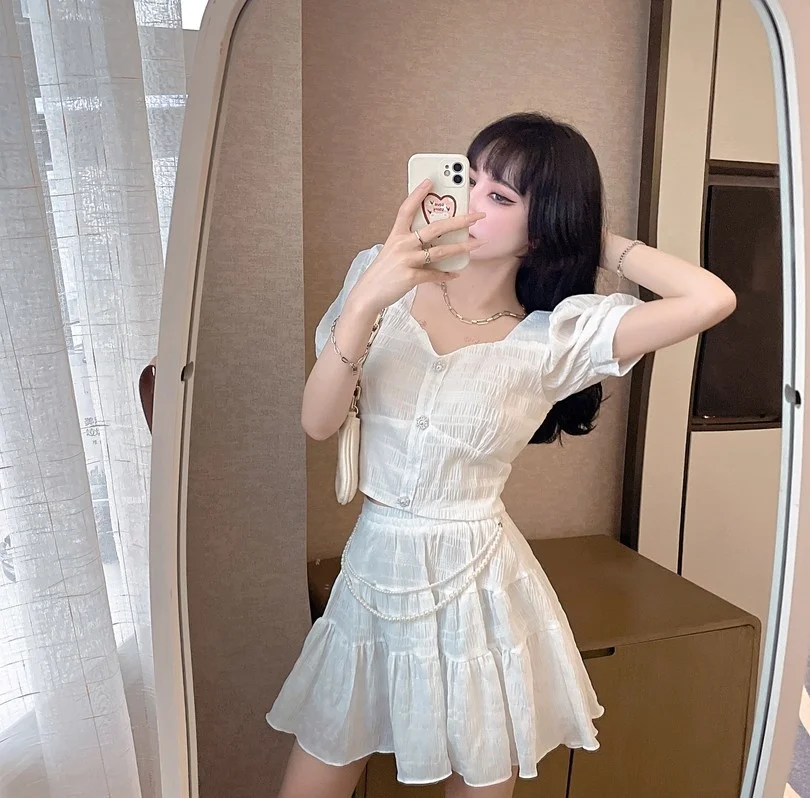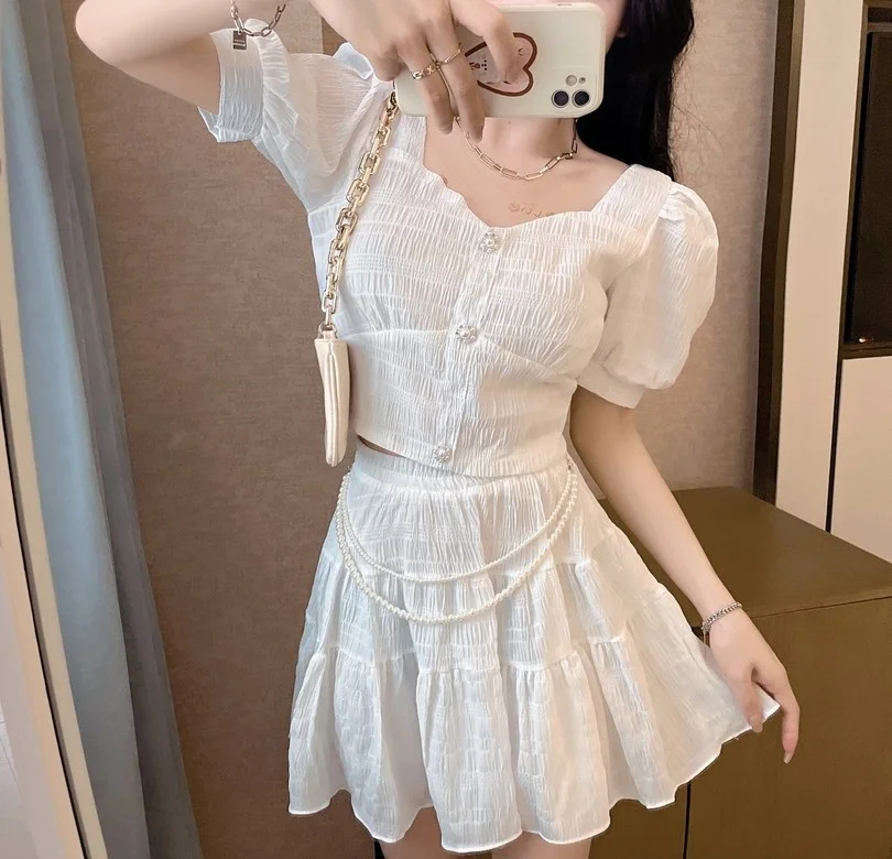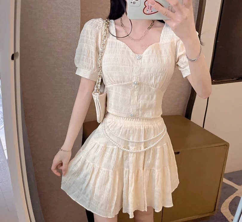 2021 Summer Fashion Sweet Short Short Sleeve Crop Top+ Elastic Pleated Mini Skirts Fried Street Wild 2 Piece Sets Womens Outfits