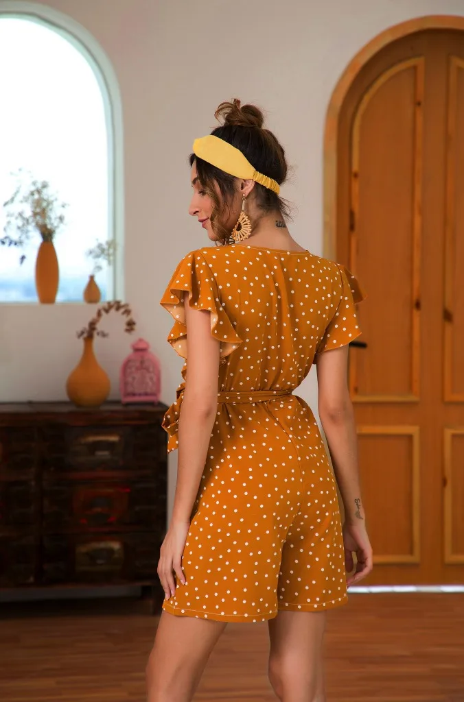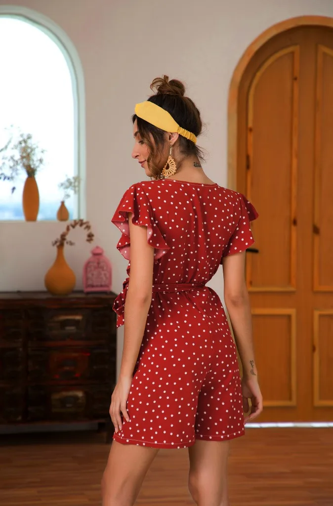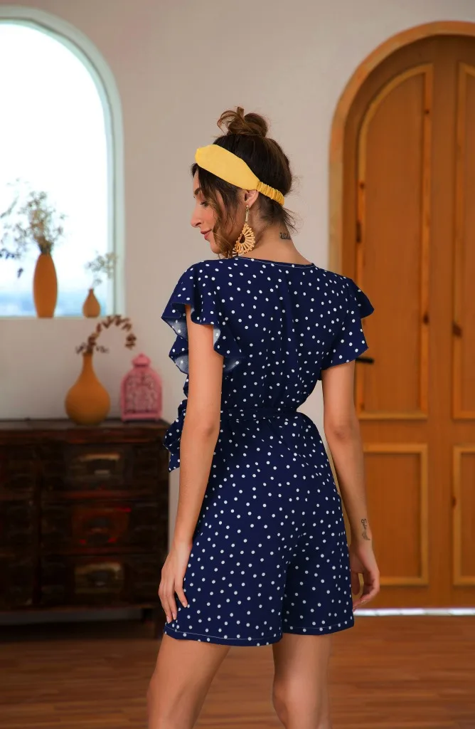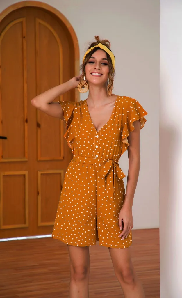 2021 Summer New Women's Fashion Casual Polka Dot Deep V Neck Ruffles Buttons Sleeveless Empire Lace Up Playsuits Ladies Skinny