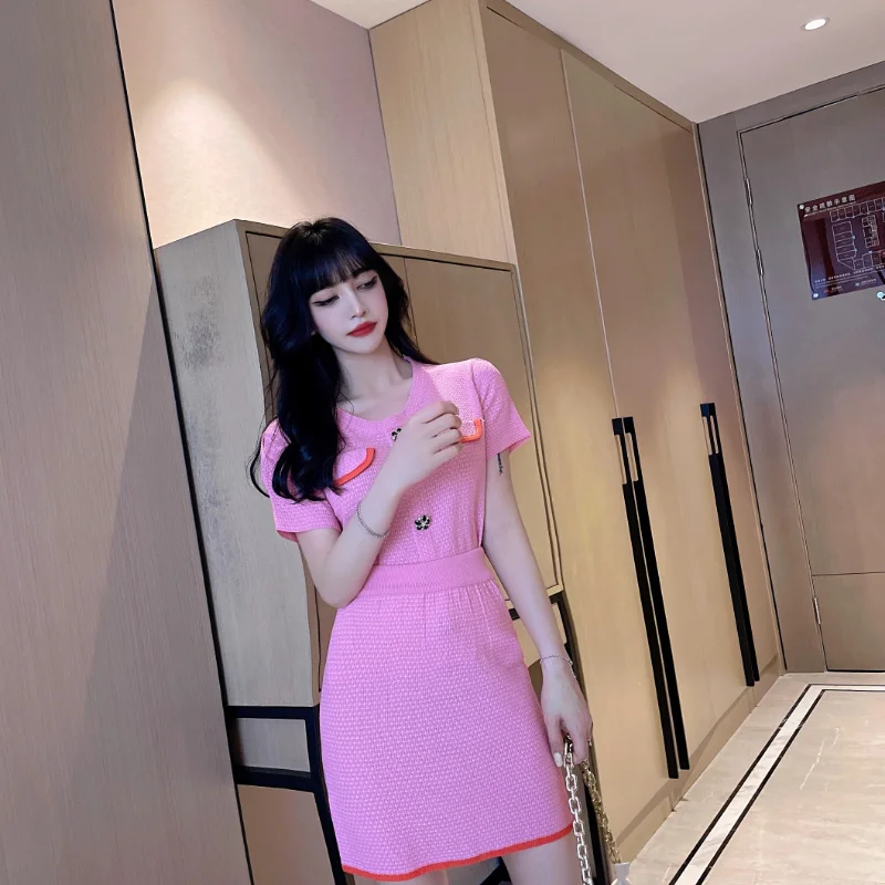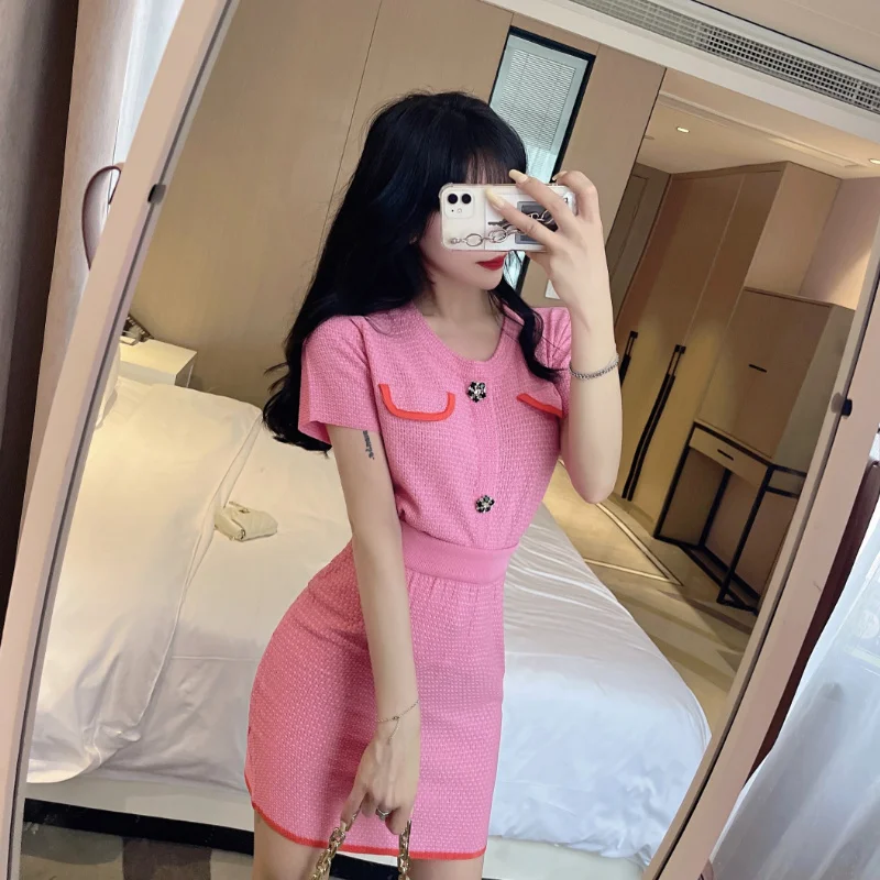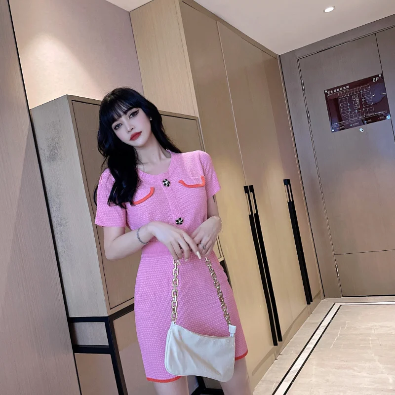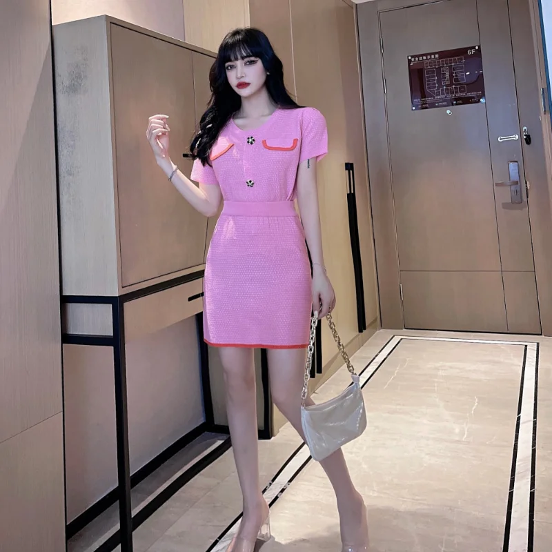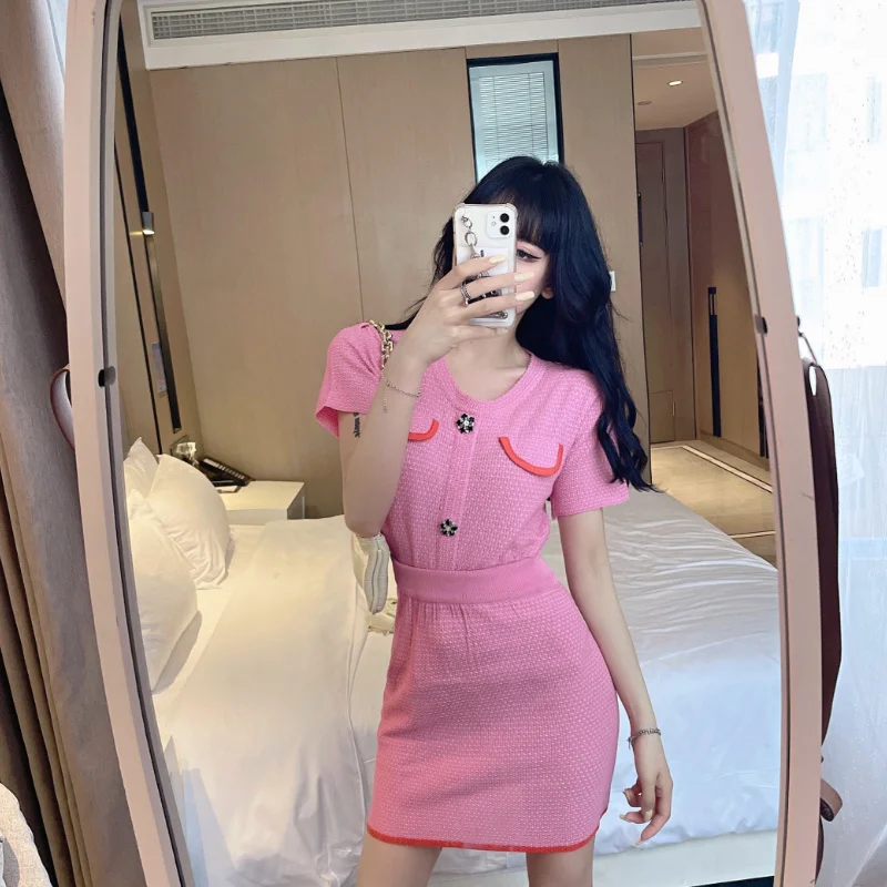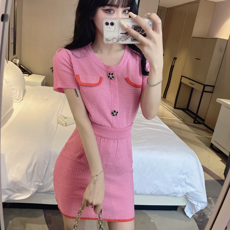 2021 Summer Sweet Temperament Knit Two Piece Sets Short-sleeved Top + Slim Bag Hip Skirt Casual Skirts Suits Conjuntos De Mujer