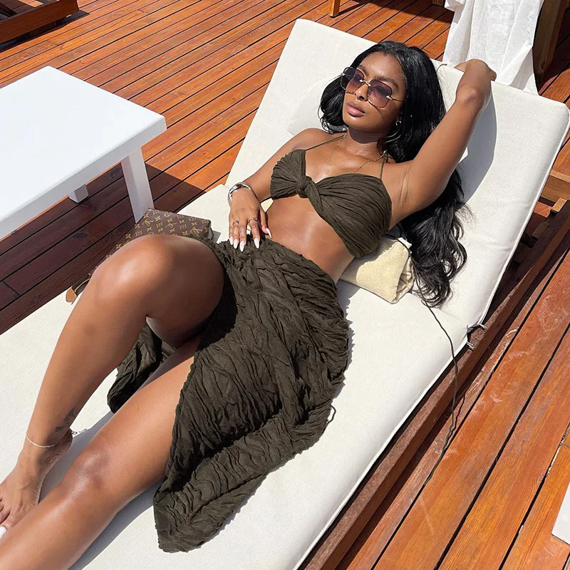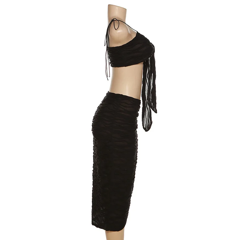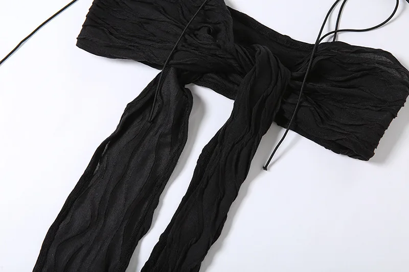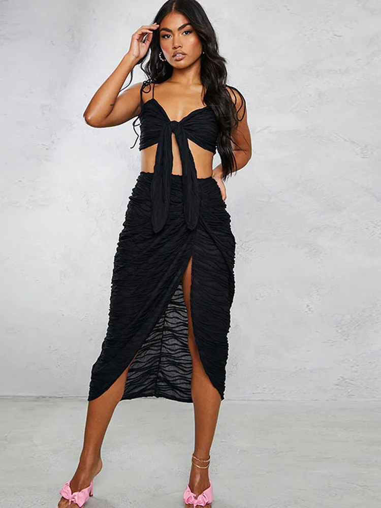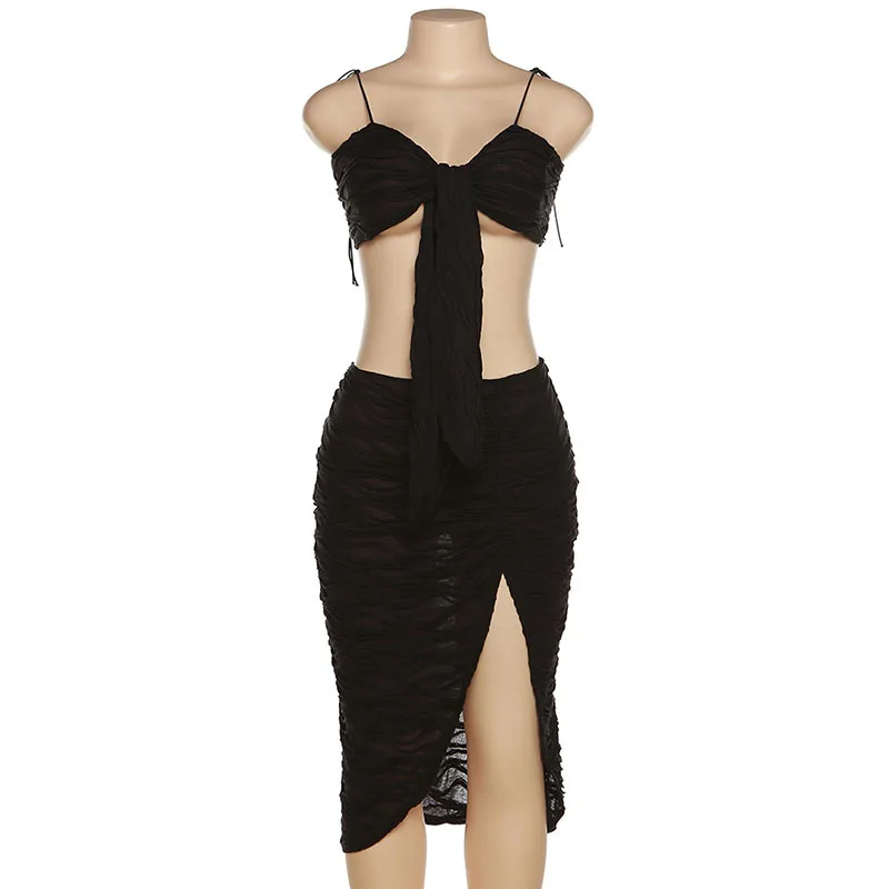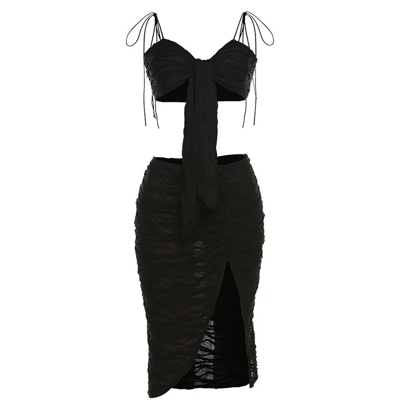 2022 Summer Elegant Black Folds Bandage Sexy Slit 2 Piece Skirt Sets Women Fashion Outfits Dress Club Party Sets Top Matching