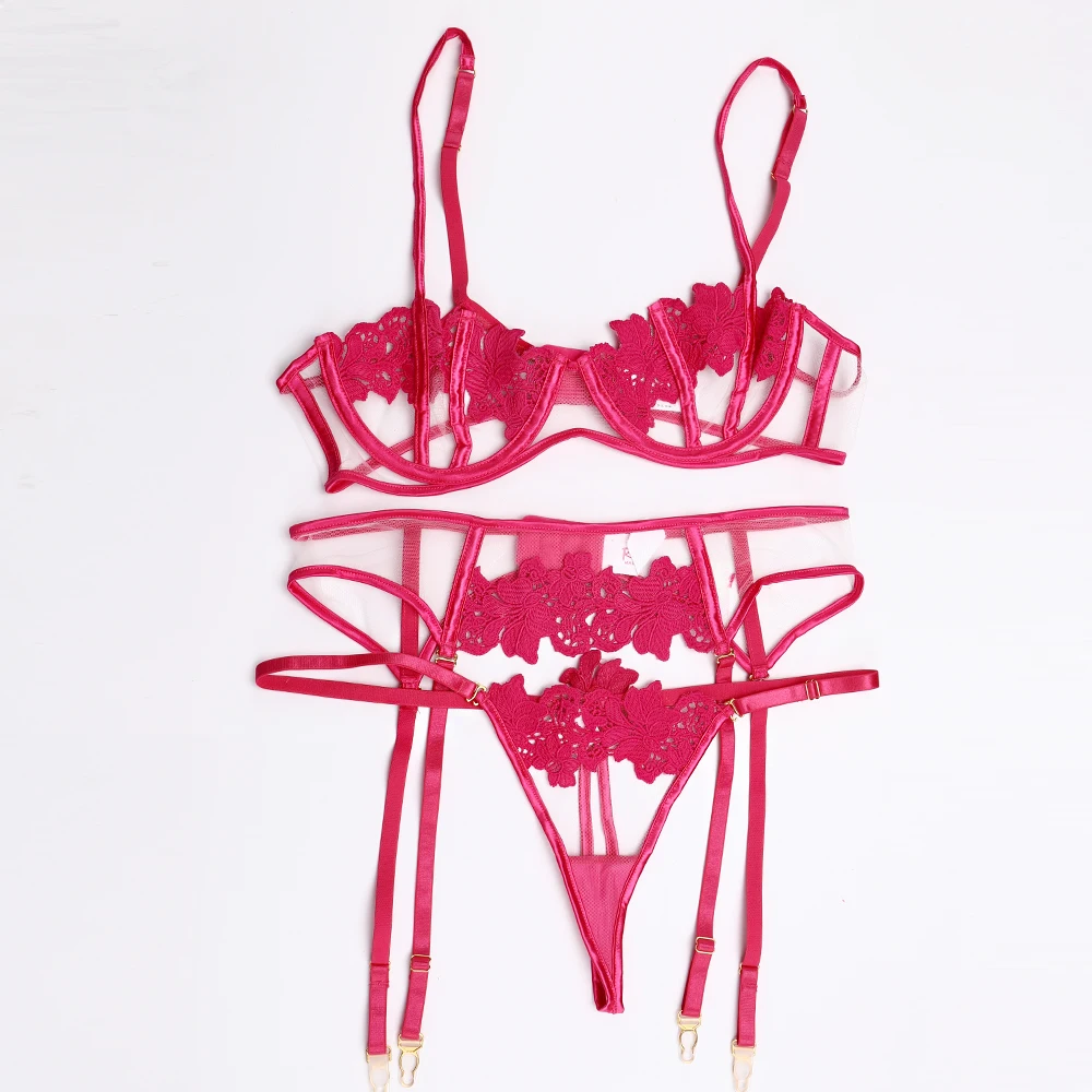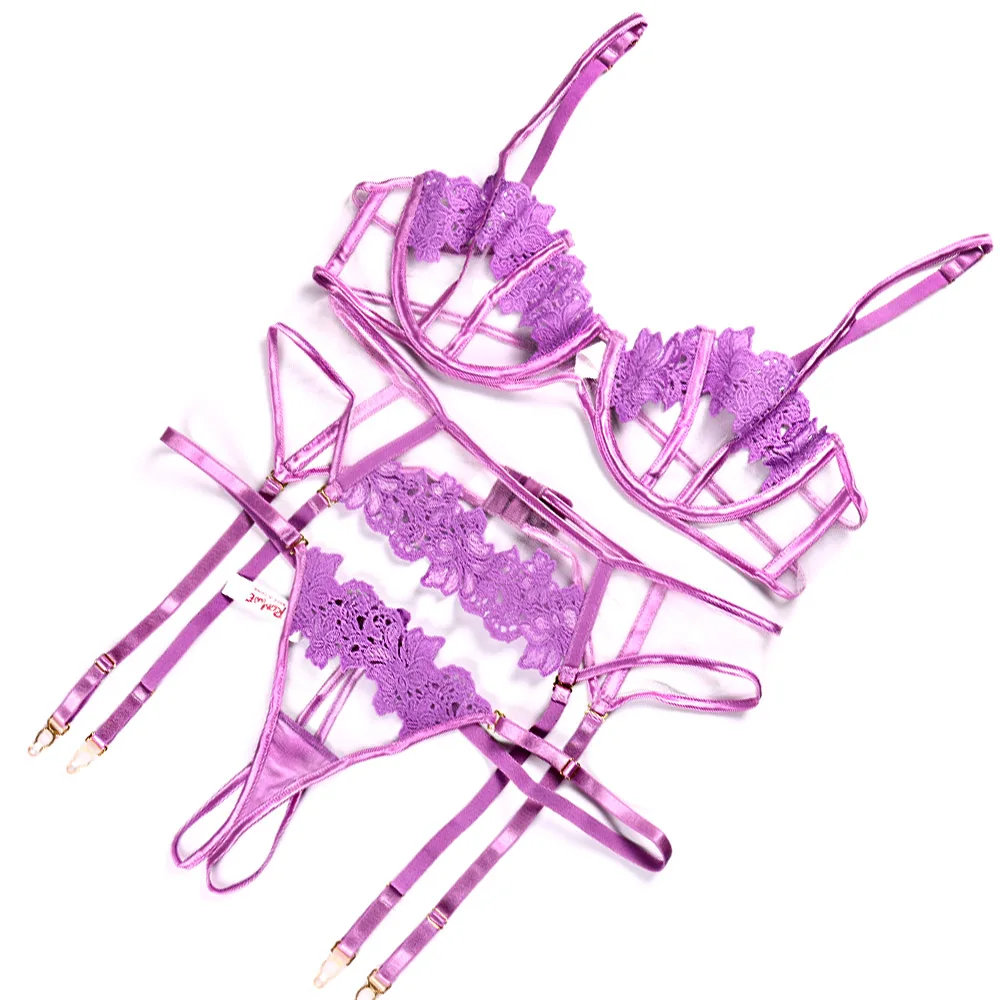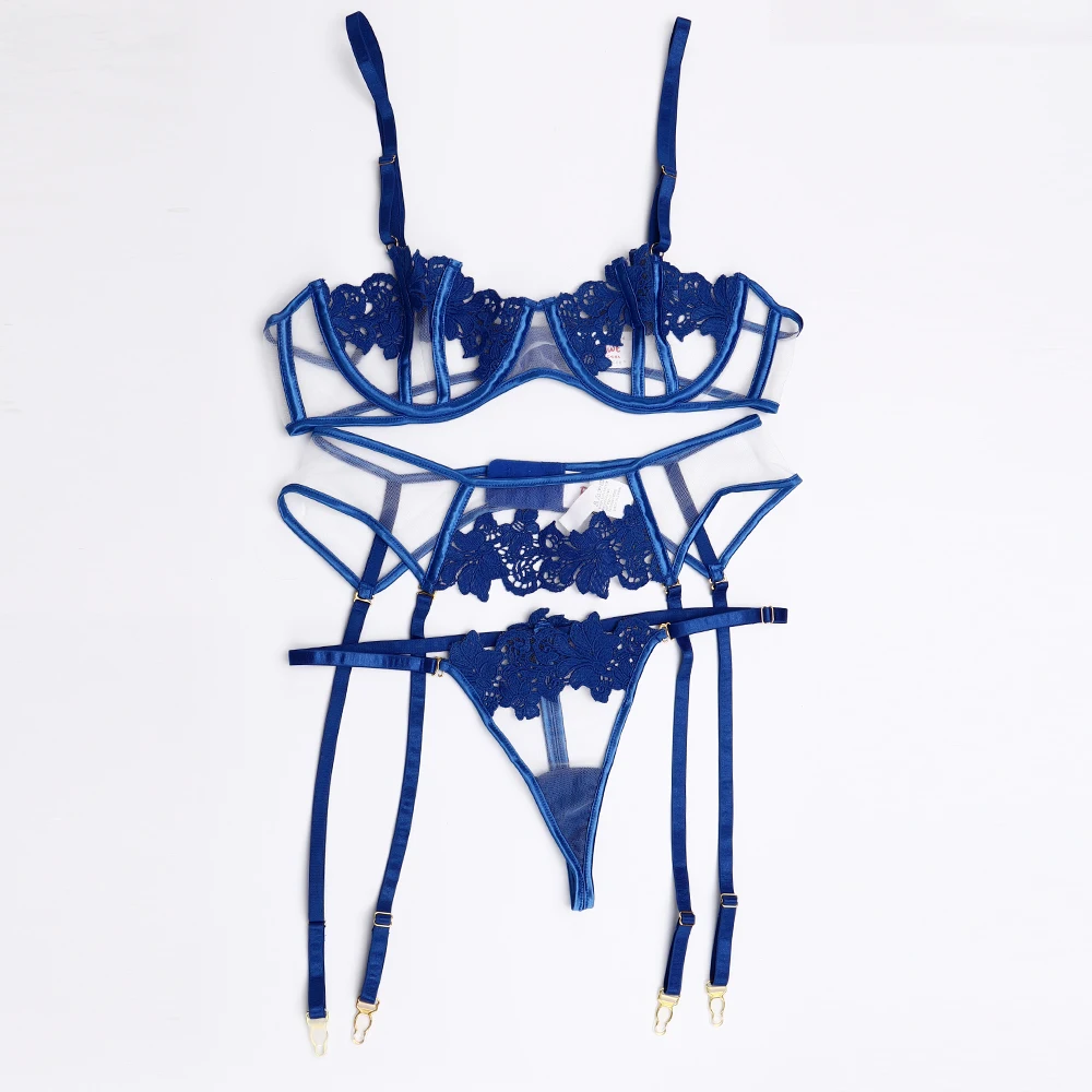 3 Pieces Lace Brief Sets Women Sexy Embroider Lingerie Underwear See-Through Erotic Garters Sensual Lingerie Exotic Underwire