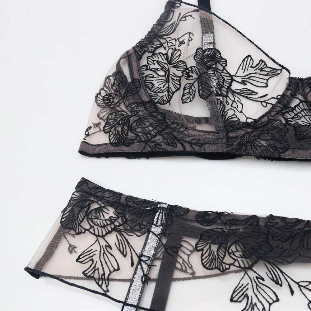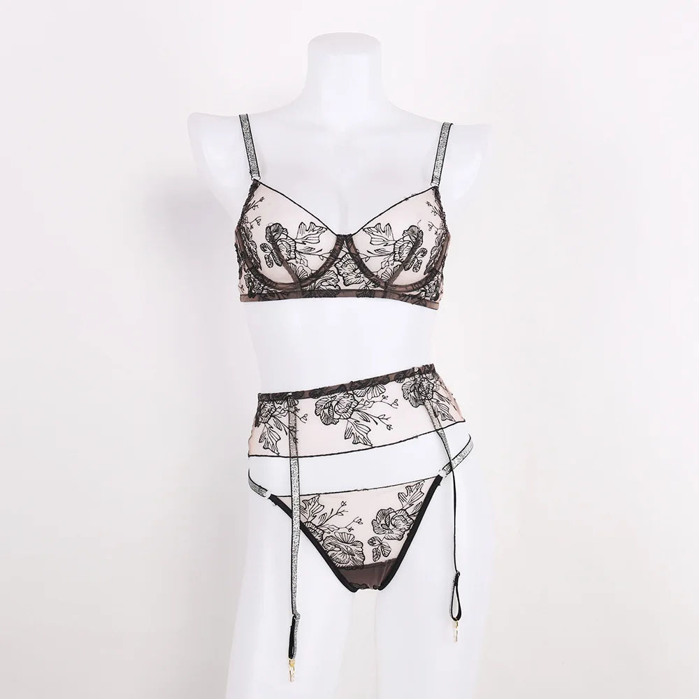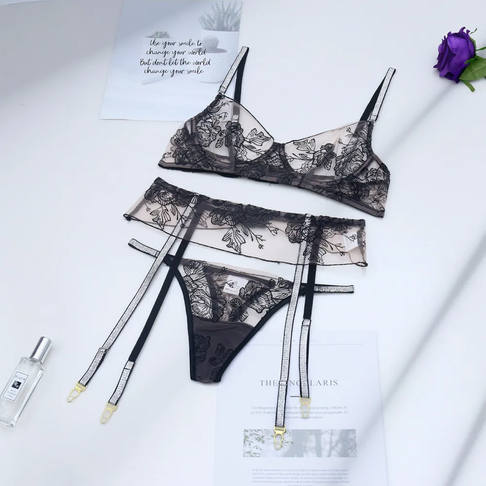 3 Pieces Set Erotic Lingerie Set Woman Sensual Embroidery See-Through Brief Sets Fancy Garters Langerie Push Up Bra Outfit Set