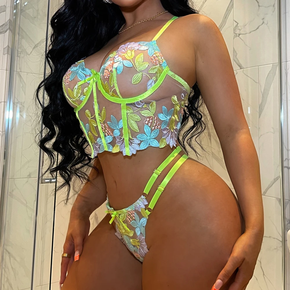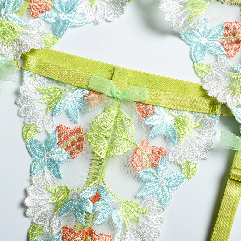 3 Pieces Set Sexy Lingerie Floral Embroidery Erotic Underwear Set Lace Perspective Push up Bra and Brief Sets Garters and Thongs