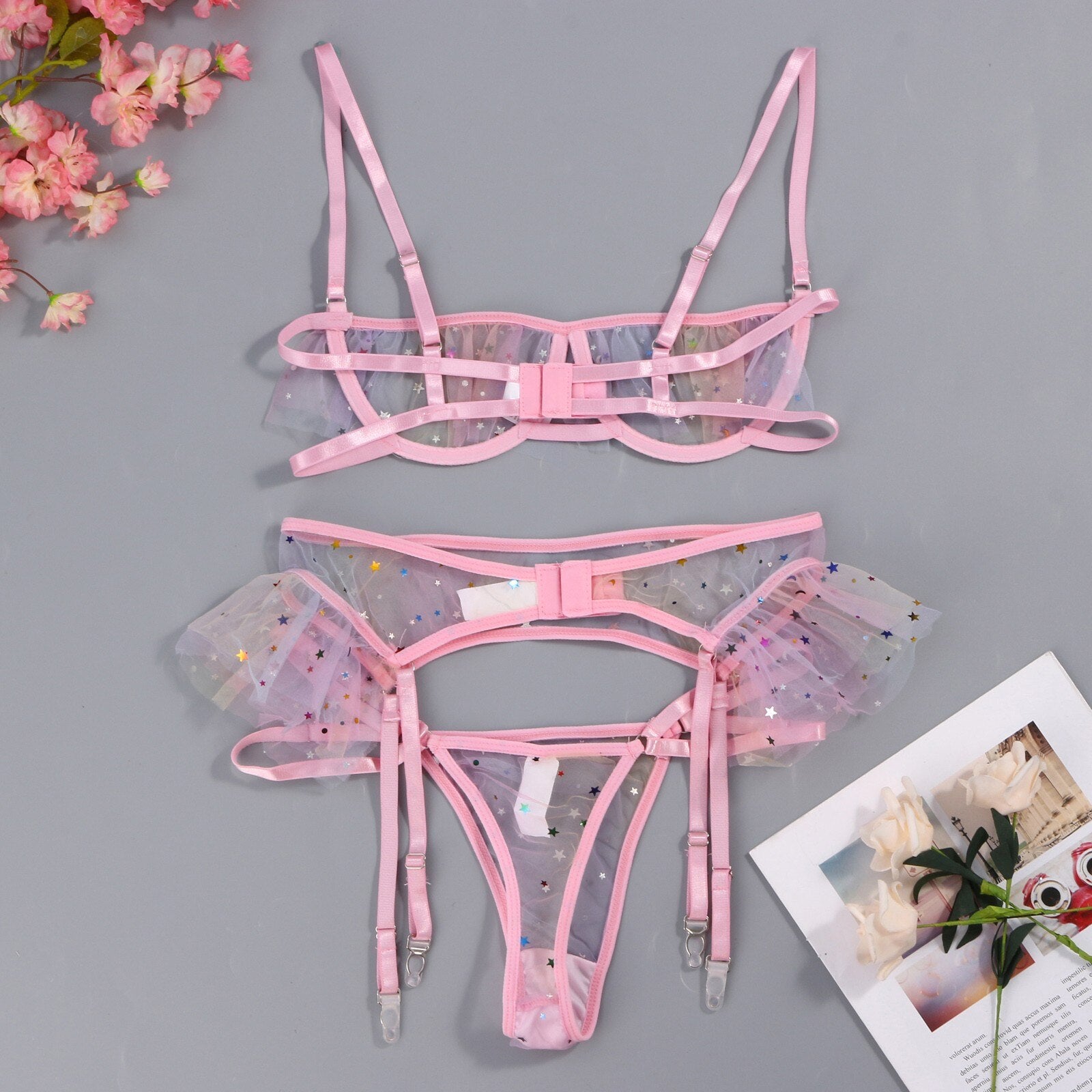 Colorful Printed Star Moon Embroidery Thong Temptation Underwear Garter Belt