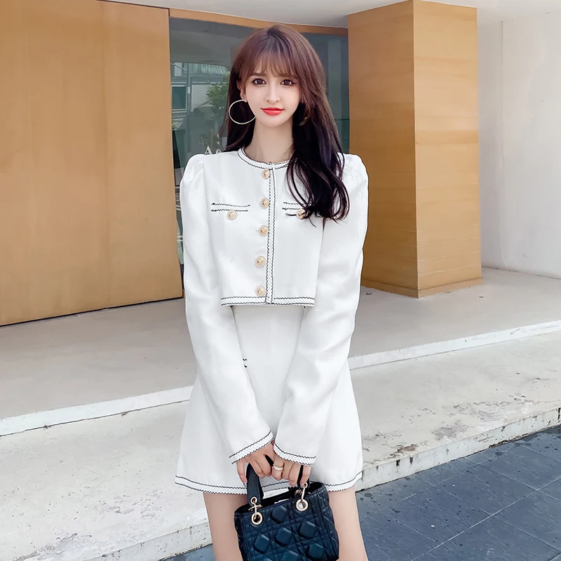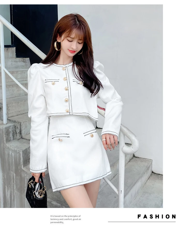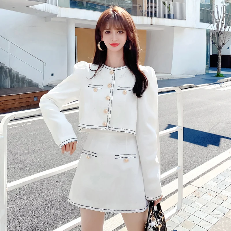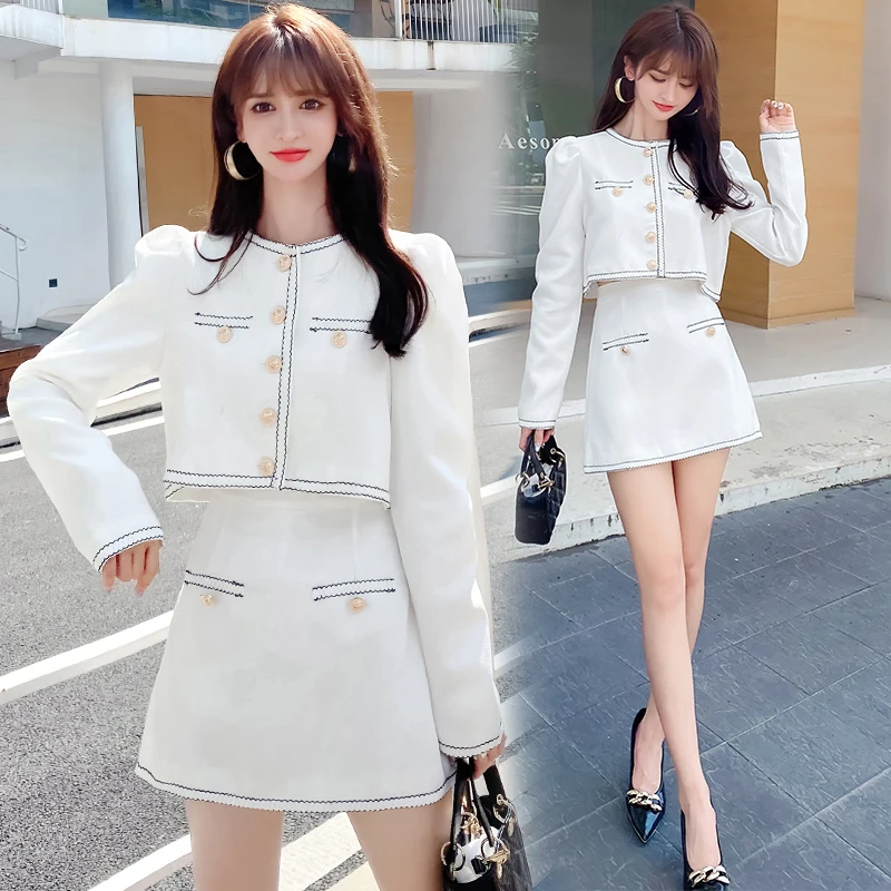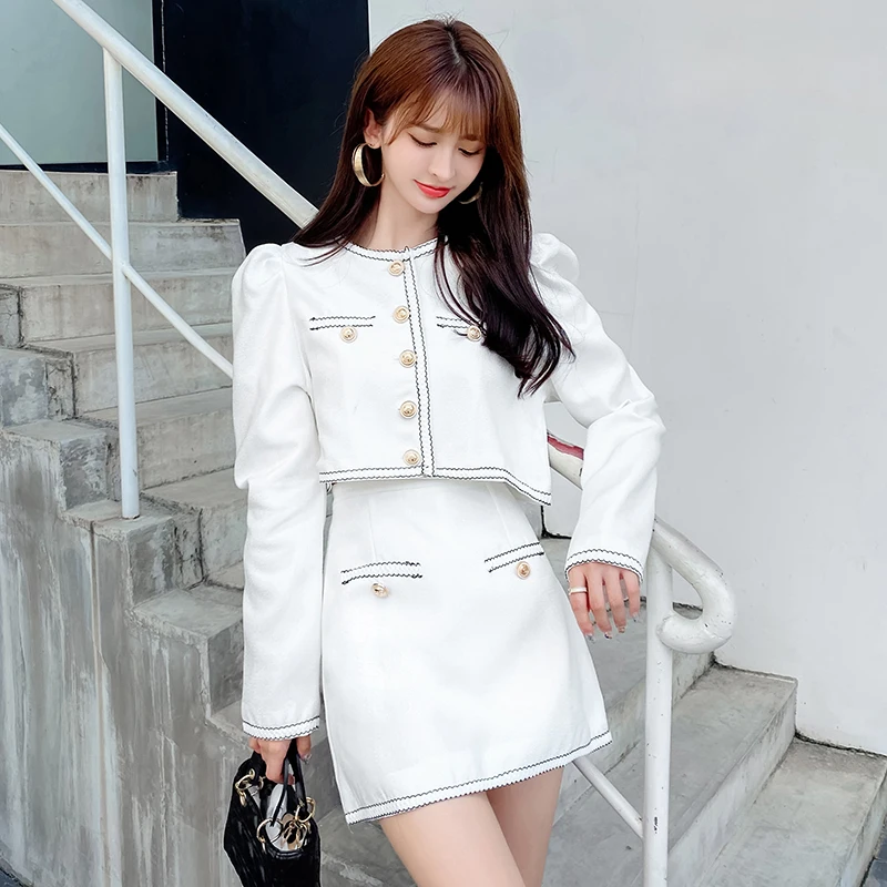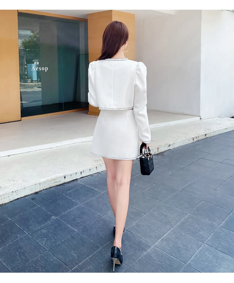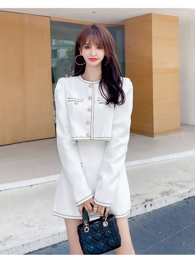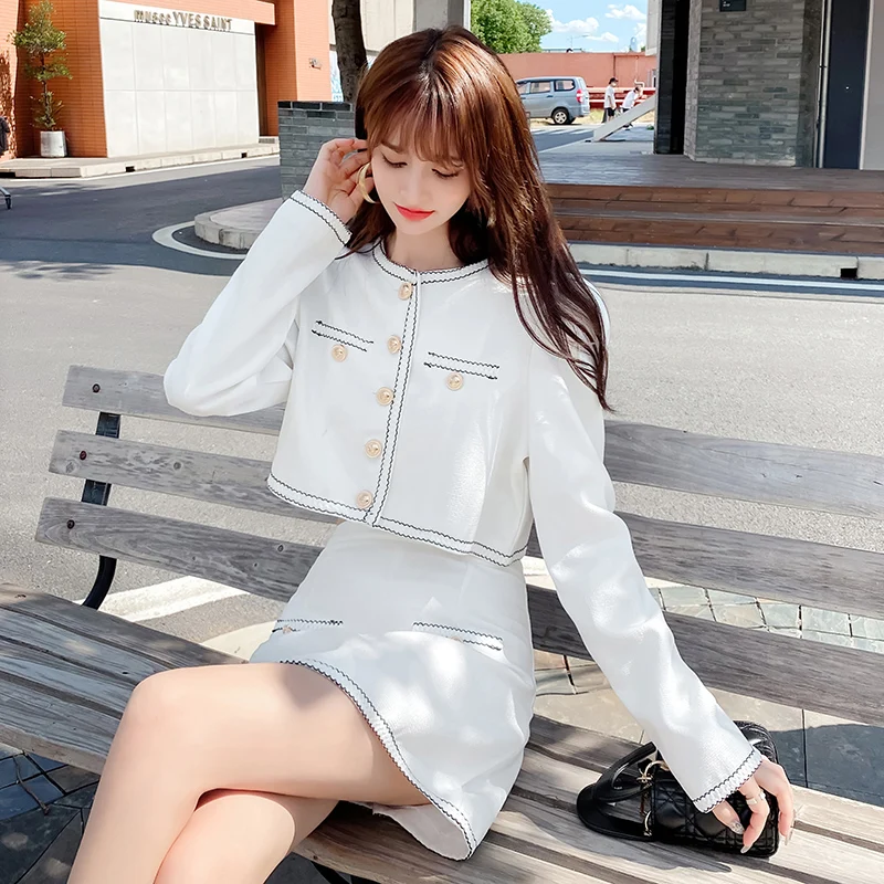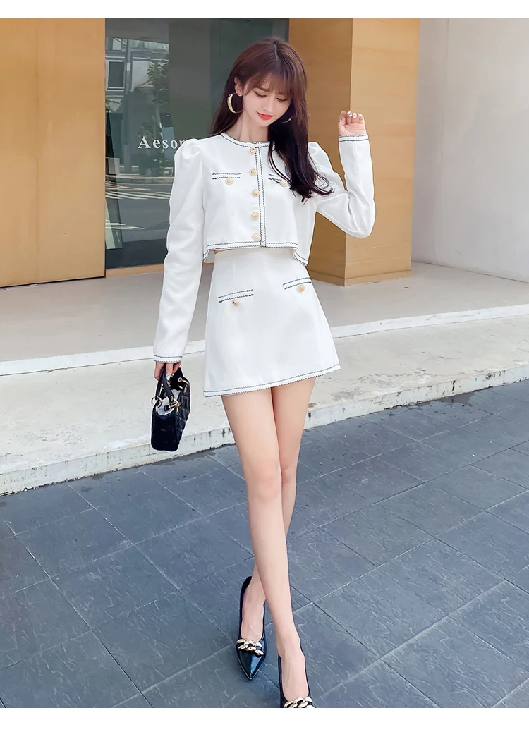 Elegant Lady Two Piece Set Autumn Small Fragrance Suit Button Round Neck Crop Coat+Sexy Slim Bag Hip Skirt Short Sets Casual
