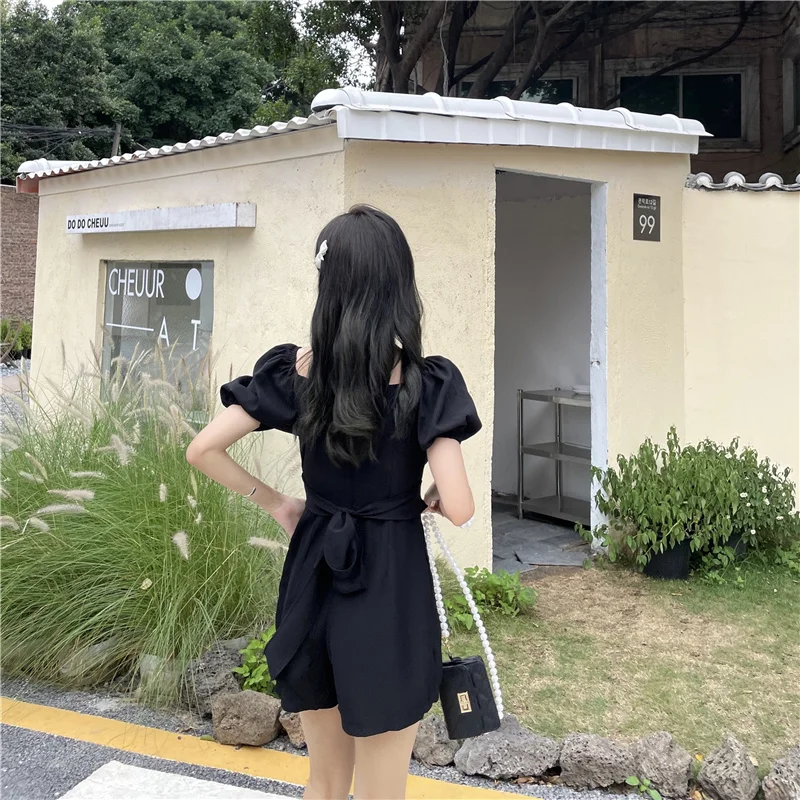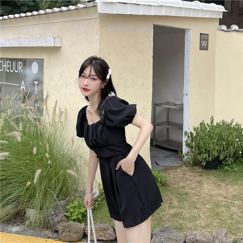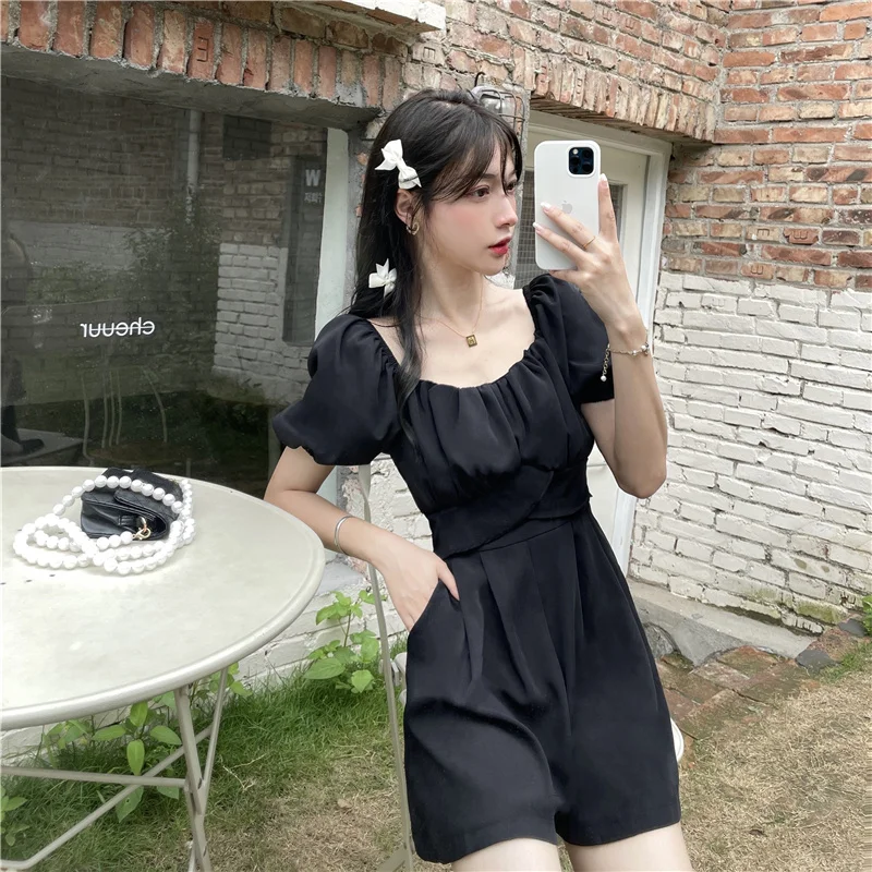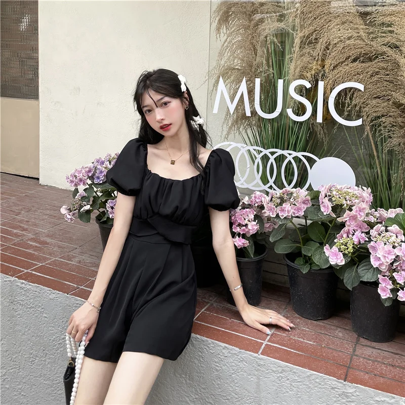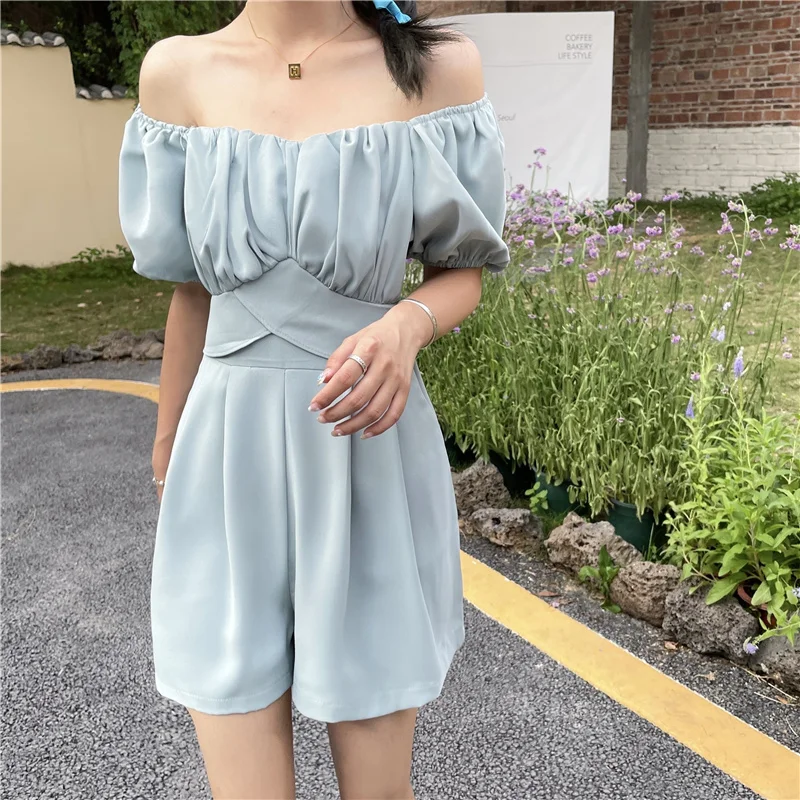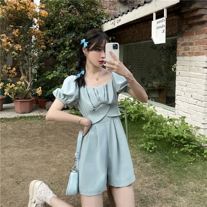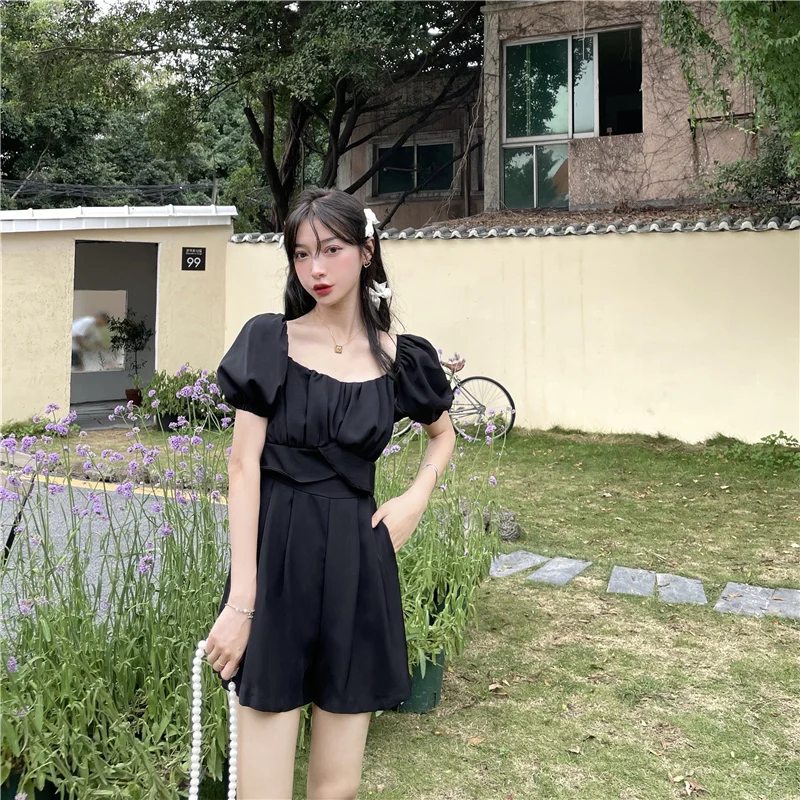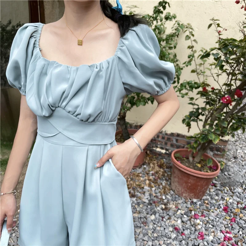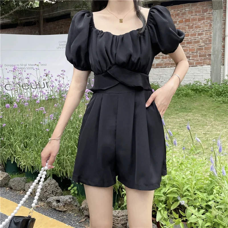 High Quality Puff Sleeve Design Pleated Bandage Slim Waist Wide-leg Shorts Jumpsuit Solid Casual Fashion Playsuits Female Romper