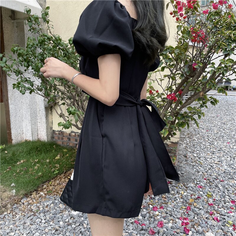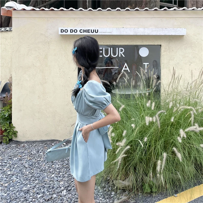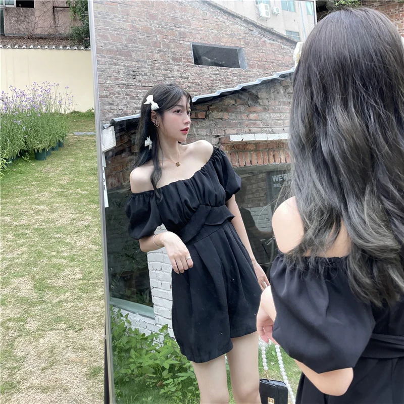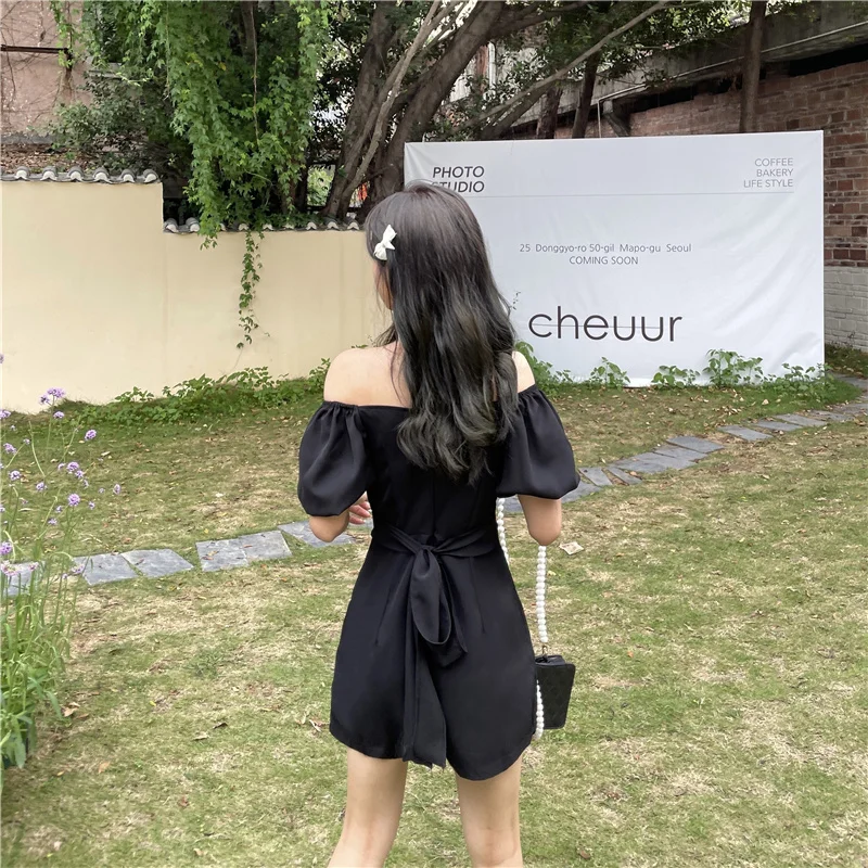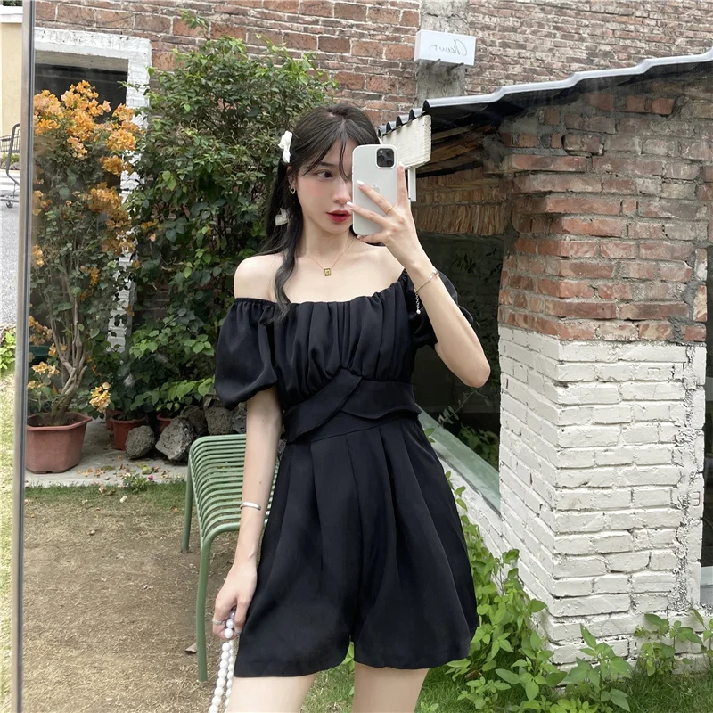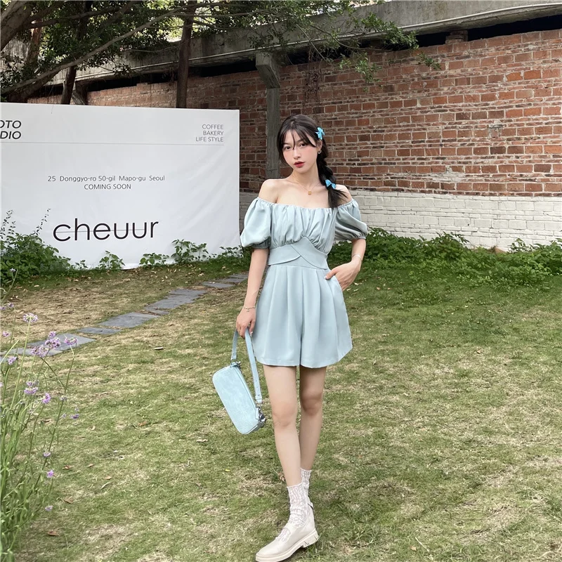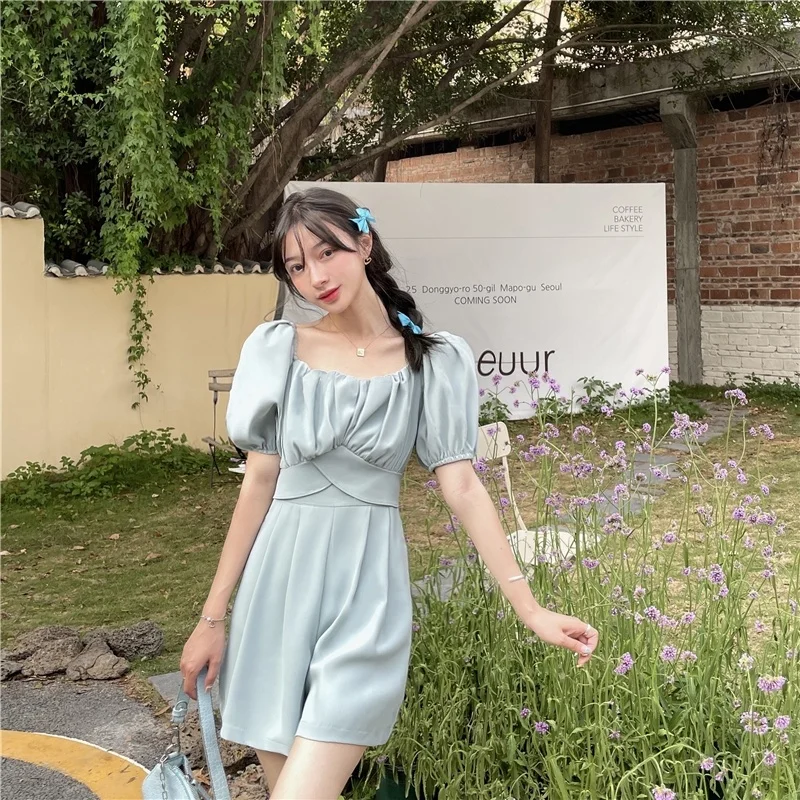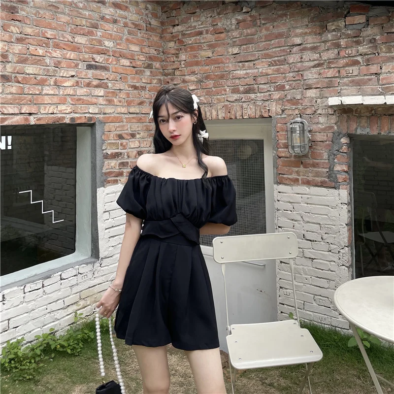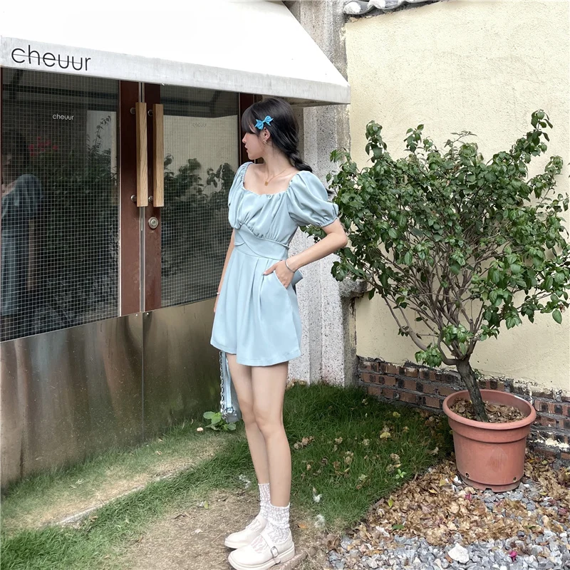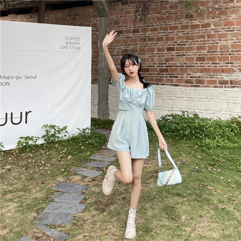 High Quality Puff Sleeve Design Pleated Bandage Slim Waist Wide-leg Shorts Jumpsuit Solid Casual Fashion Playsuits Female Romper