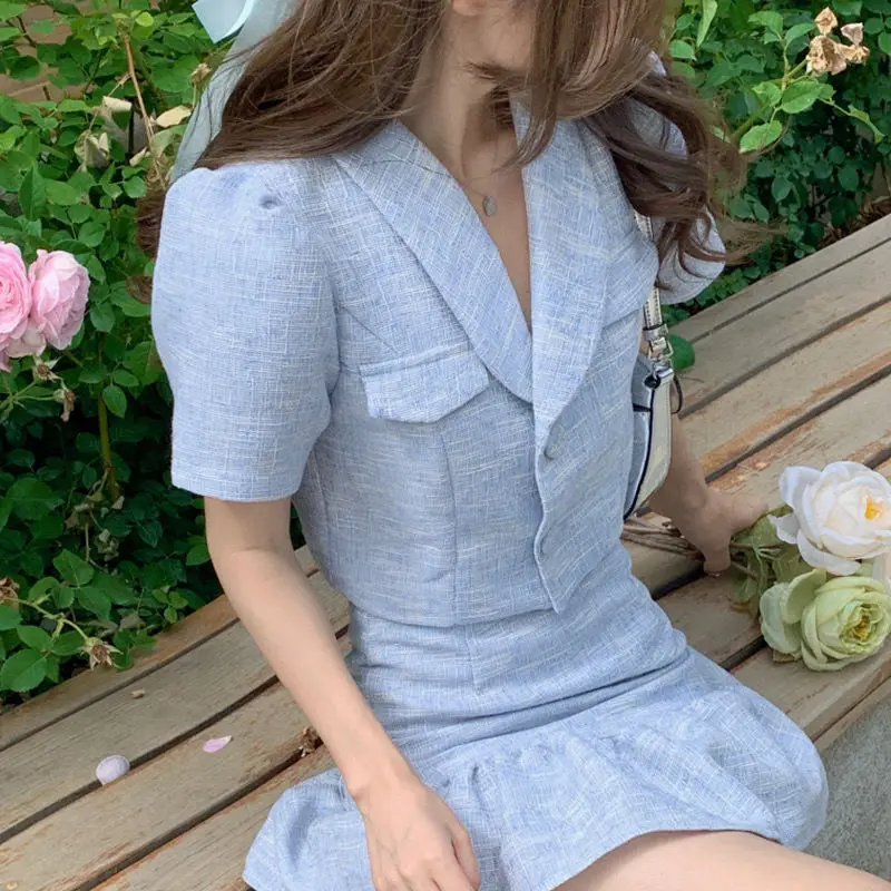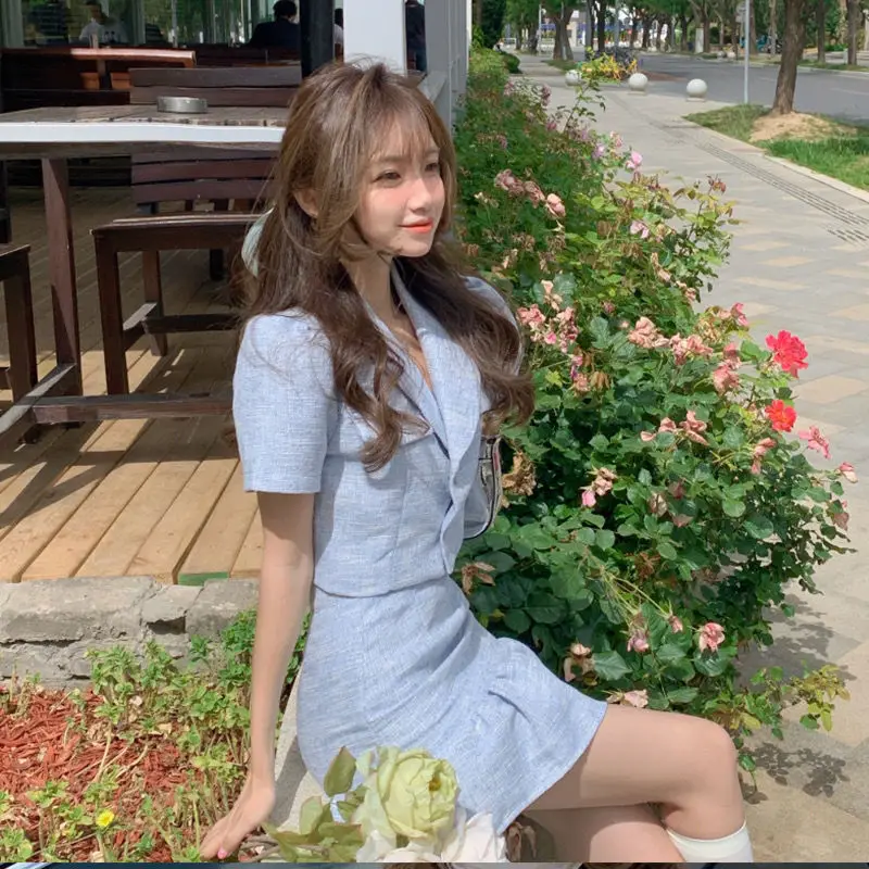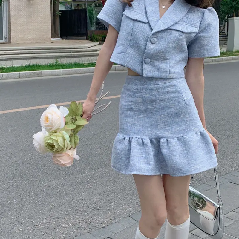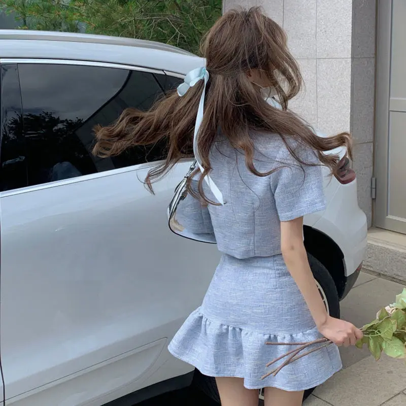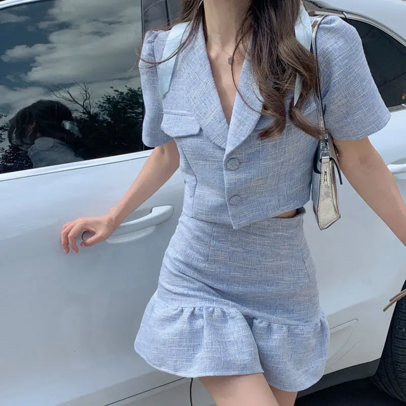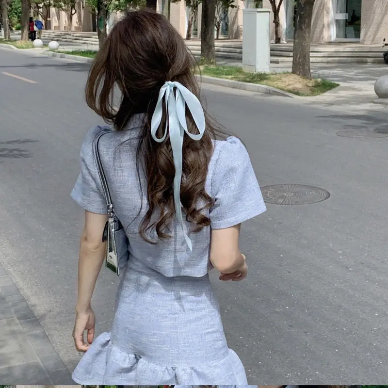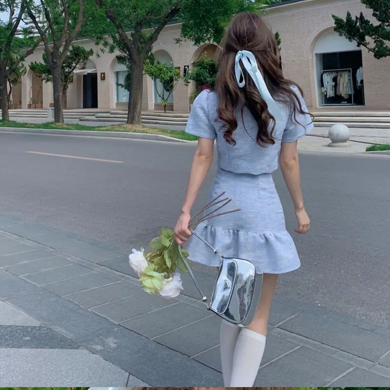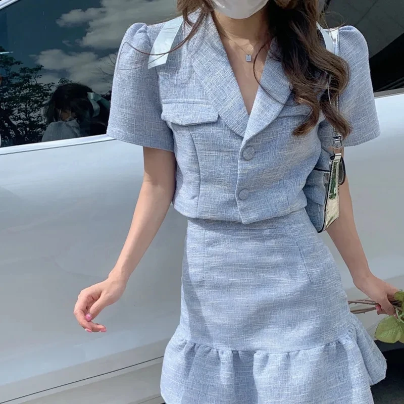 Ladies Suits Summer New Short Sleeve Shirt Female High Waist Skirt Blue Two-Piece Sets 4XL