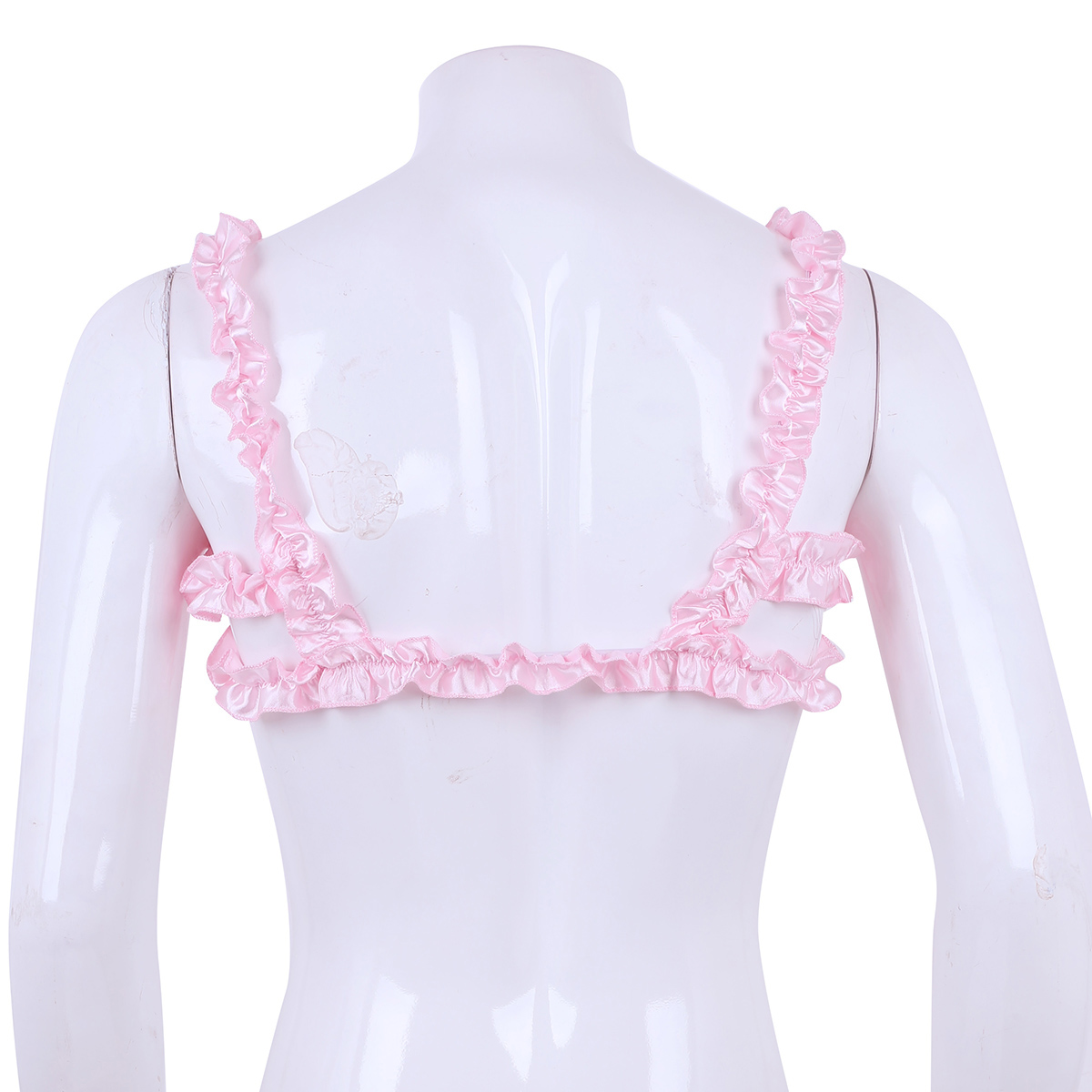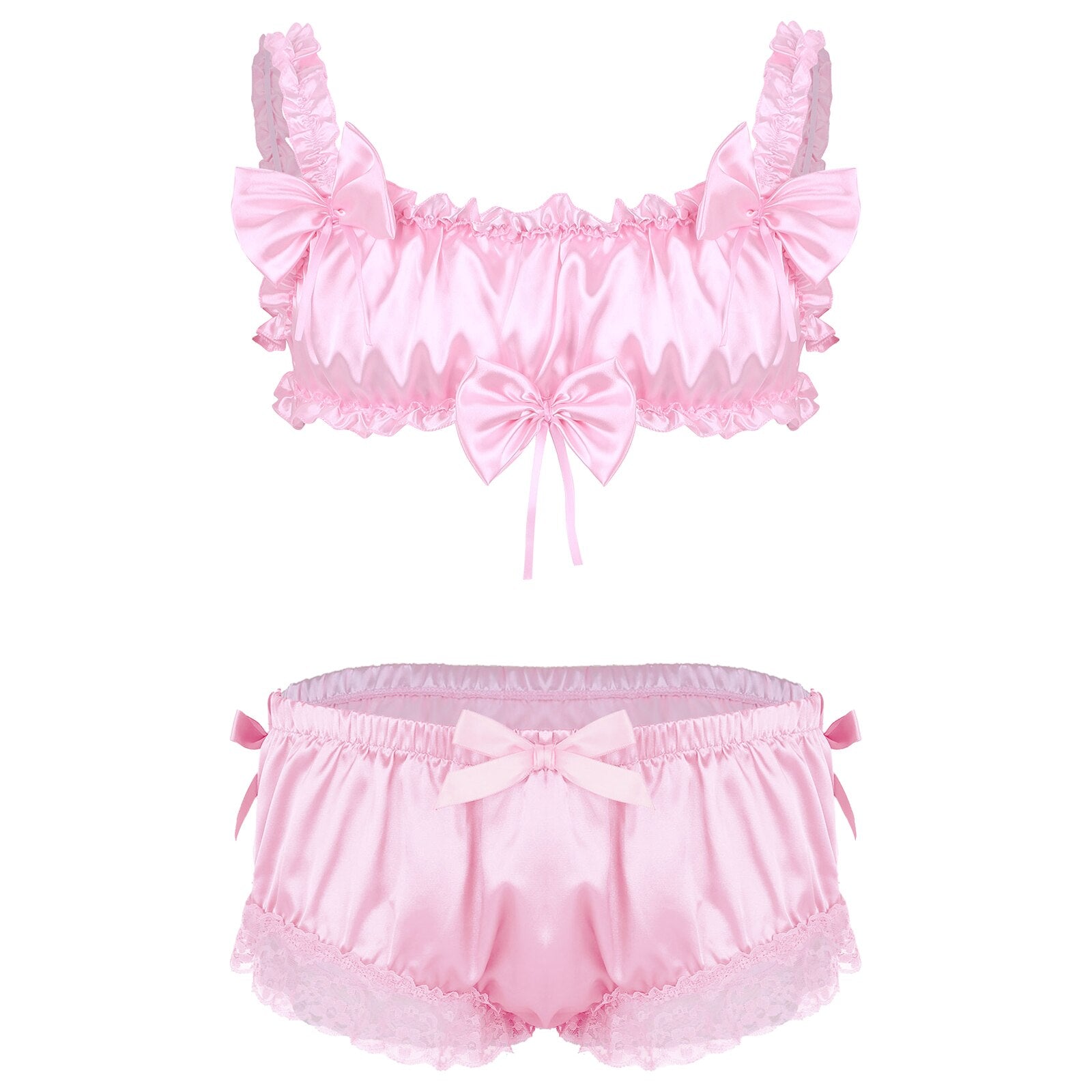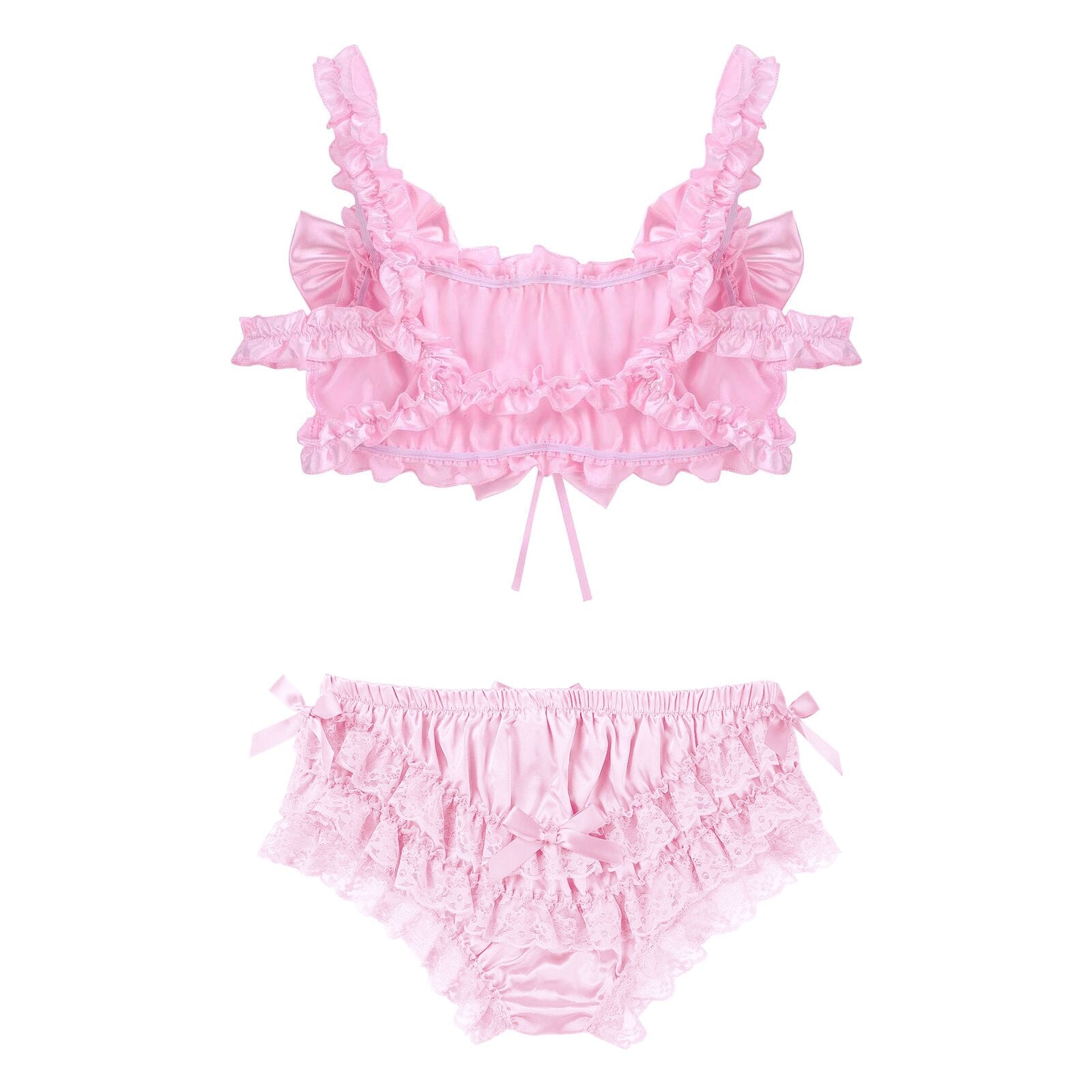 Men Sissy Lingerie Satin Frilly Bra Tops with Briefs.