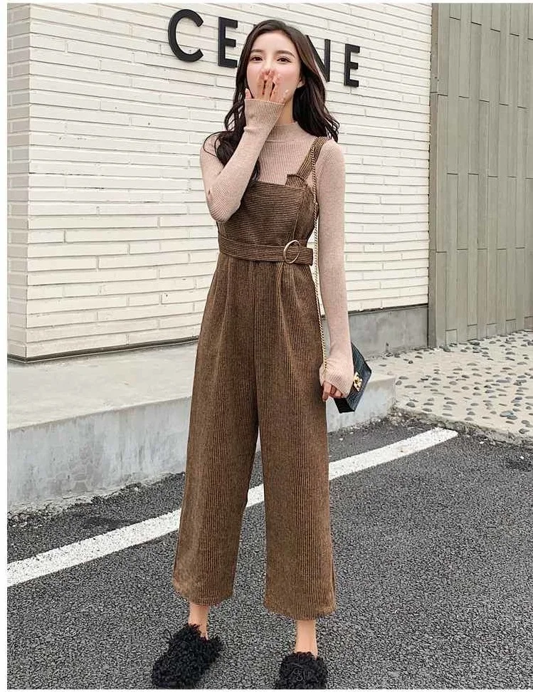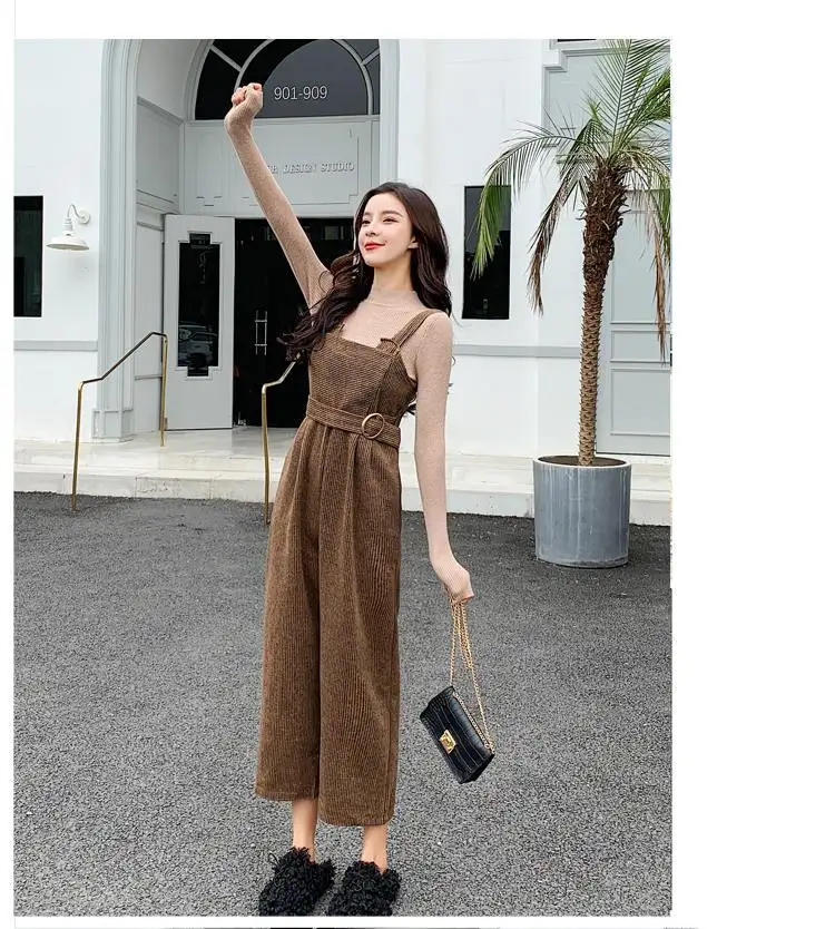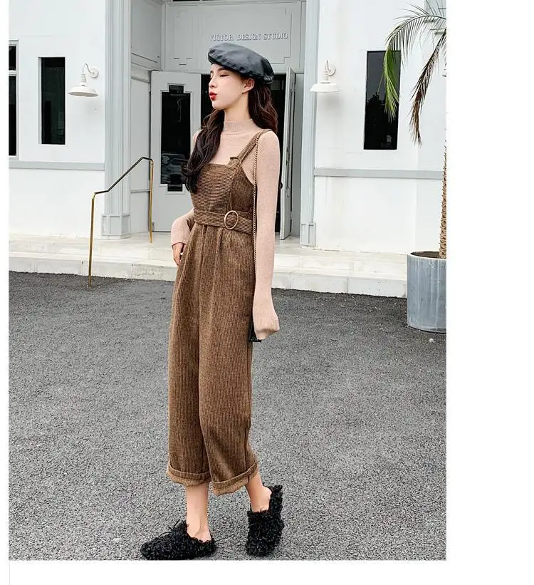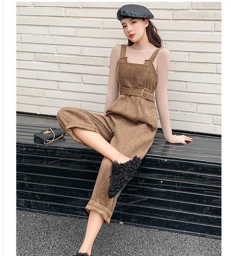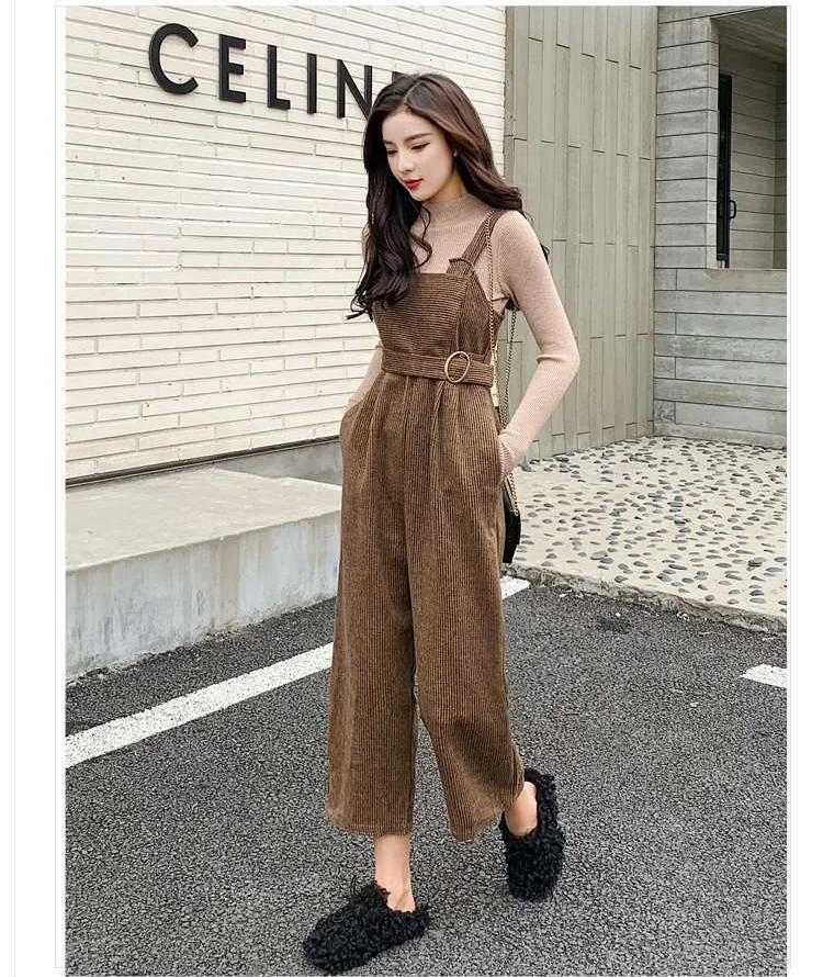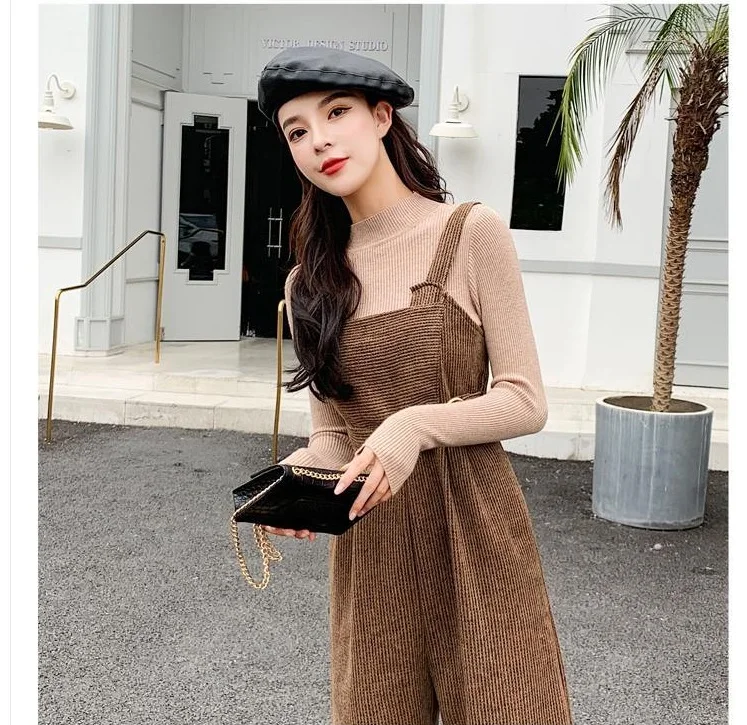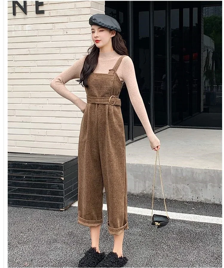 New Autumn Suits Women Loose Retro Corduroy Overalls + Knitted Round Neck Bottoming Sweater 2-Piece Sets Female