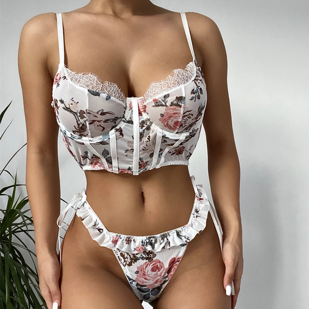 New Floral Sexy Lingerie Woman Underwear Set Ruffled Lace Ribbon Bra and Brief Sets Erotic Sensual Lingerie Female Underwear