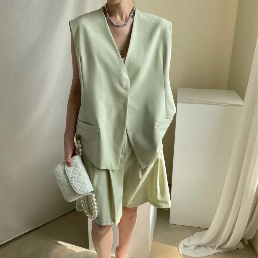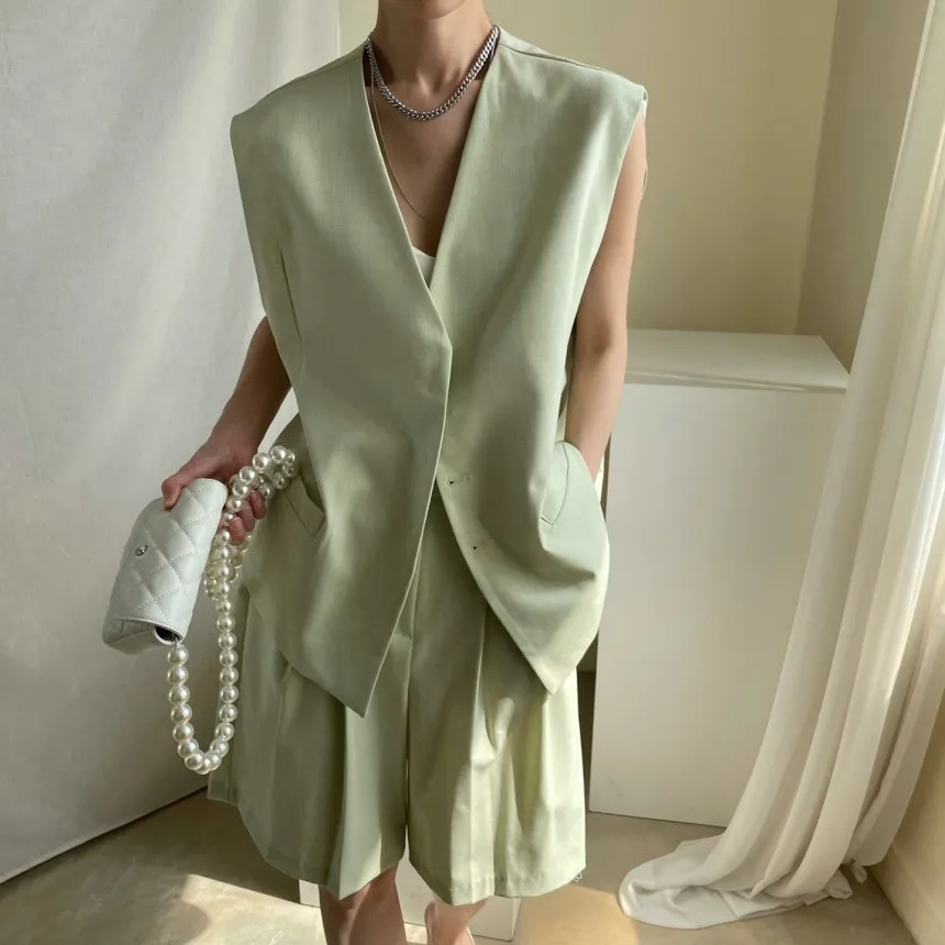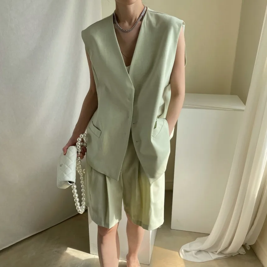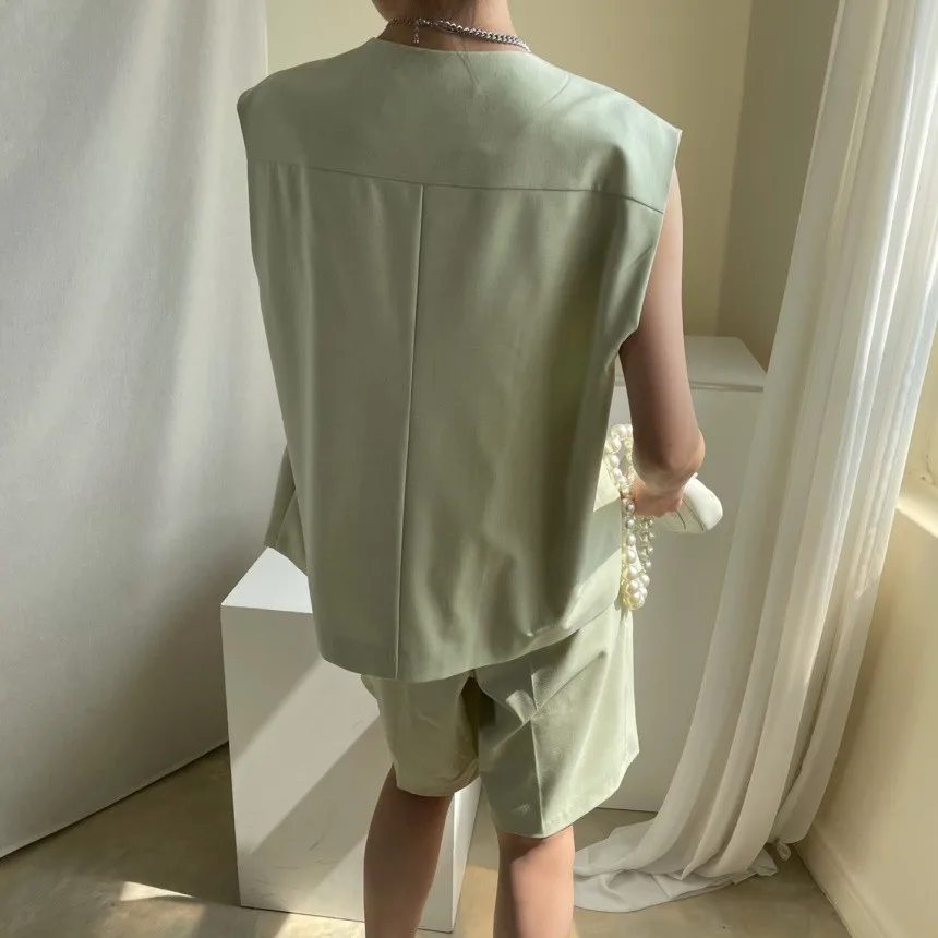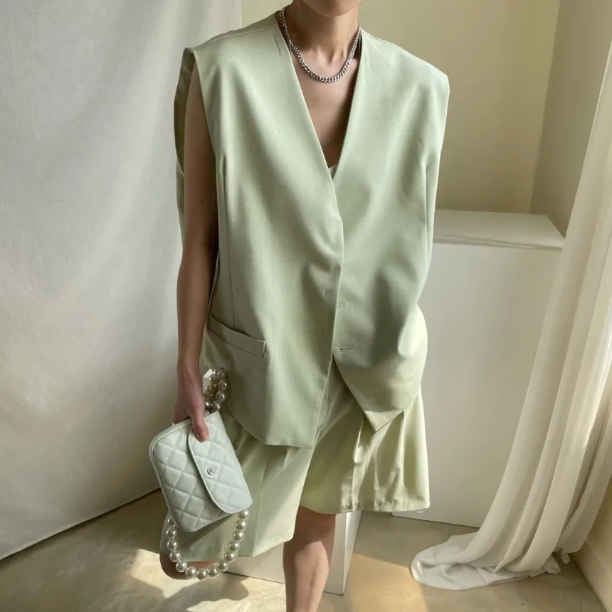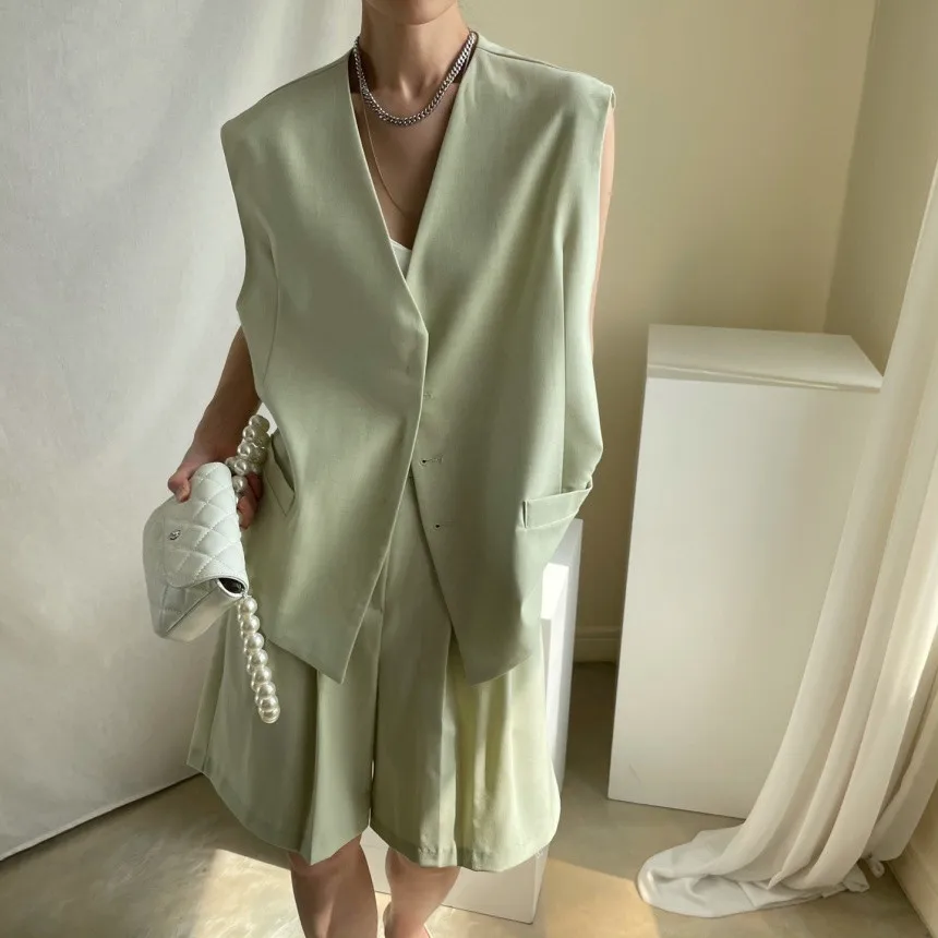 New Girls Spring Women Suits Sleeveless Vest High Waist Solid Shorts Womens Two Piece Suits Sell Separately Oversize