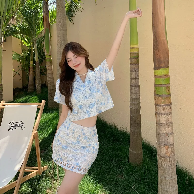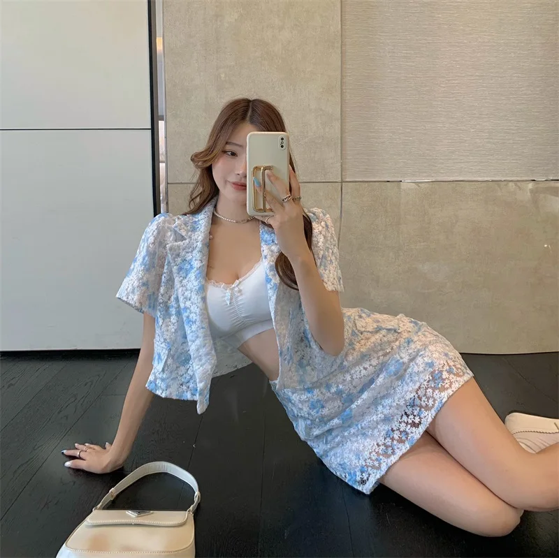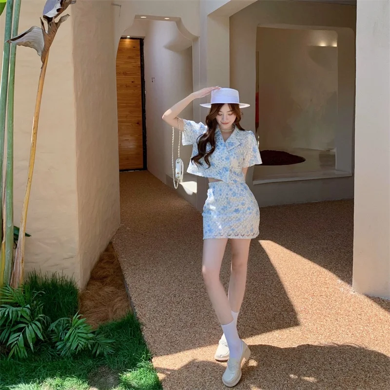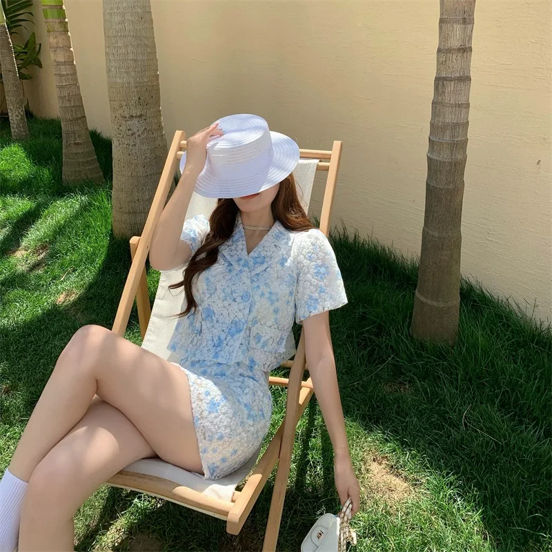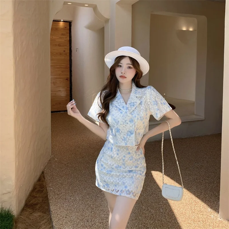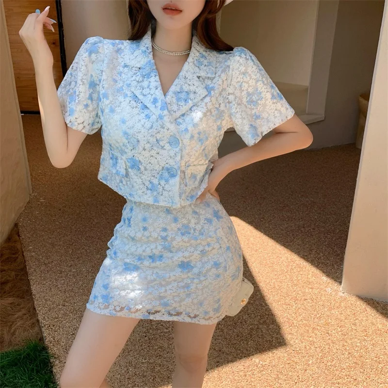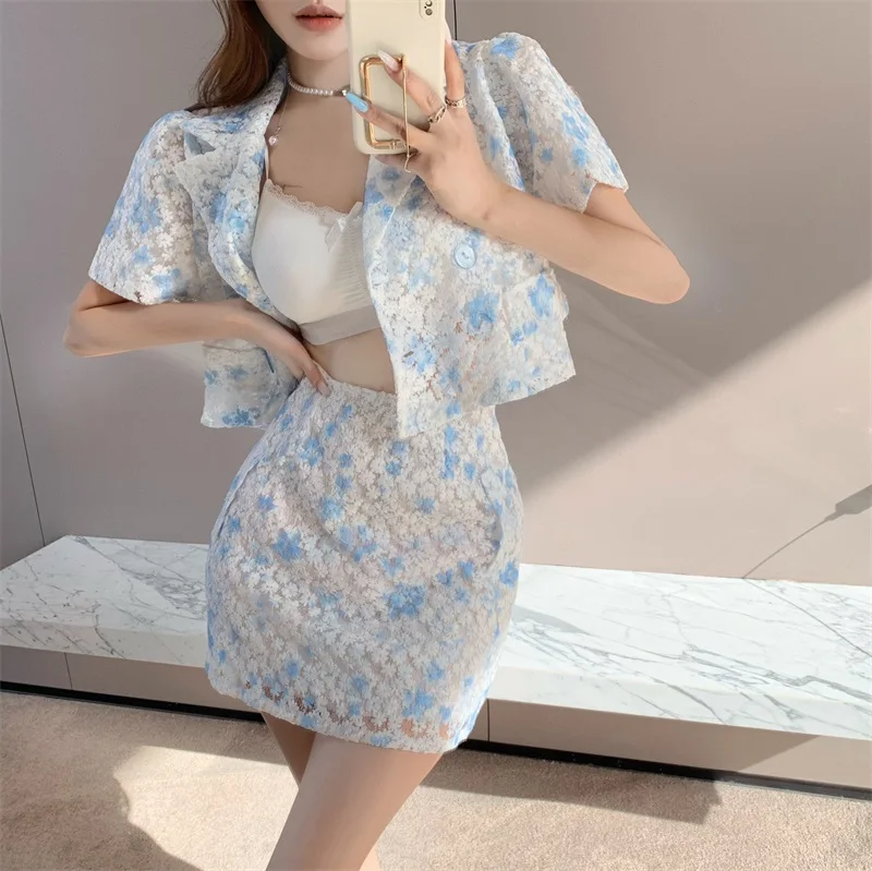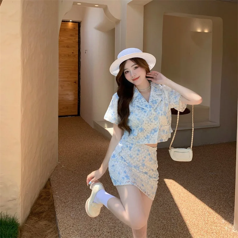 New Summer Korean Sweet Jacquard 2 Piece Set Women Crop Top Short Sleeve Shirt Blouse + Sheath Bodycon Skirts Sets Casual Suits
