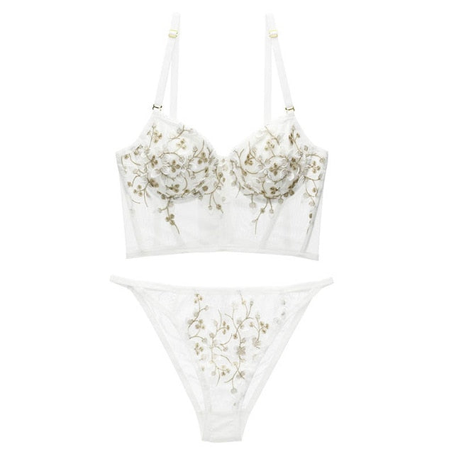 New Women Push-up Beauty Back Bra and Panty Sets French Underwear Embroidery Lace See Through Sexy Brassiere Underwire Bralette