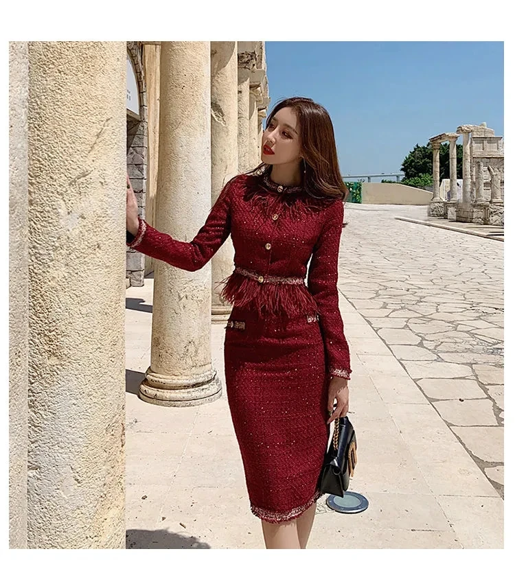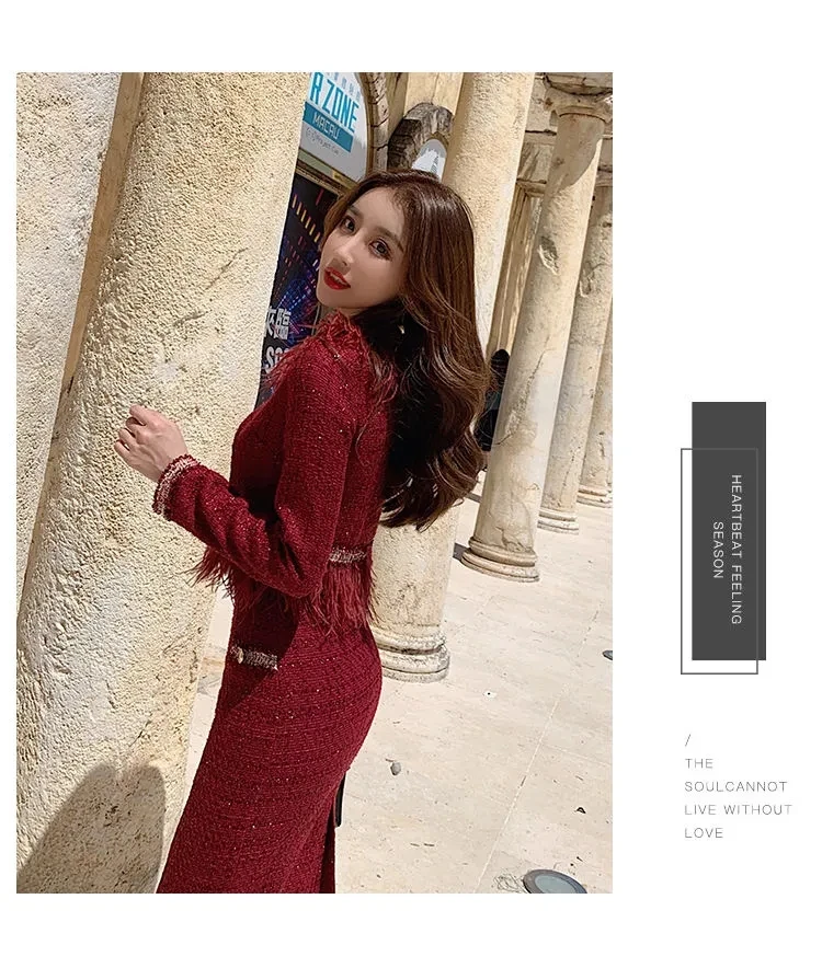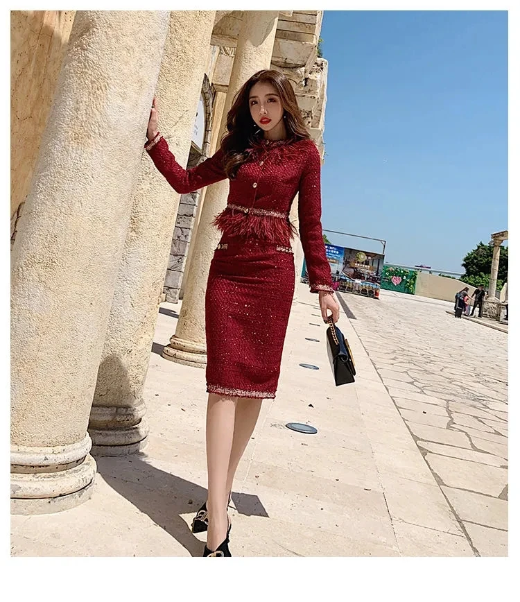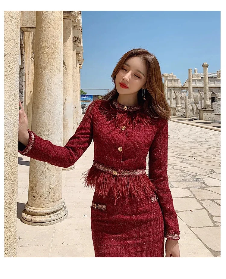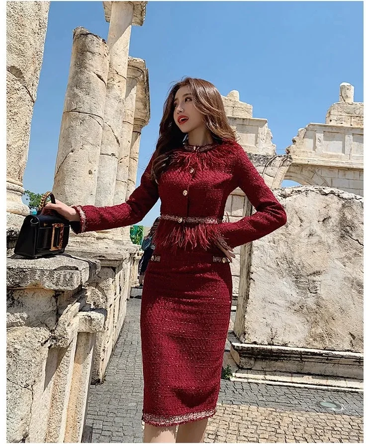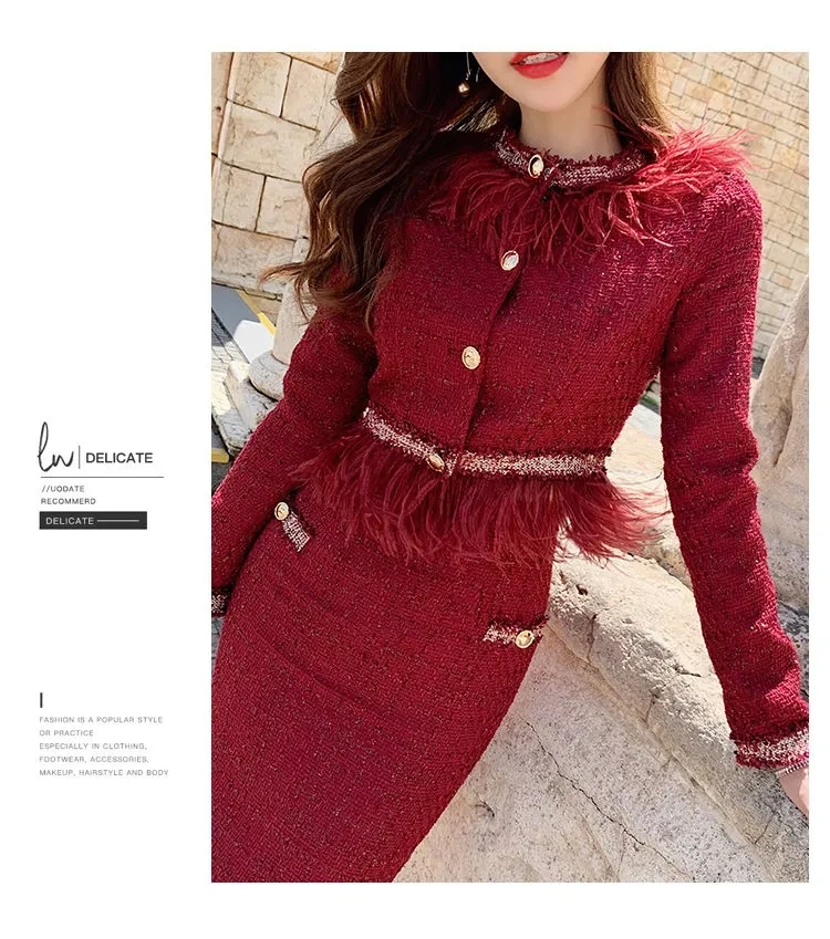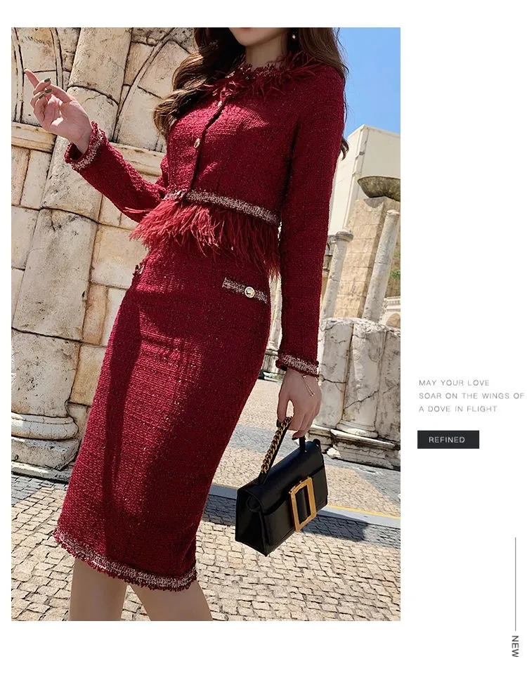 S-3XL Women Winter New Fashion Small Fragrance Red Suit Tassel Round Neck Short Coat + Hips Skirt Female Two-Piece Sets