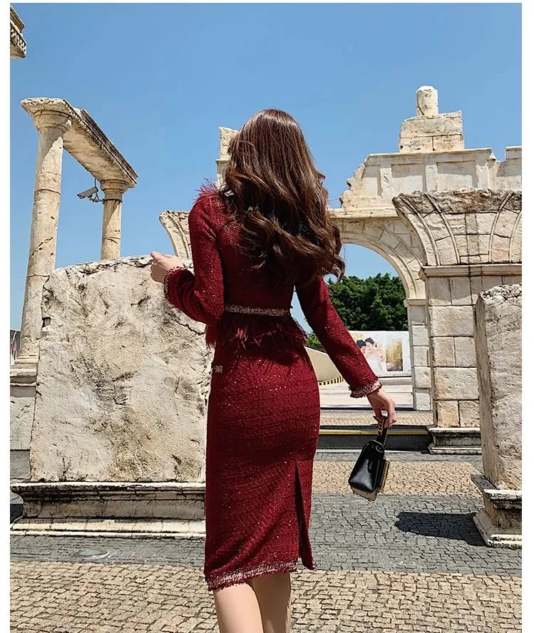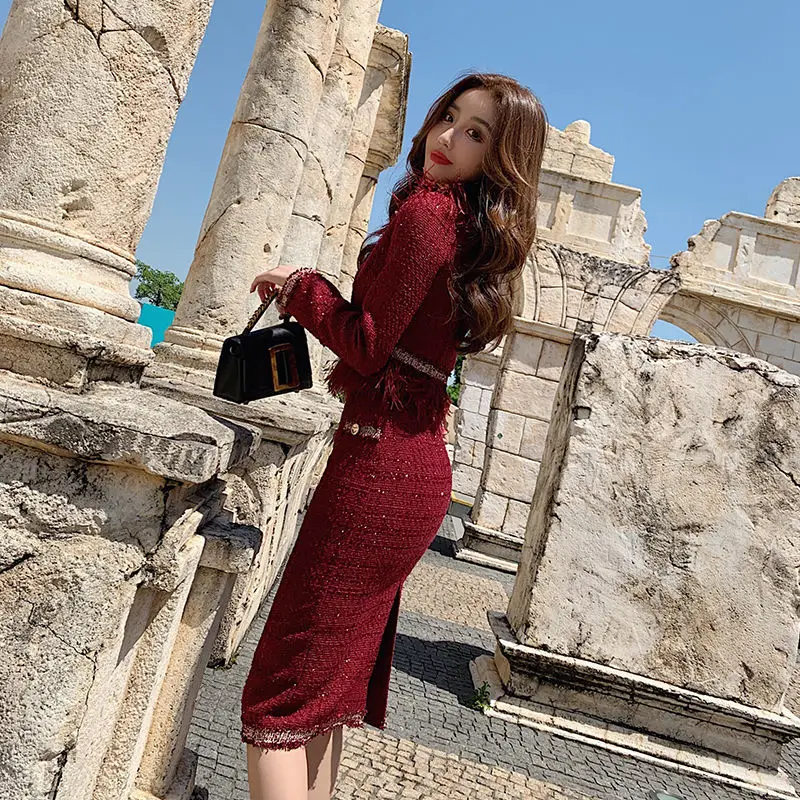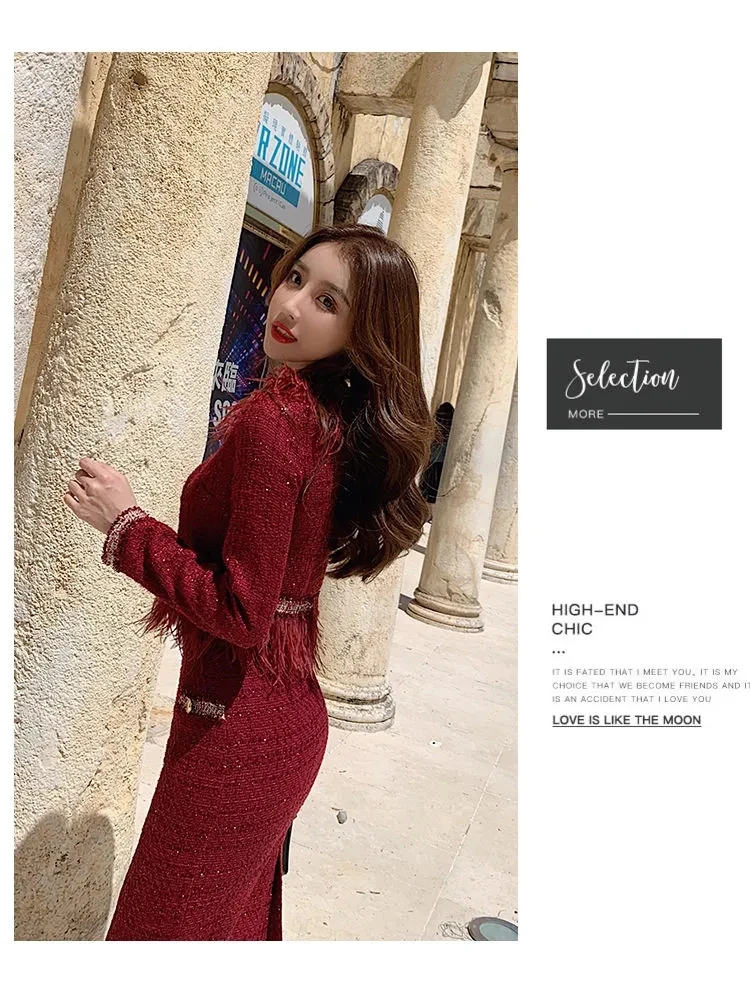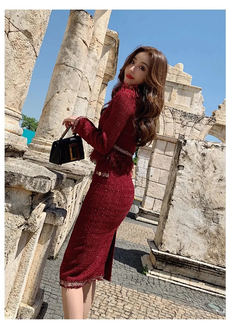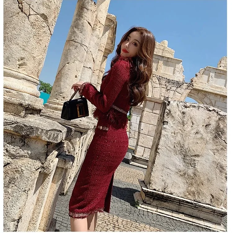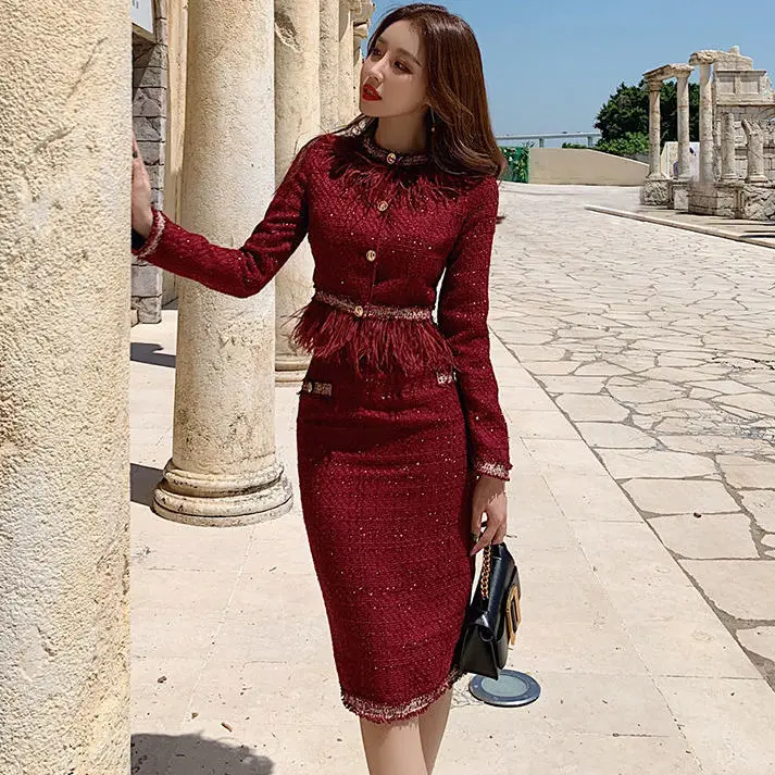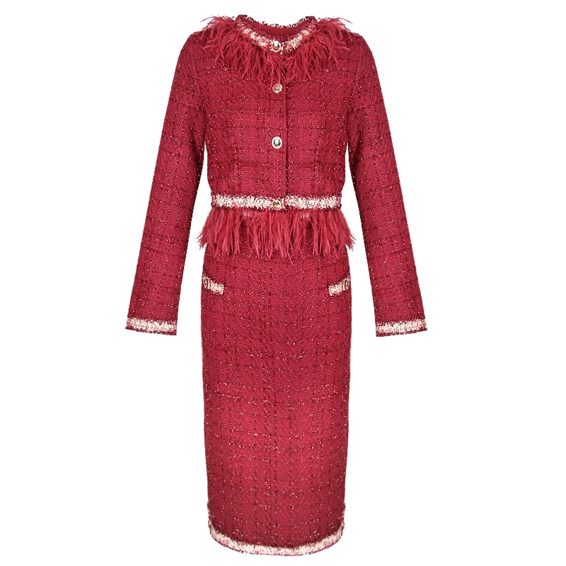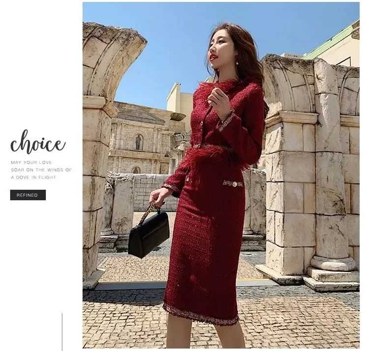 S-3XL Women Winter New Fashion Small Fragrance Red Suit Tassel Round Neck Short Coat + Hips Skirt Female Two-Piece Sets