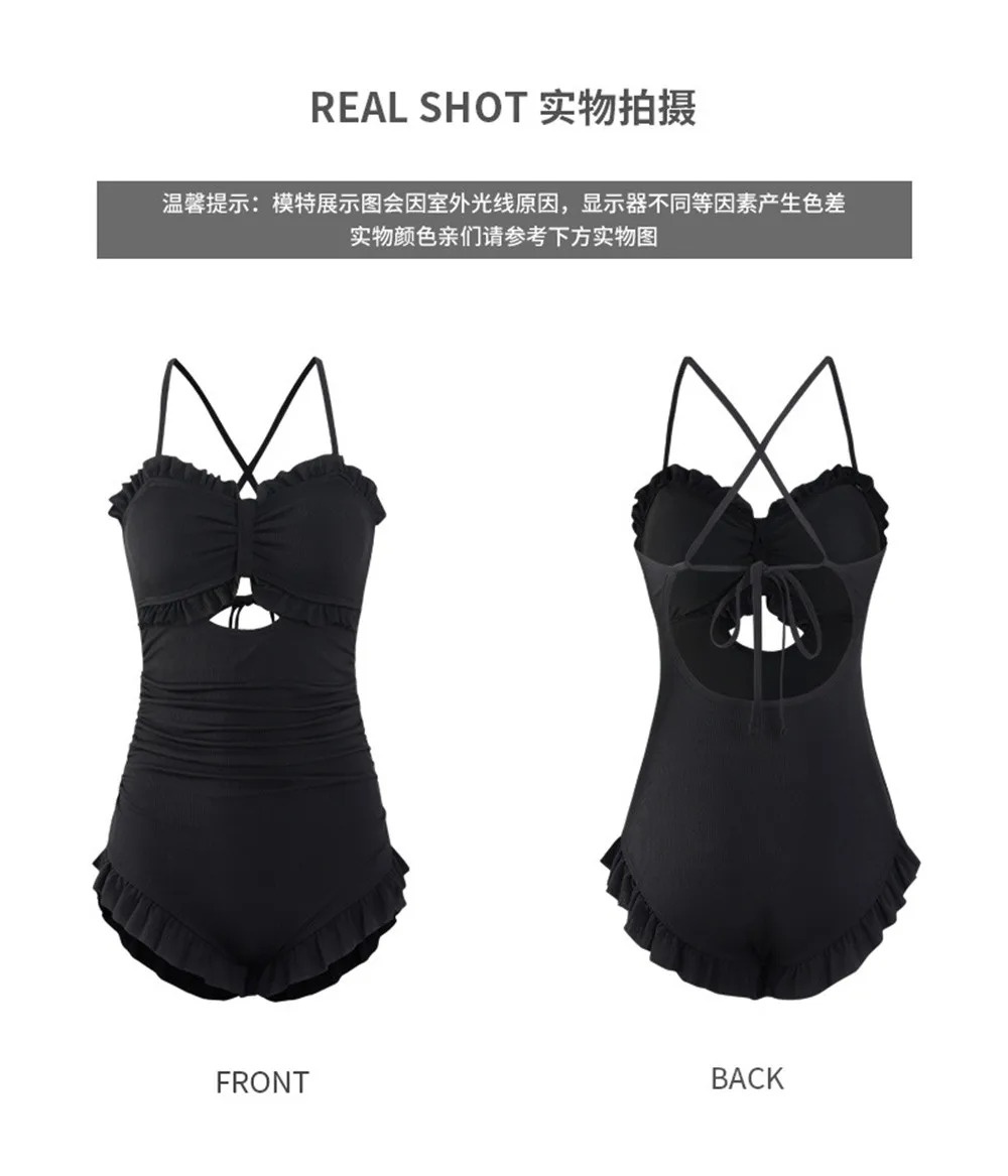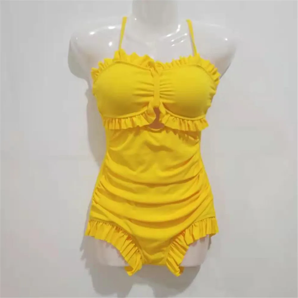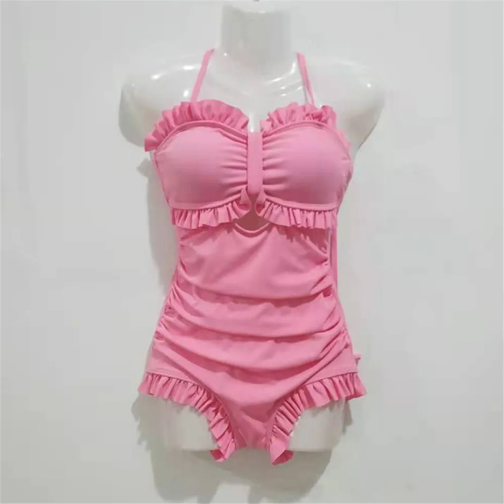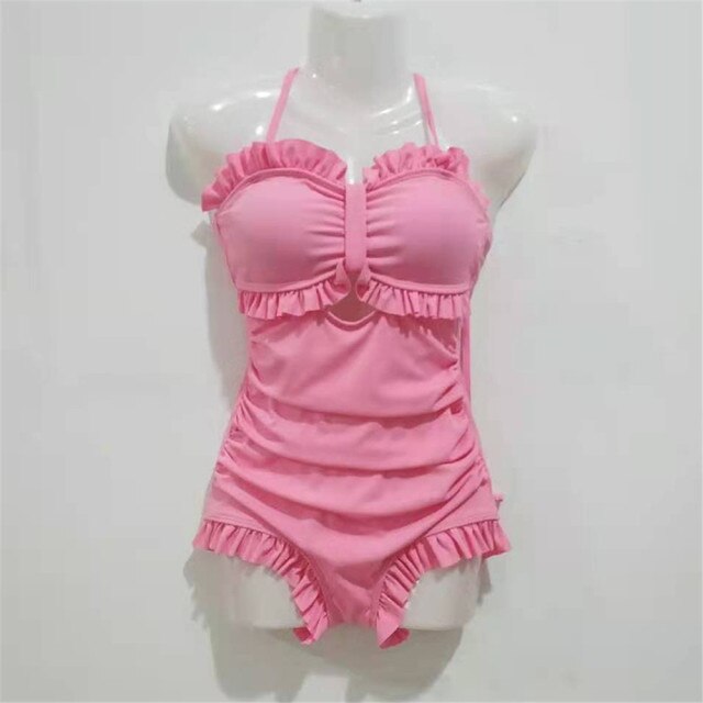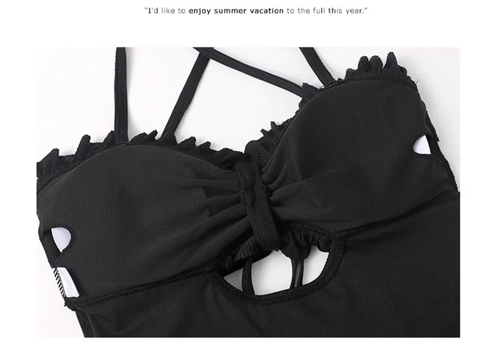 | Sexy Bow One Piece Swimsuit Women Solid Swimwear Cut Out Monokini Push Up Swim Suits Ruffle Bathing Suit Pad Open Back Bandage |