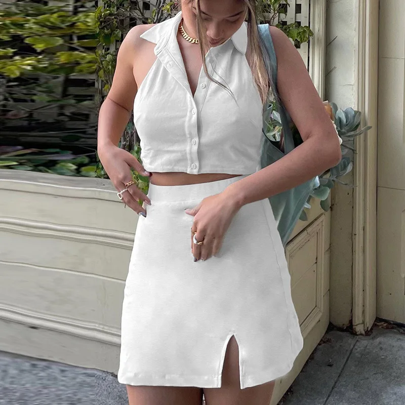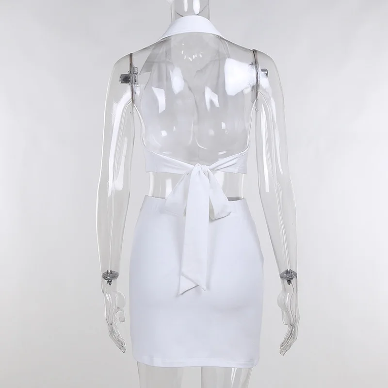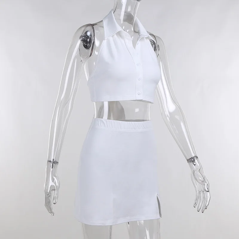 Sexy Polo-Neck Crop Tops Mini Skirts Set Women Backless High Waist Elastic Skirt Suits 2021 Summer Sports Casual Two Piece Sets