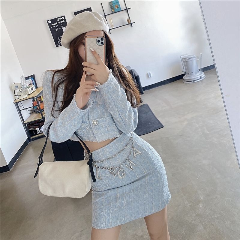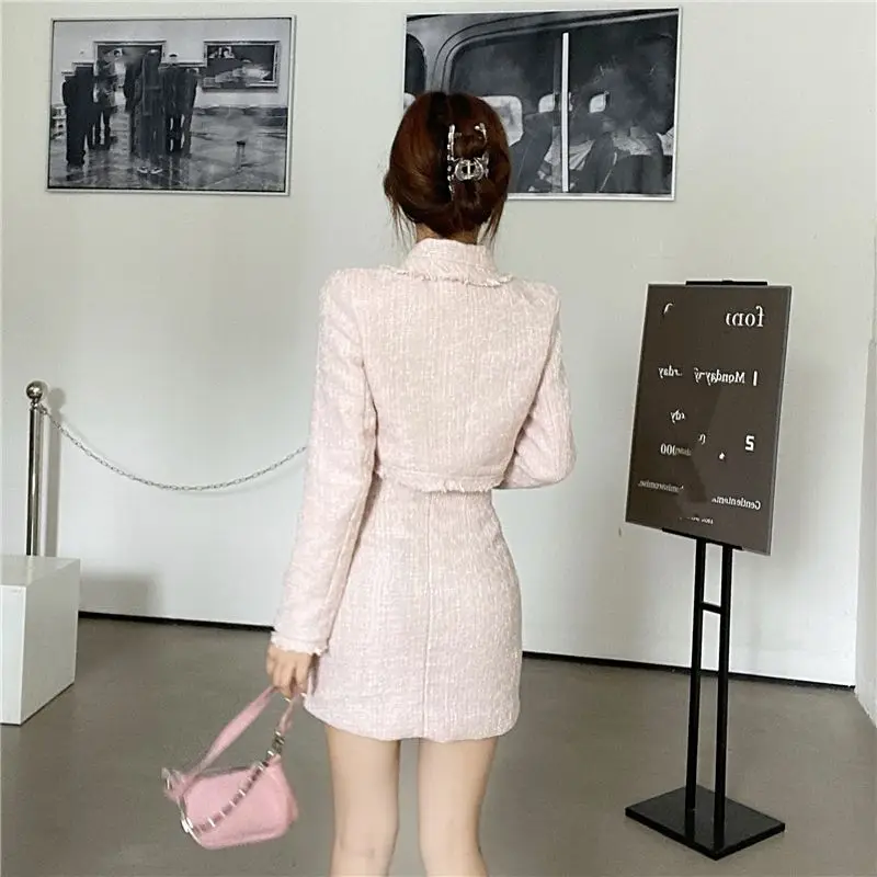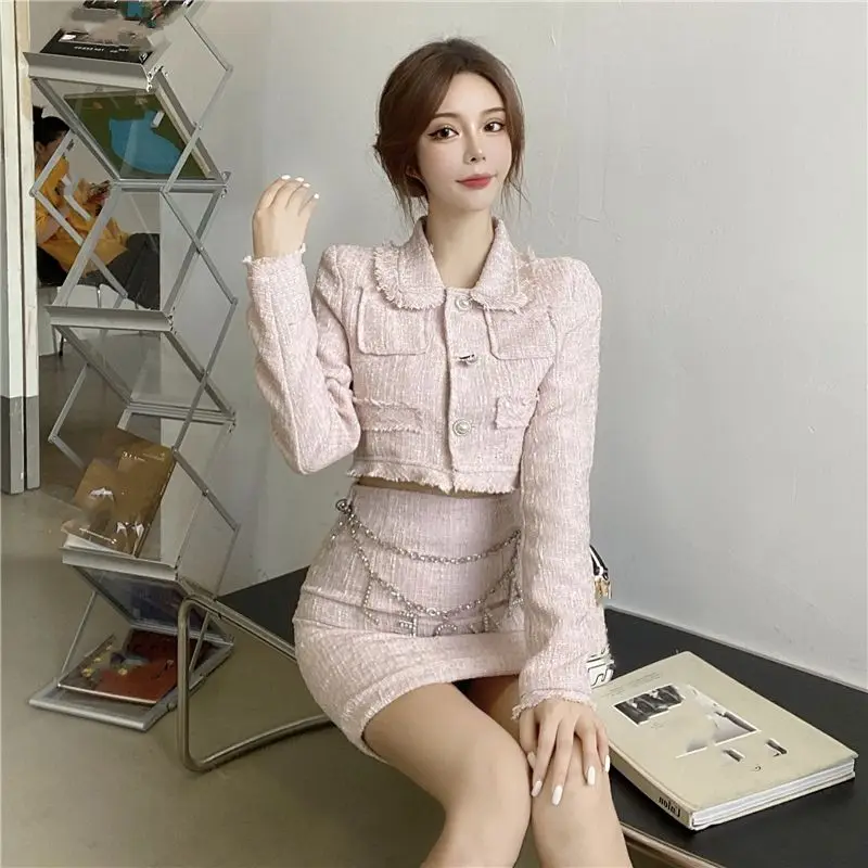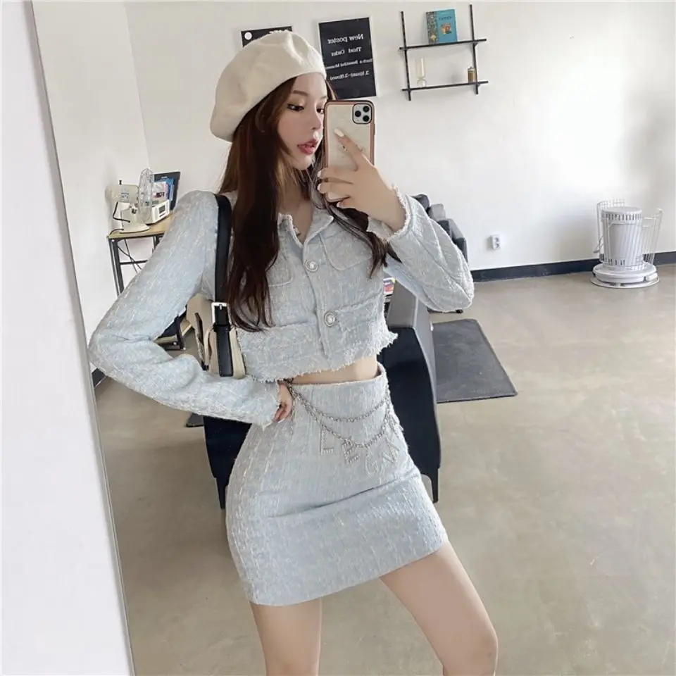 Spring Autumn Women's 2-Piece Sets Short Lapel Tweed Jacket + High Waist Bag Hip Skirt Female Ins Suit
