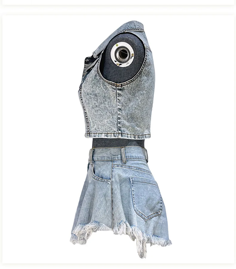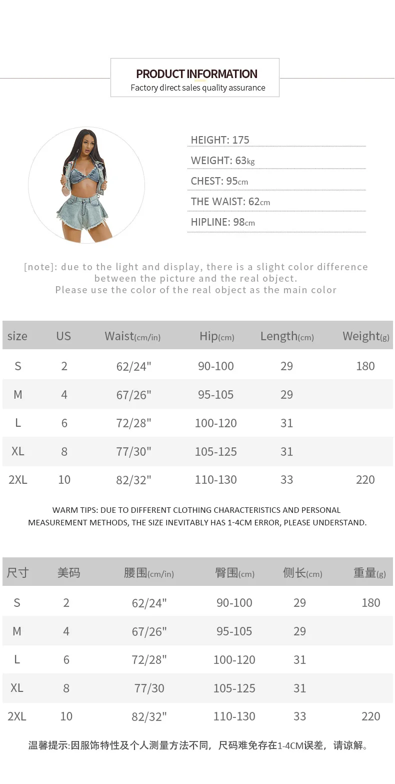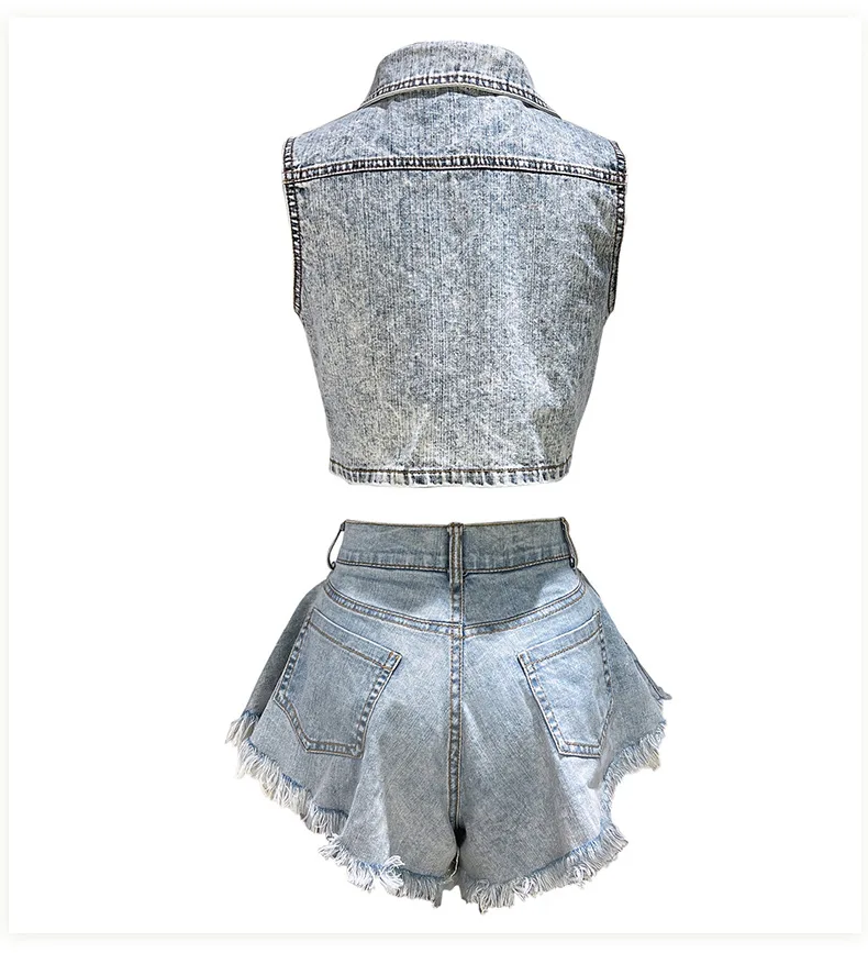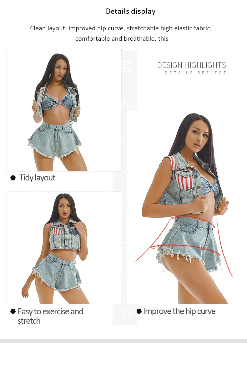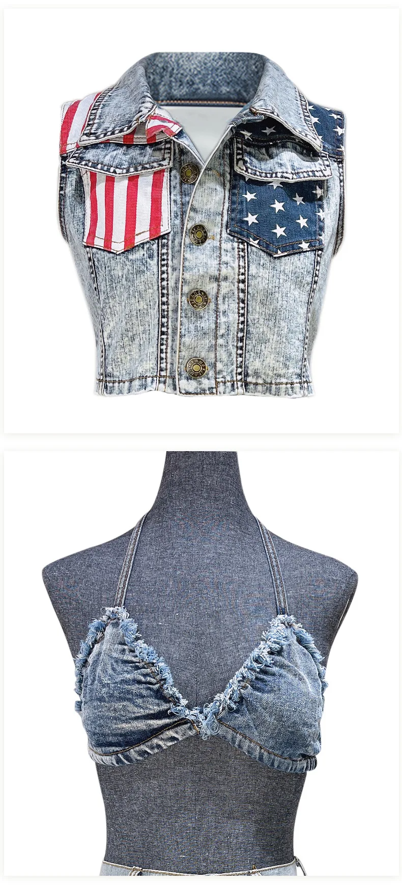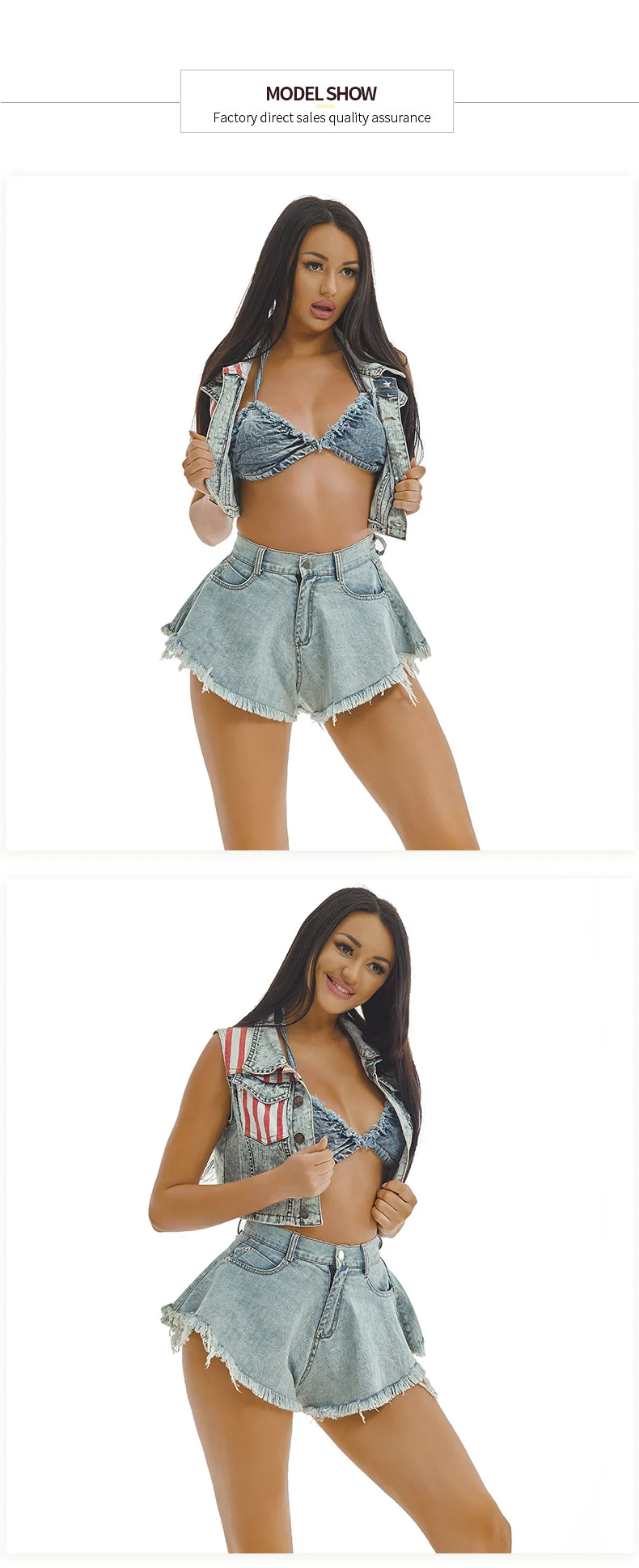 Summer Fashion American Flag Denim Waistcoat Tassel Shorts Two Pieces Set Slim Vest Tops Suits Set For Women