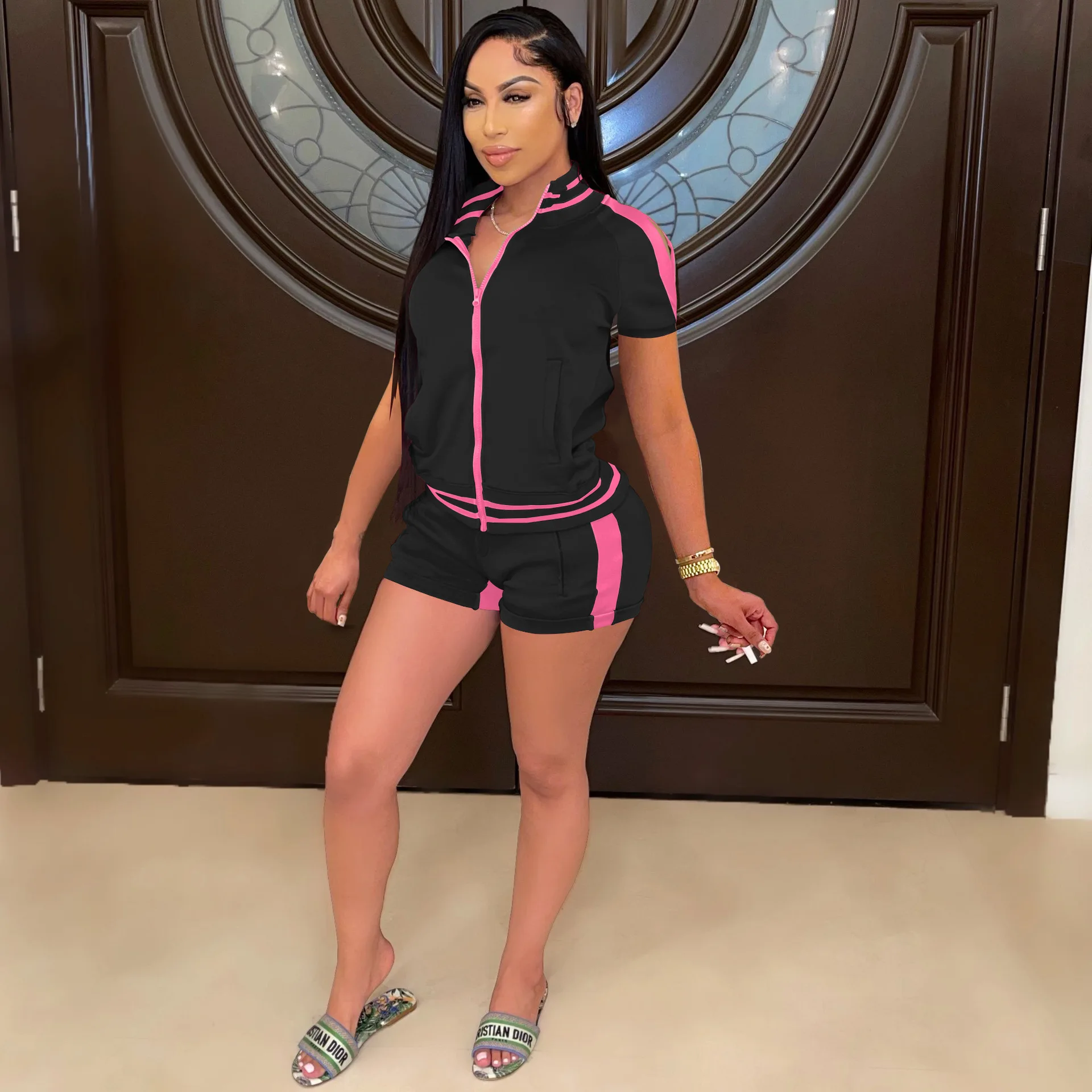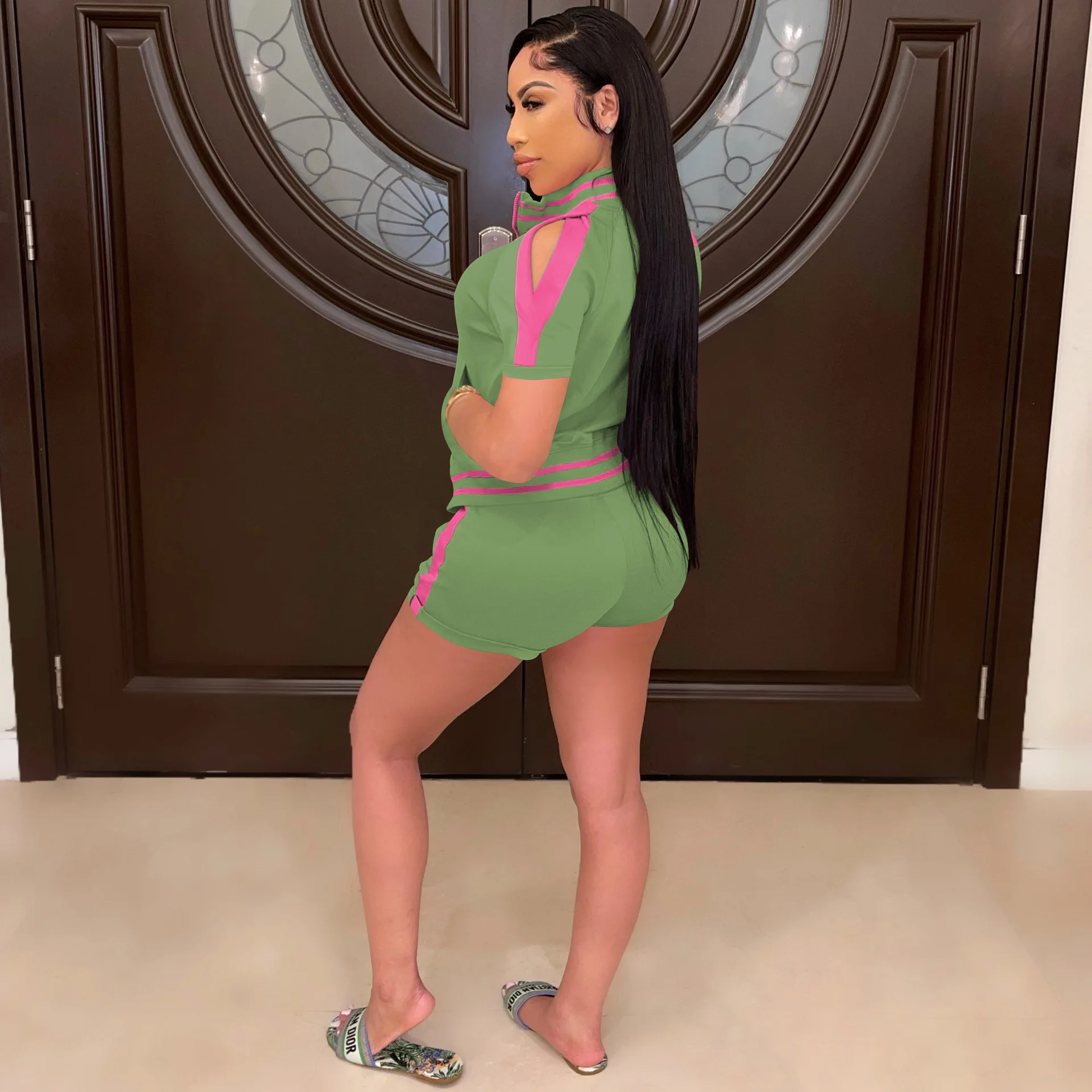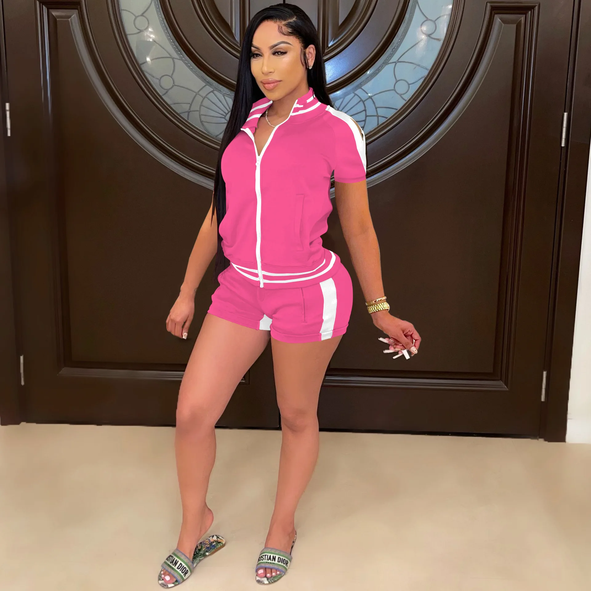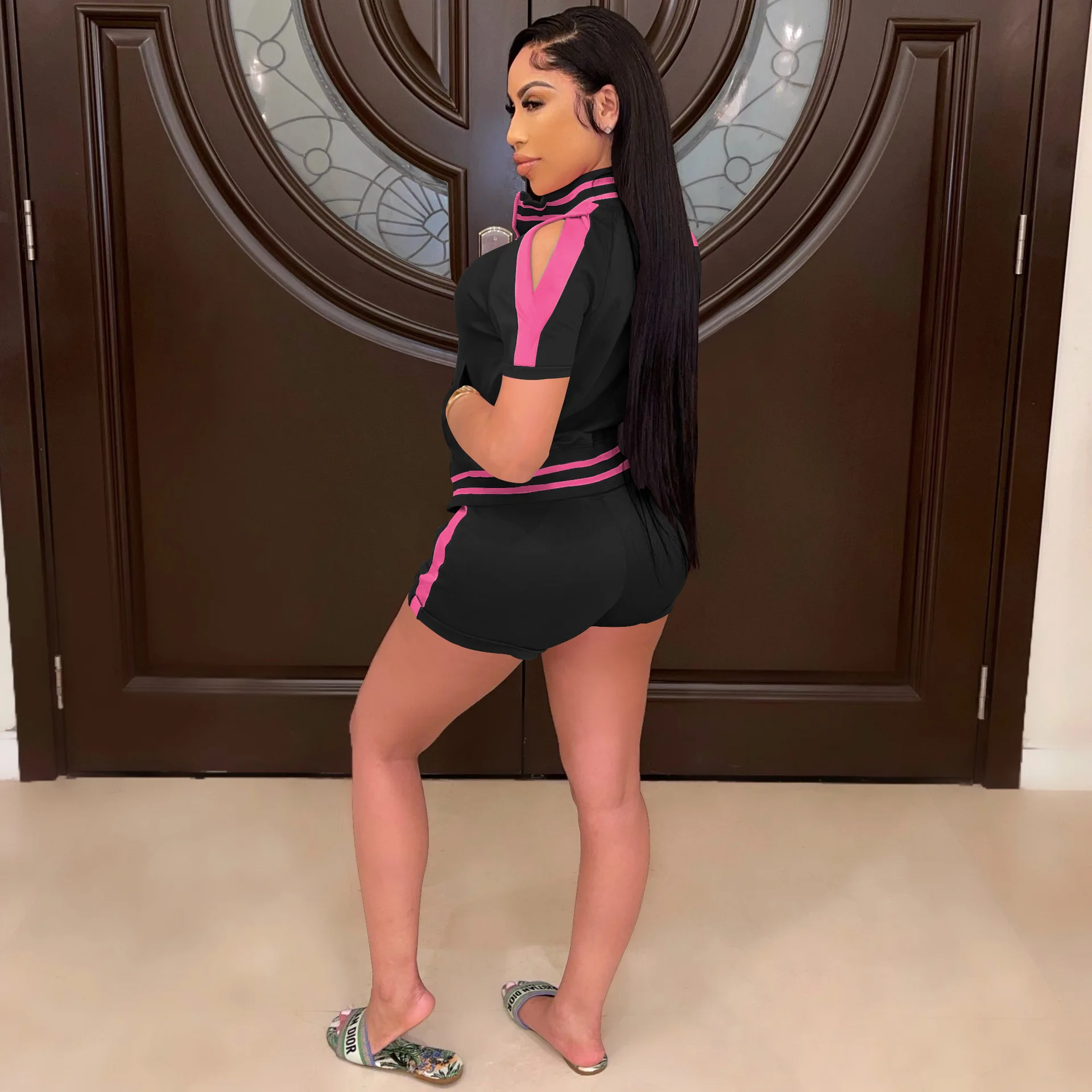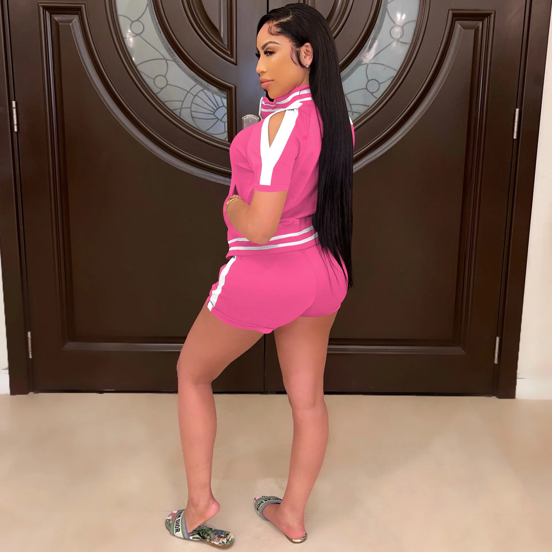 Summer Streetwear 2 Two Piece Sets Women Outfits Short Sleeve Zipper Hollow Out Top Pink Biker Shorts Set Casual Tracksuit