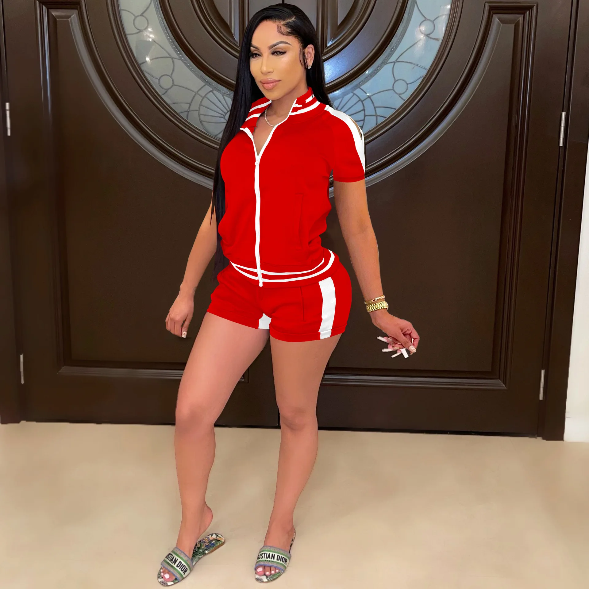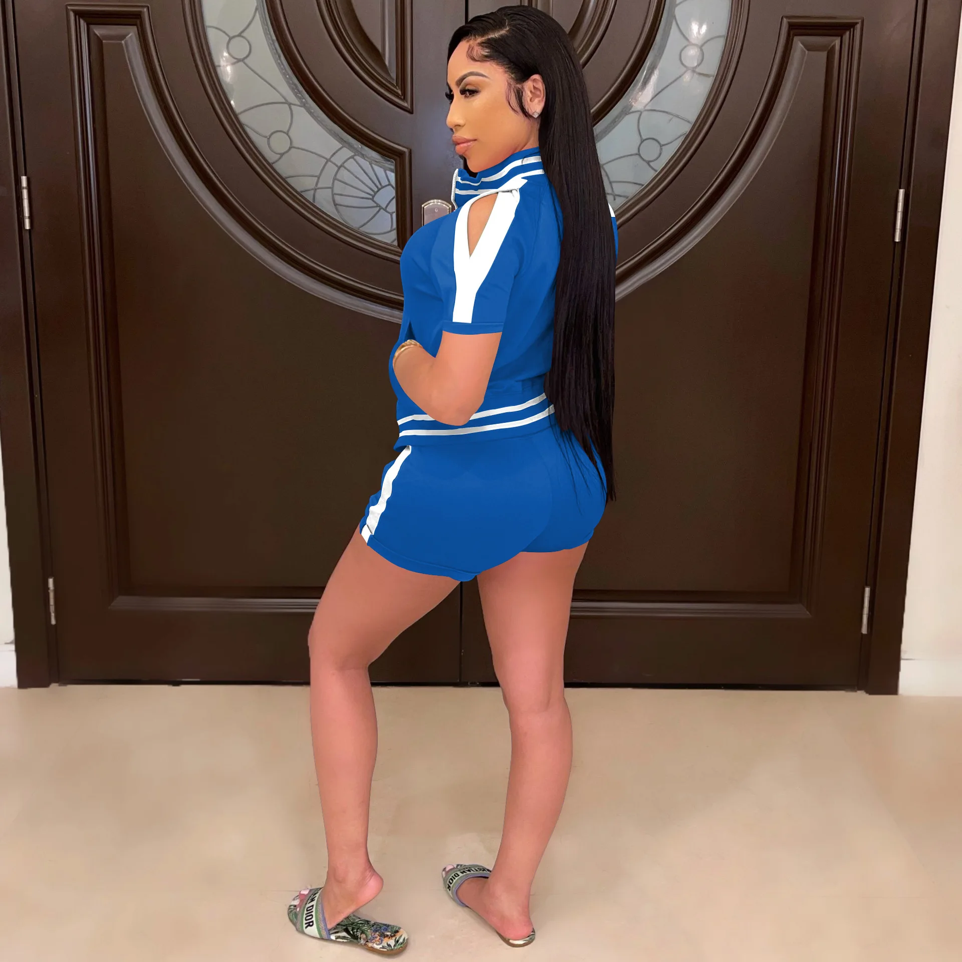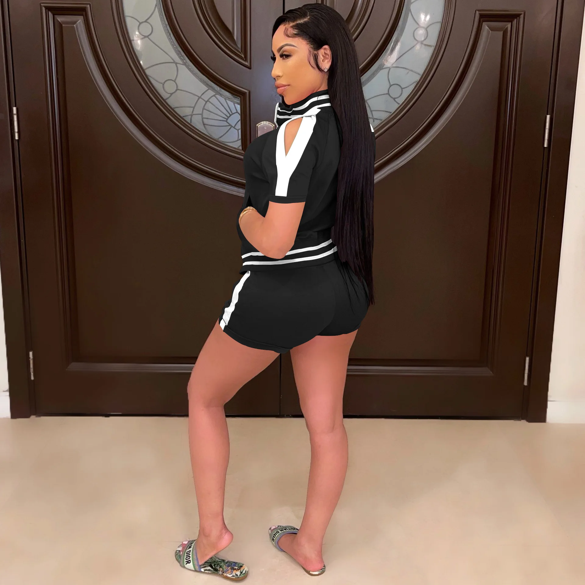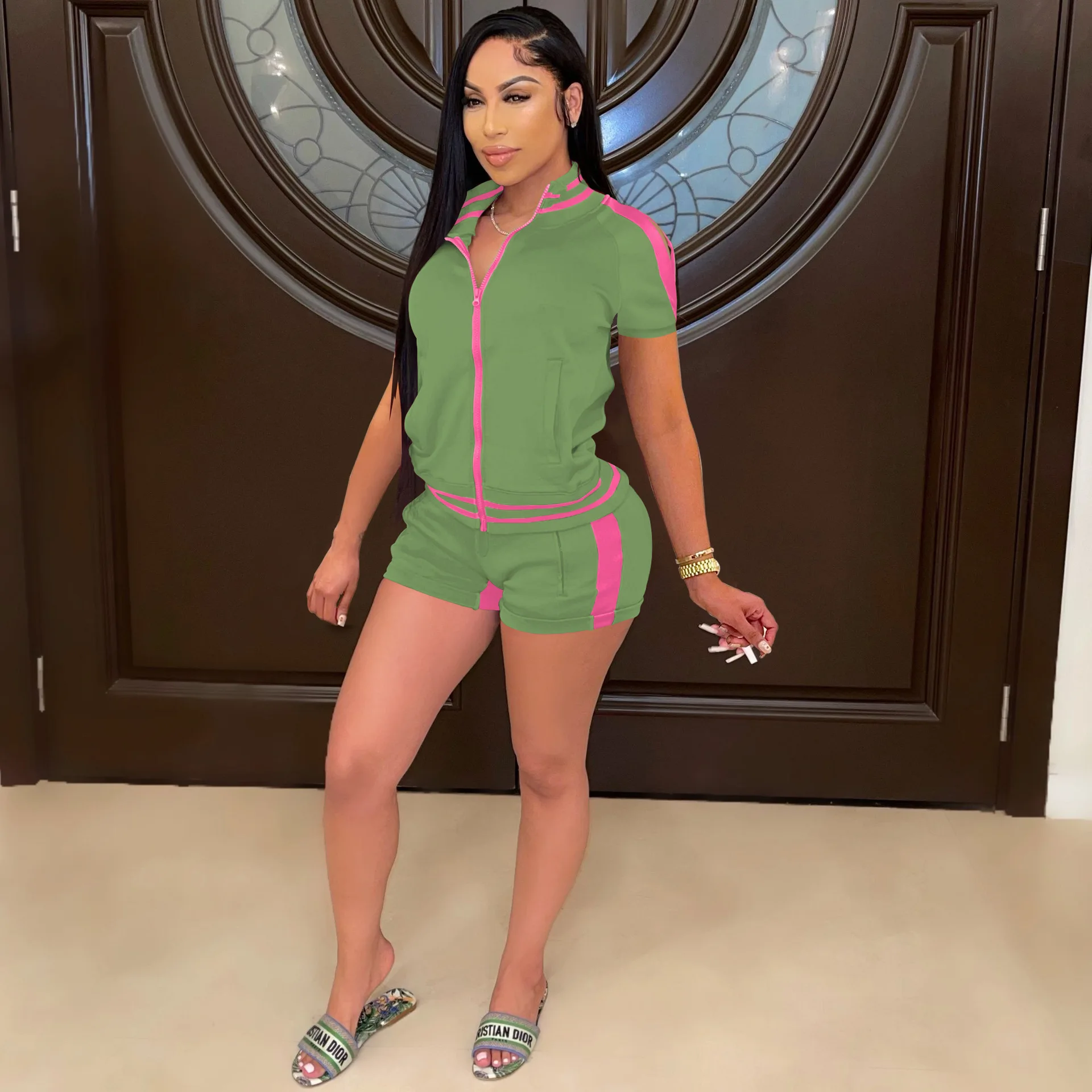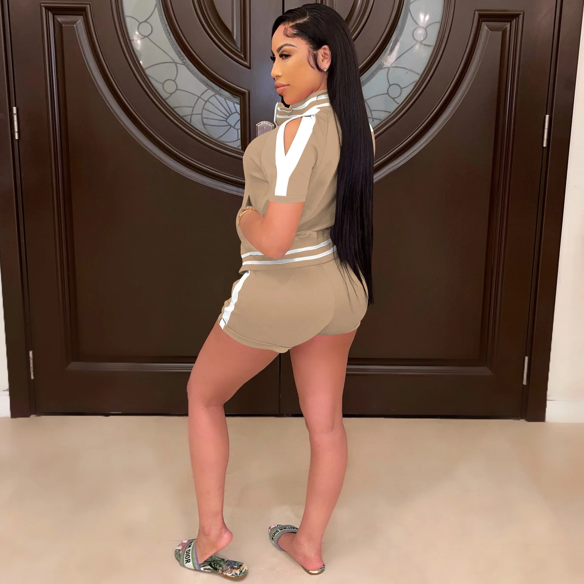 Summer Streetwear 2 Two Piece Sets Women Outfits Short Sleeve Zipper Hollow Out Top Pink Biker Shorts Set Casual Tracksuit