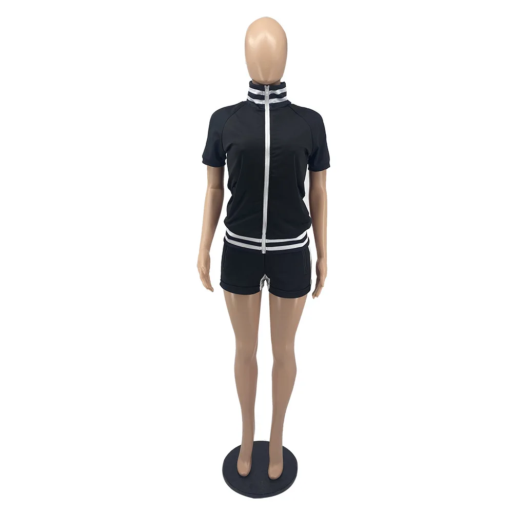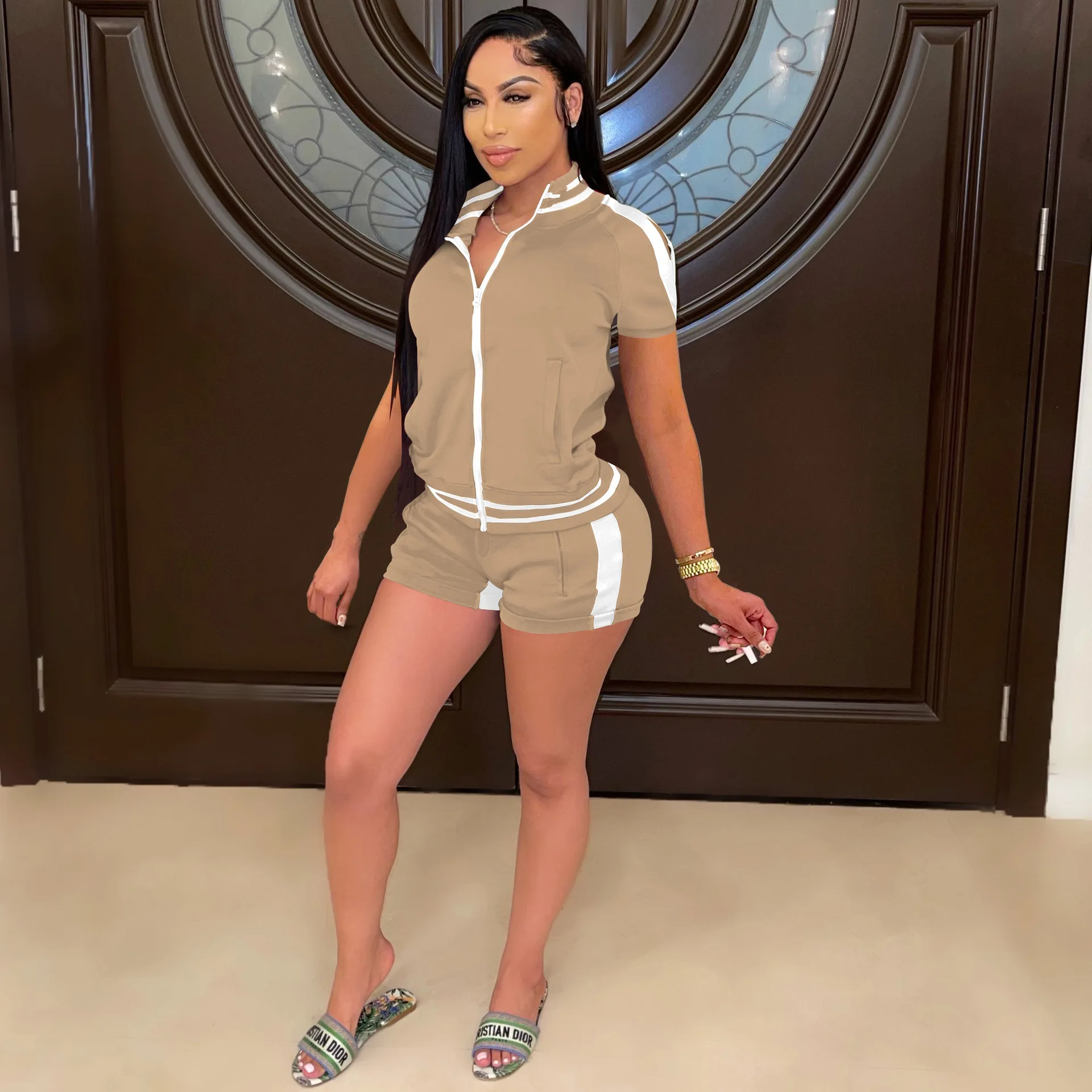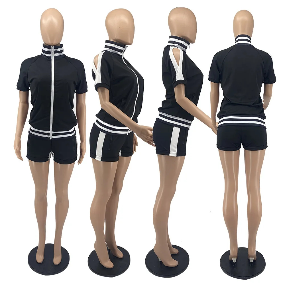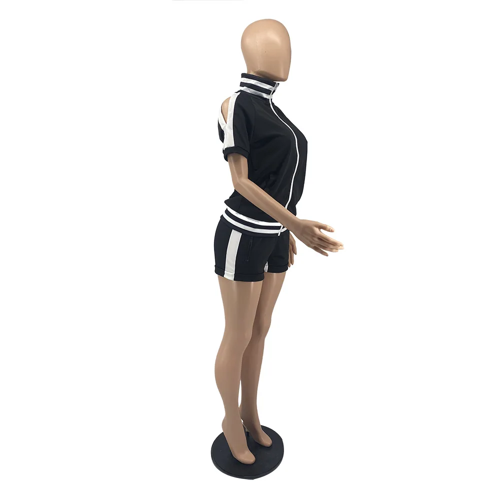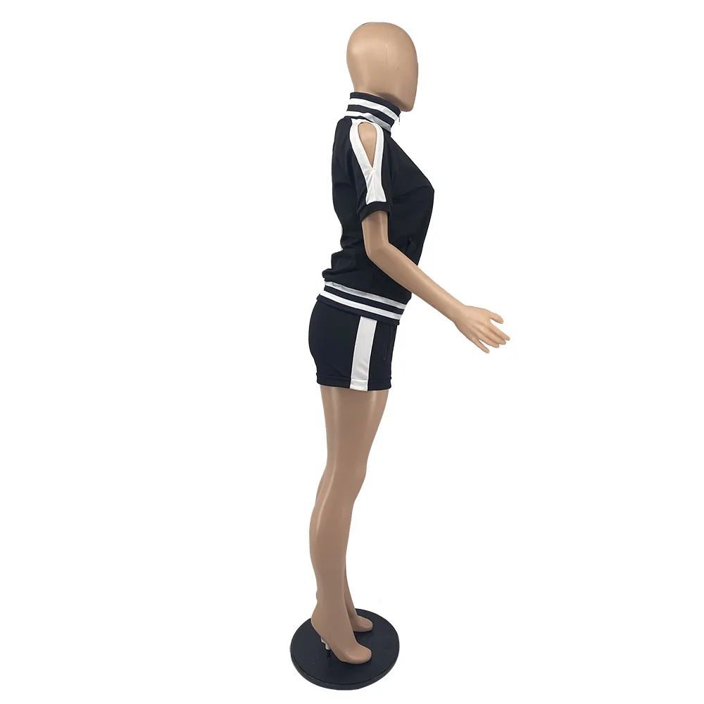 Summer Streetwear 2 Two Piece Sets Women Outfits Short Sleeve Zipper Hollow Out Top Pink Biker Shorts Set Casual Tracksuit