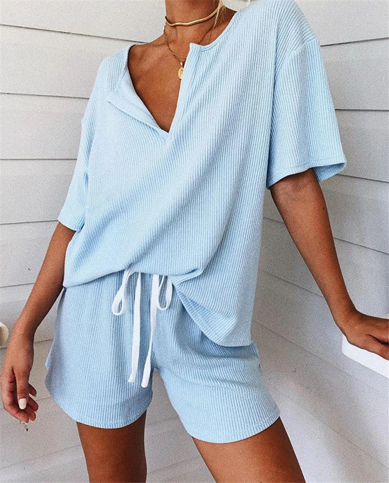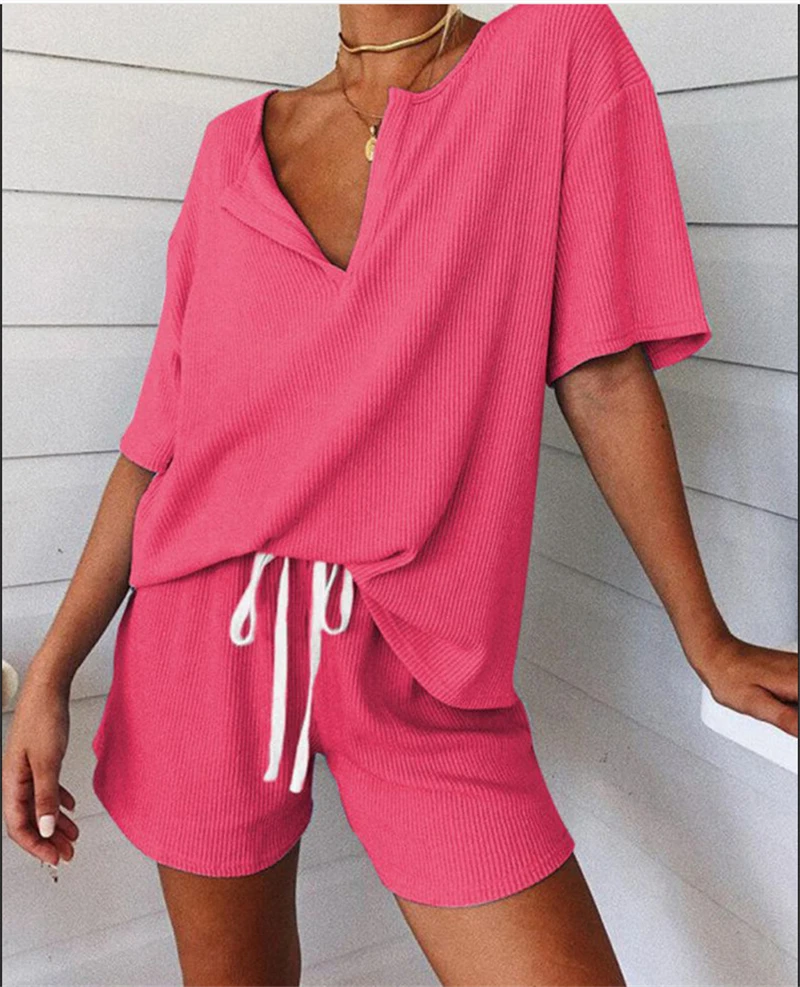Summer Tracksuit Women Two Piece Set Rib V Neck T Shirt Top and Shorts Pajamas Sets Lounge Wear Ladies Fitness Casual Homewear 100% brand new and high quality. No trace of the Enjoyment Style:Fashion,Comfortable Color:show as pictures
