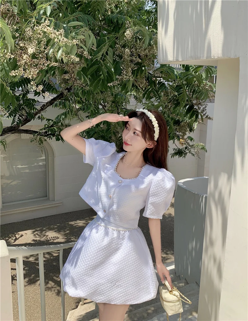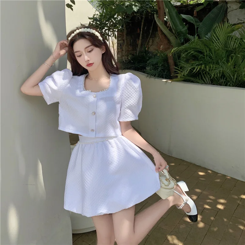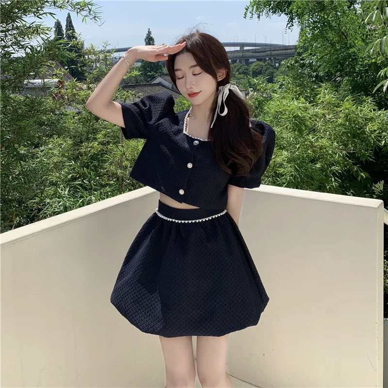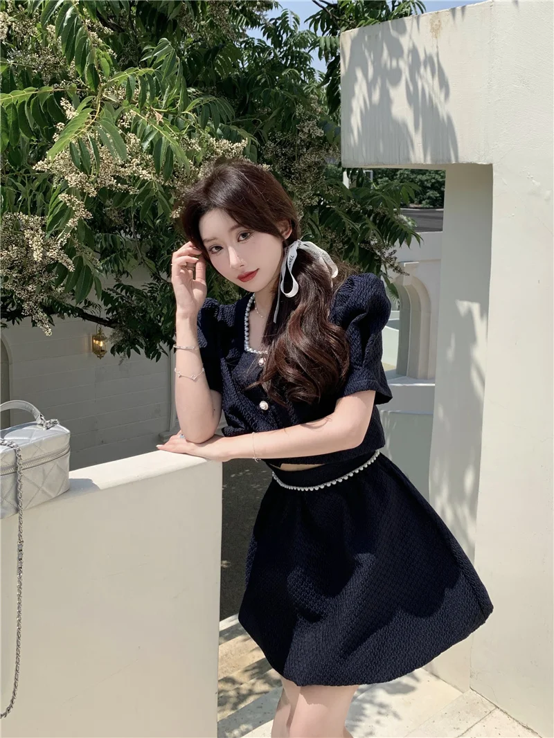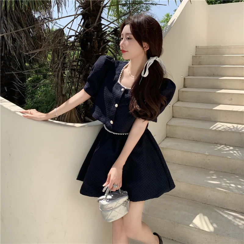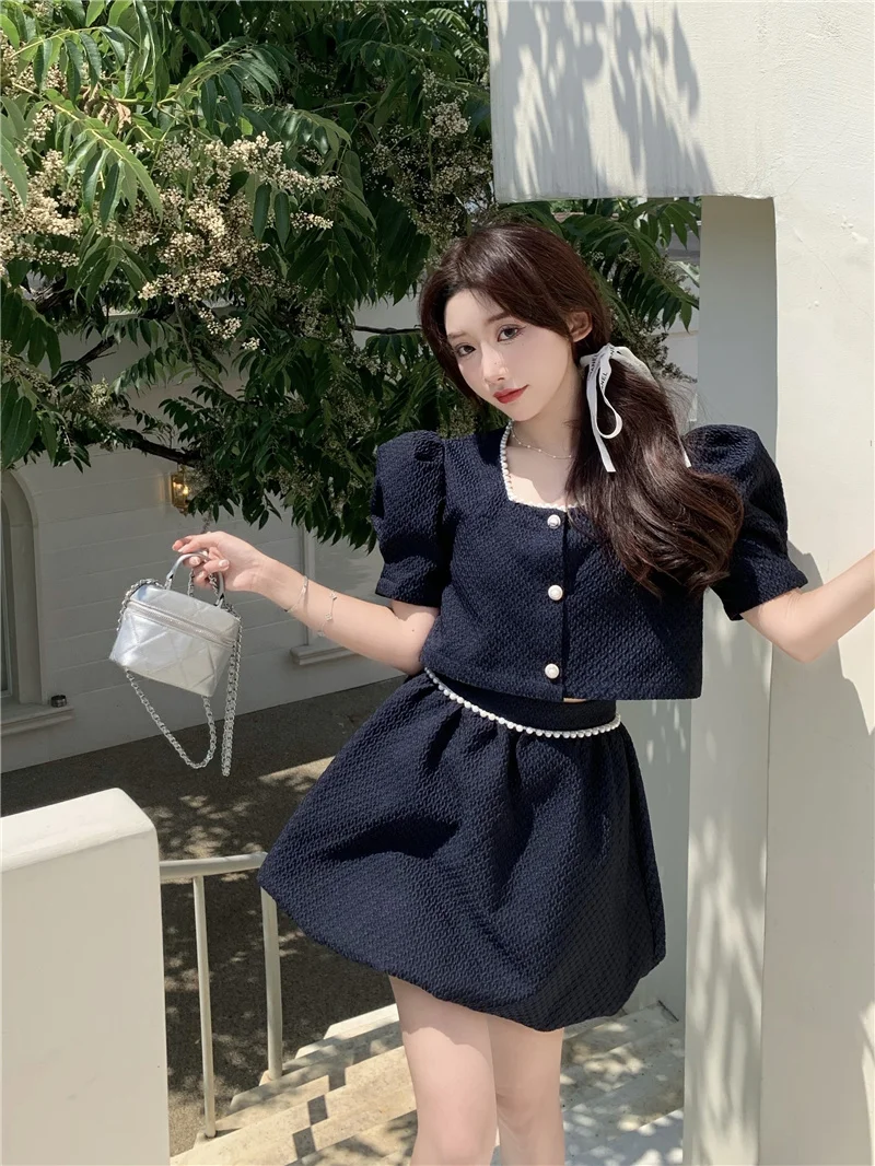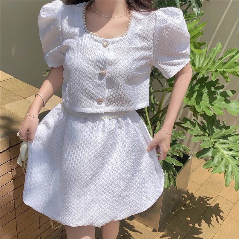 Sweet Skirt Suits Small Fragrant Pattern Jacquard Pearl Decoration Top + Elastic Waist Skirt Female Korean Fashion Two-piece Set