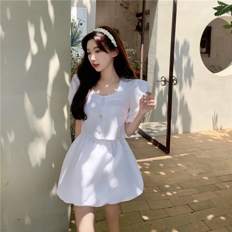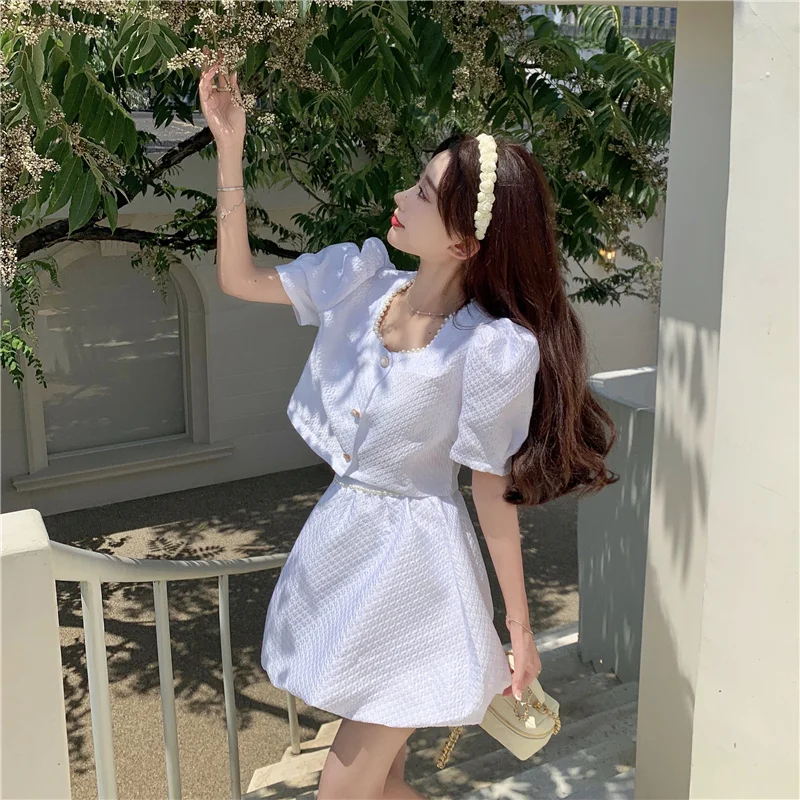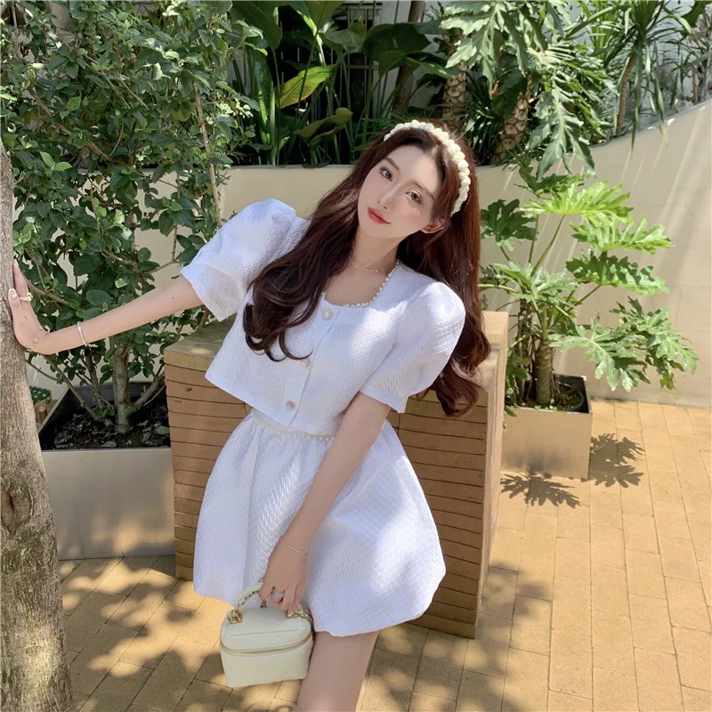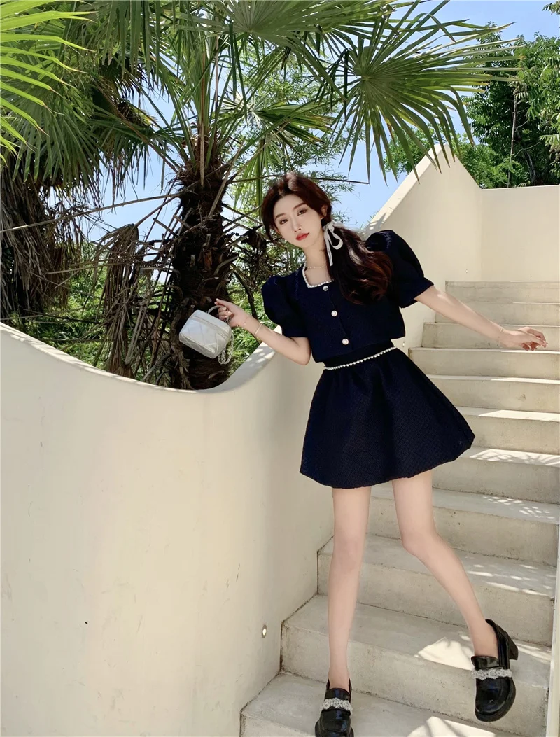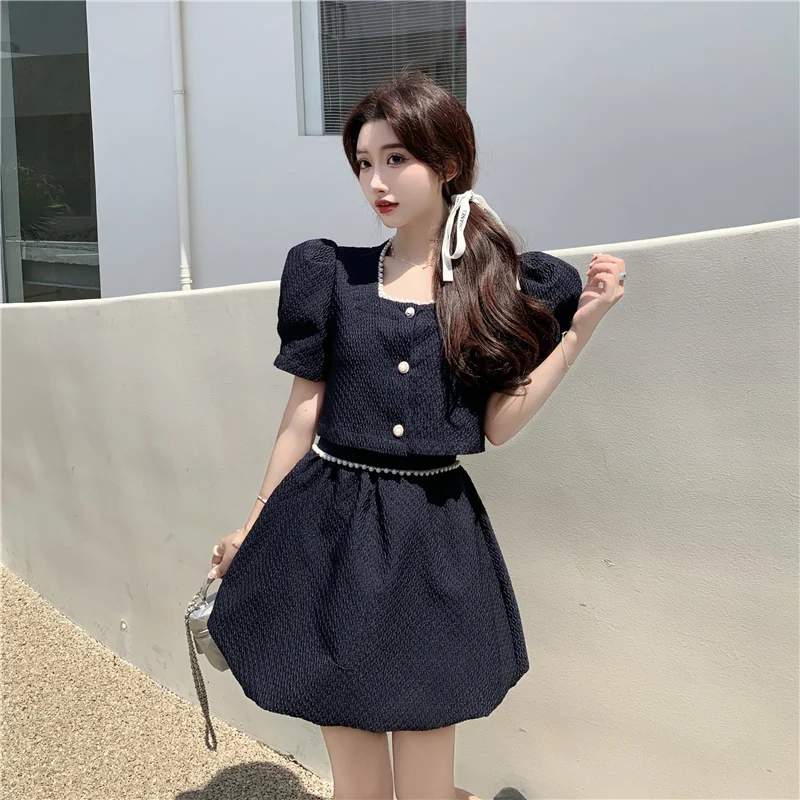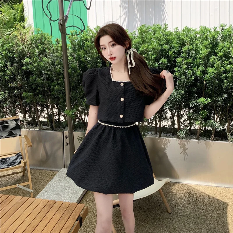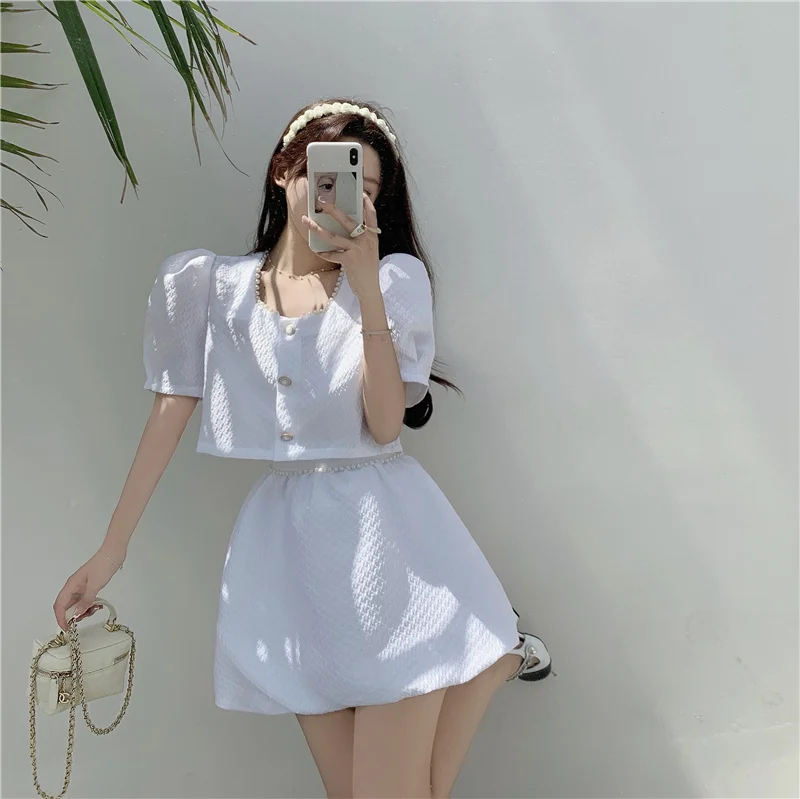 Sweet Skirt Suits Small Fragrant Pattern Jacquard Pearl Decoration Top + Elastic Waist Skirt Female Korean Fashion Two-piece Set