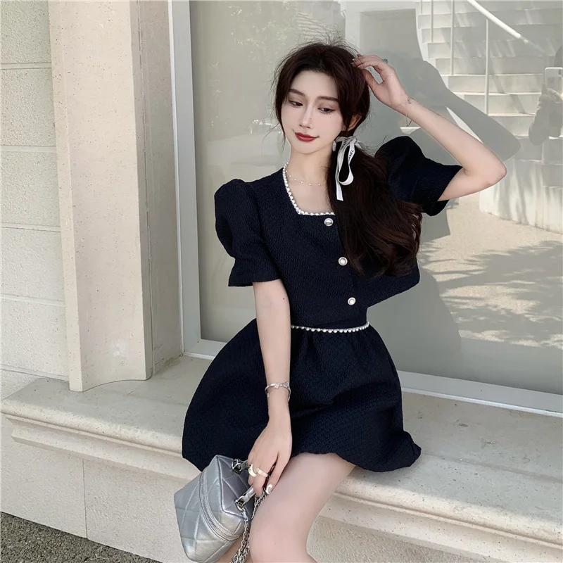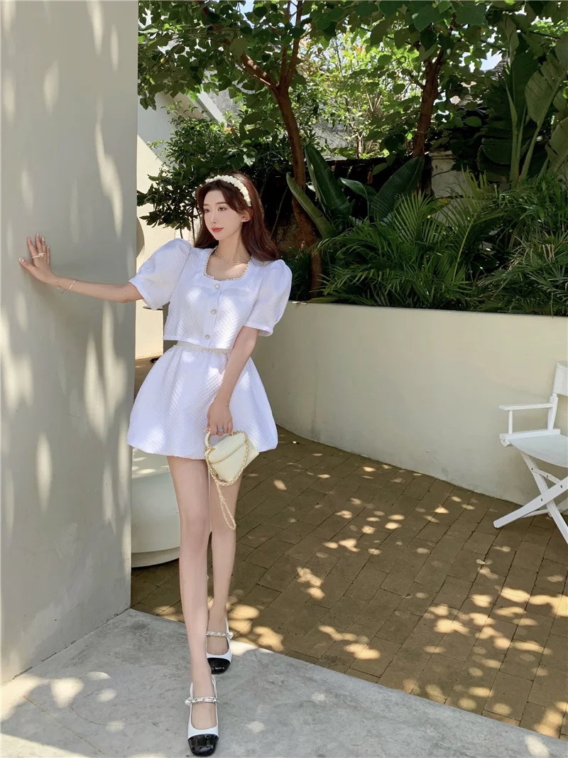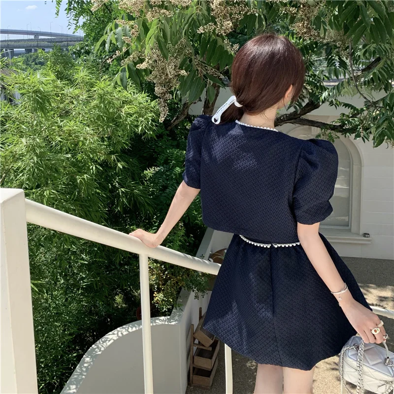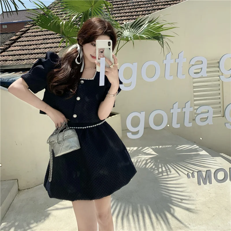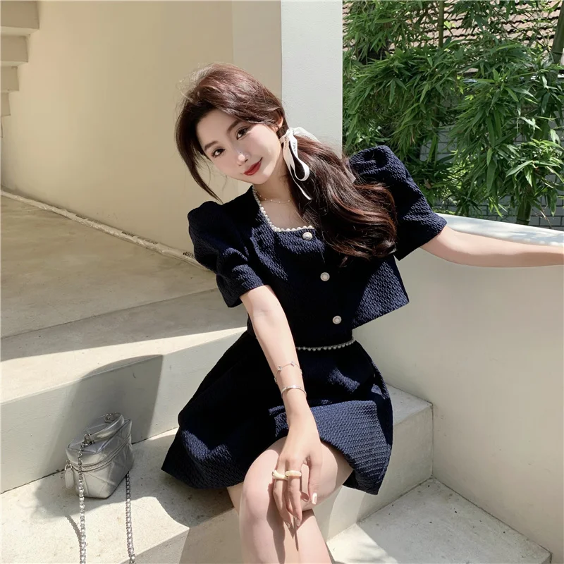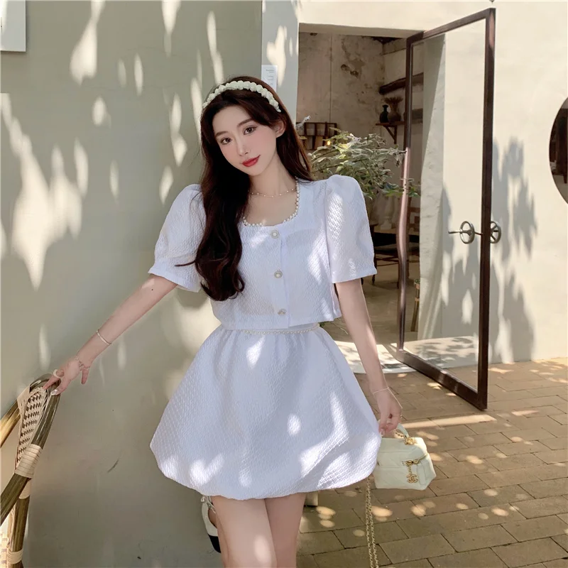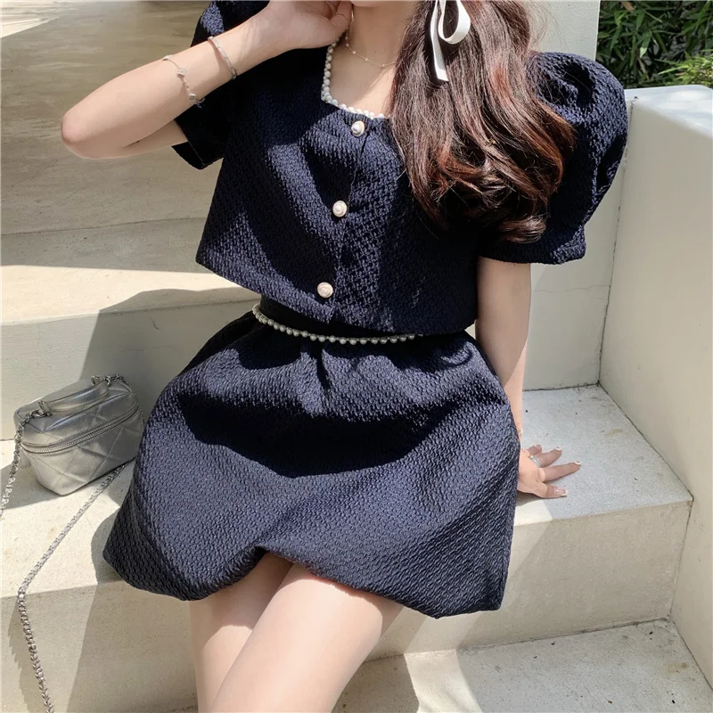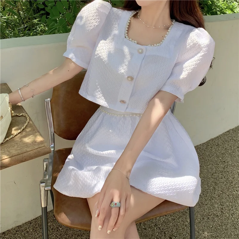 Sweet Skirt Suits Small Fragrant Pattern Jacquard Pearl Decoration Top + Elastic Waist Skirt Female Korean Fashion Two-piece Set