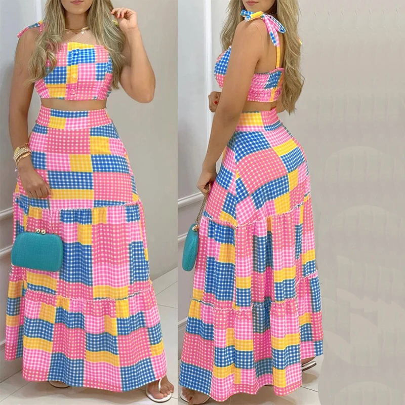 Two Piece Sexy Bandage Tube Top & High Waist Plaid Maxi Skirt Set Women Summer Casual Dress Suits Elegant Hem Skirt 2pcs