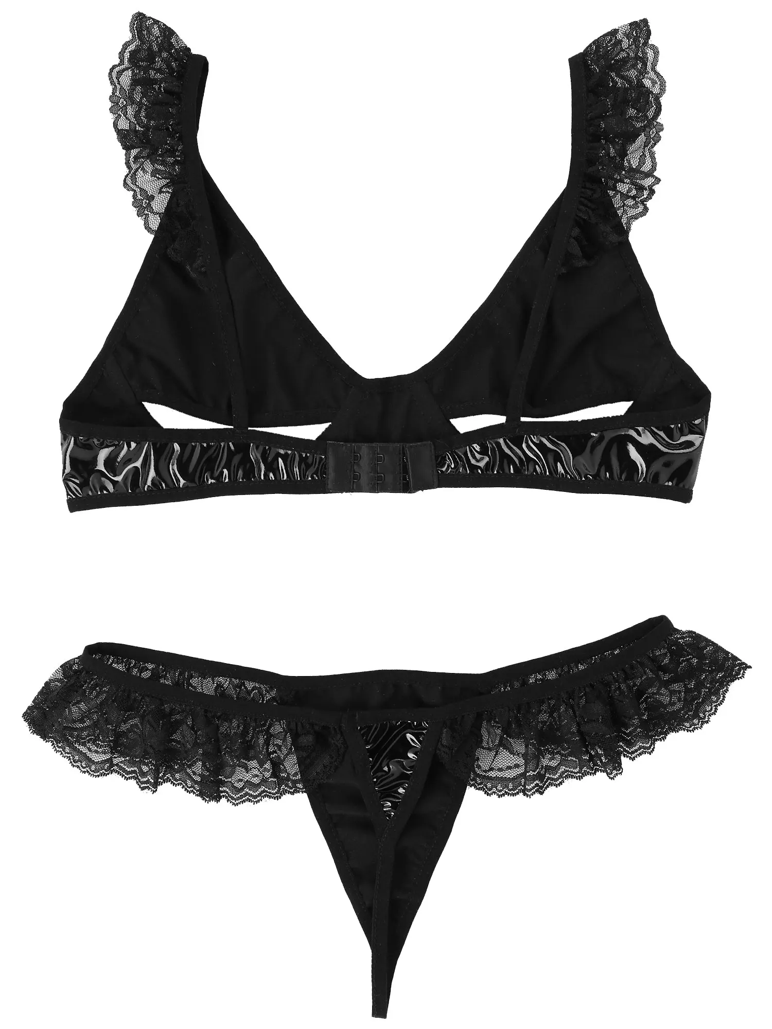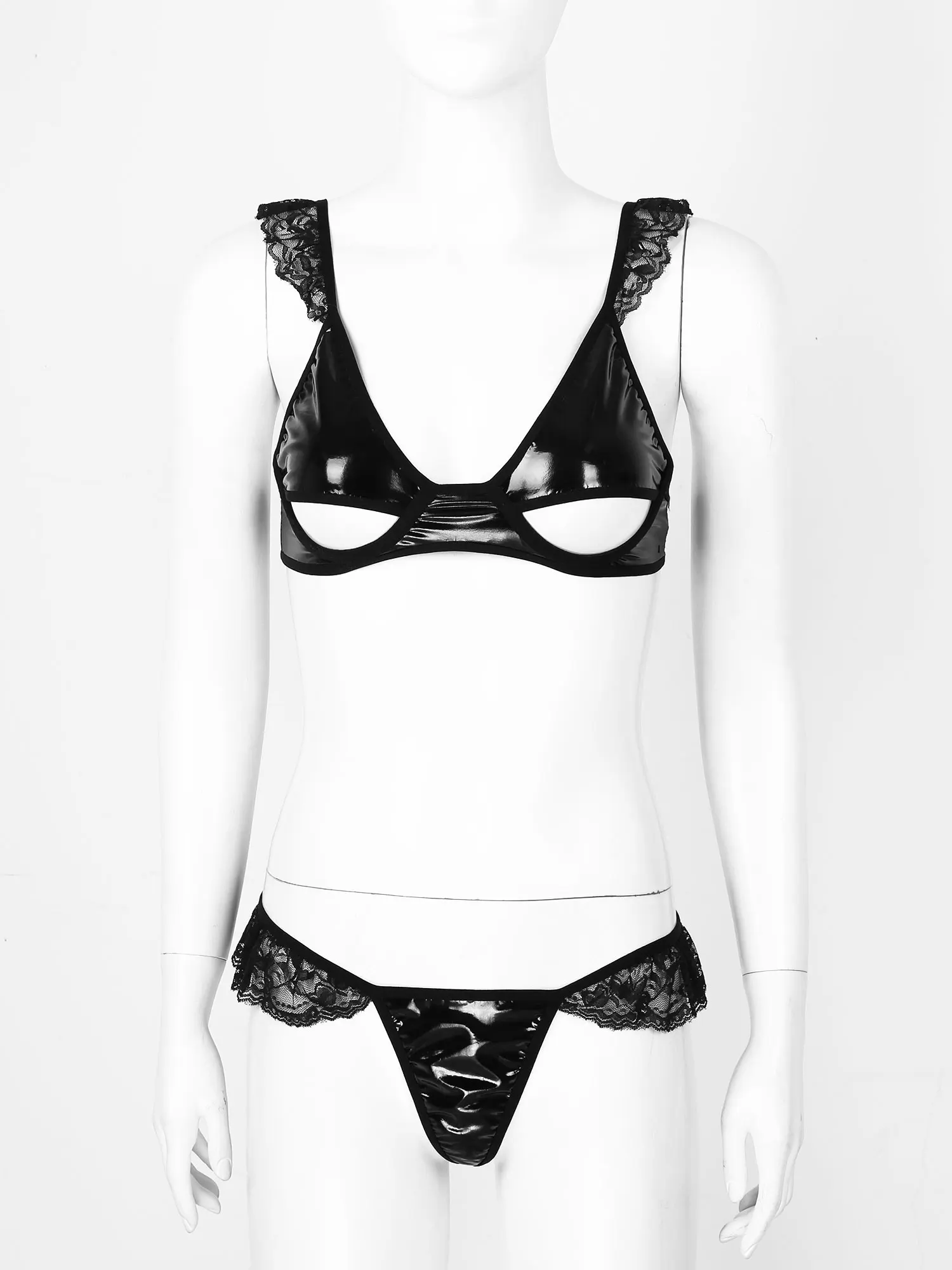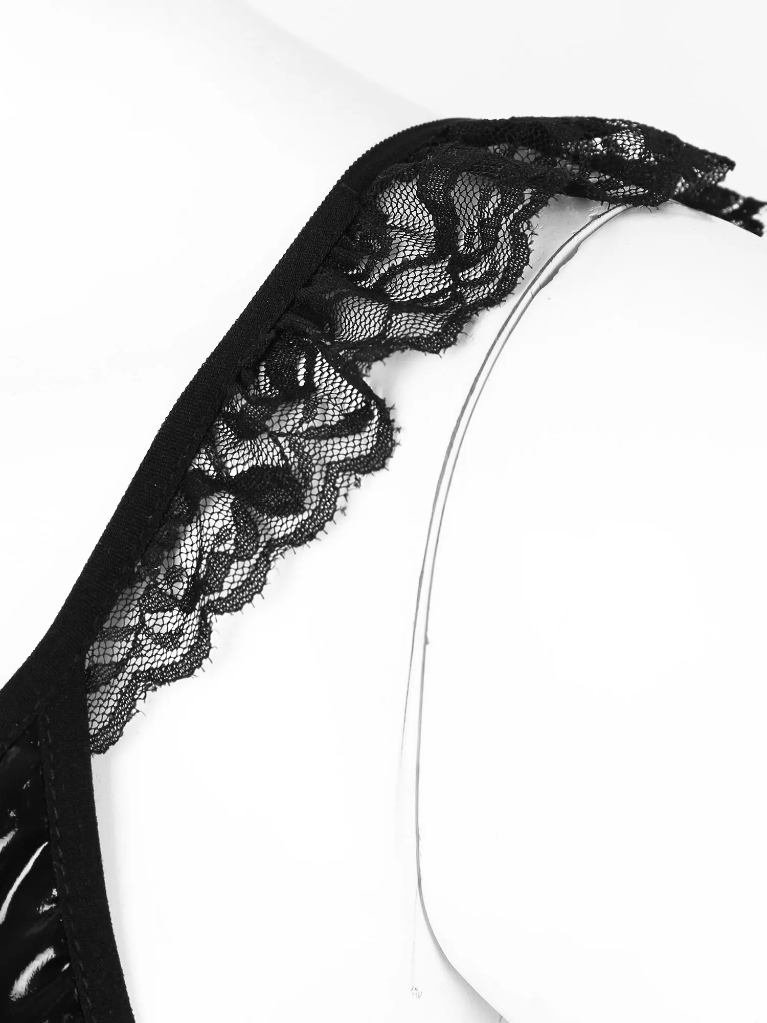 Lingerie set with bra and G-string thong. Outside with lace embroidered, inside with faux patent leather.
