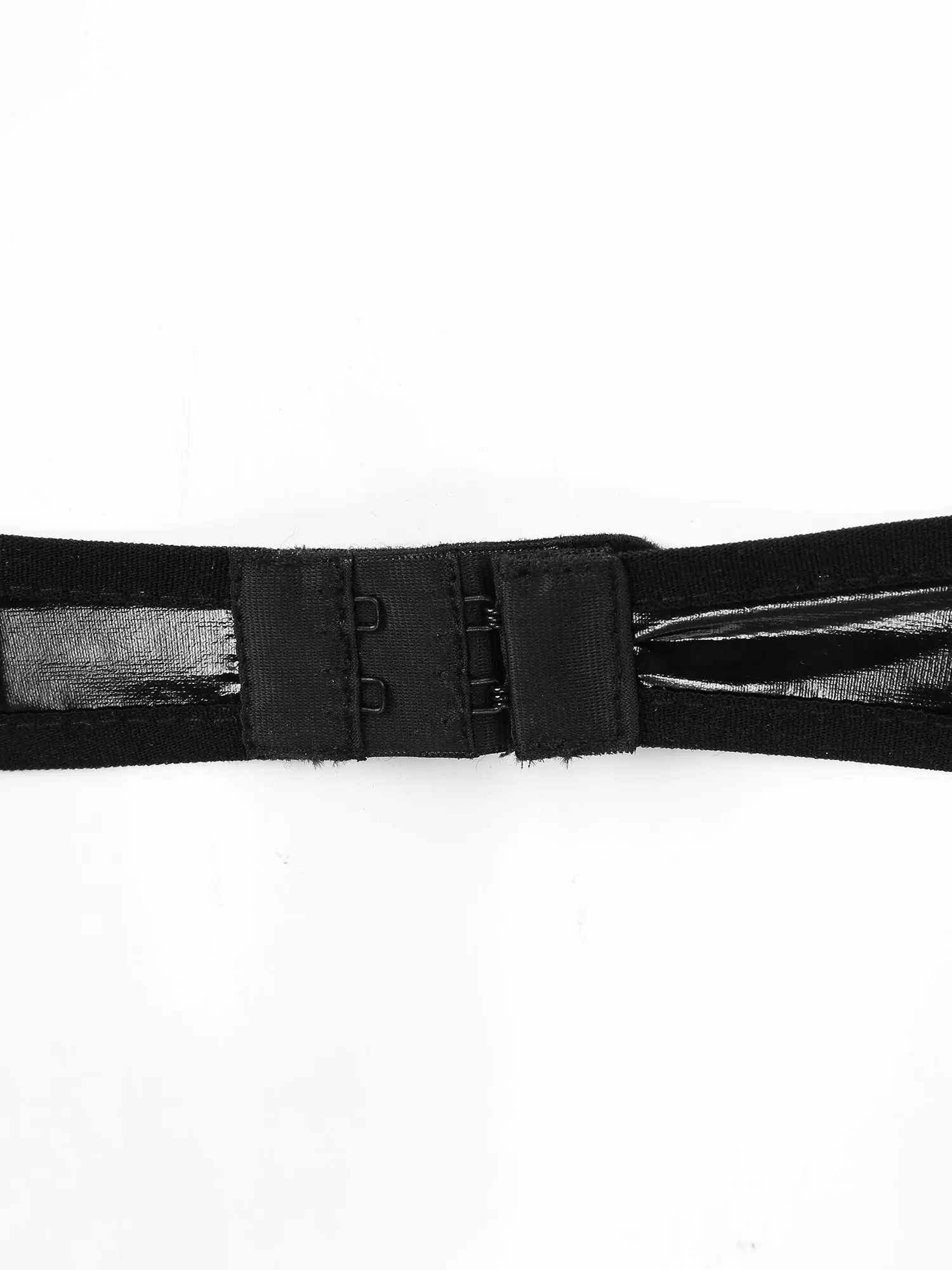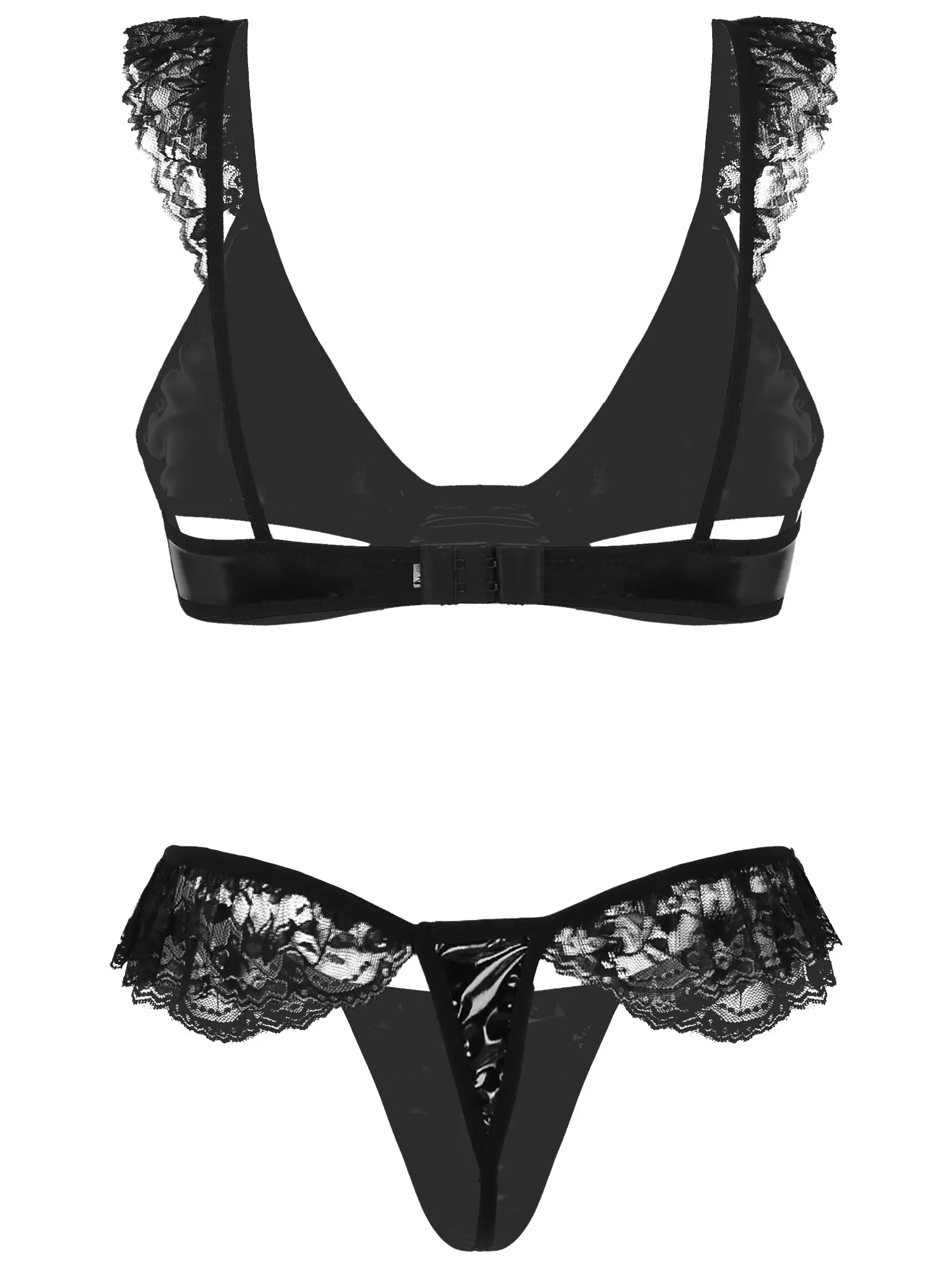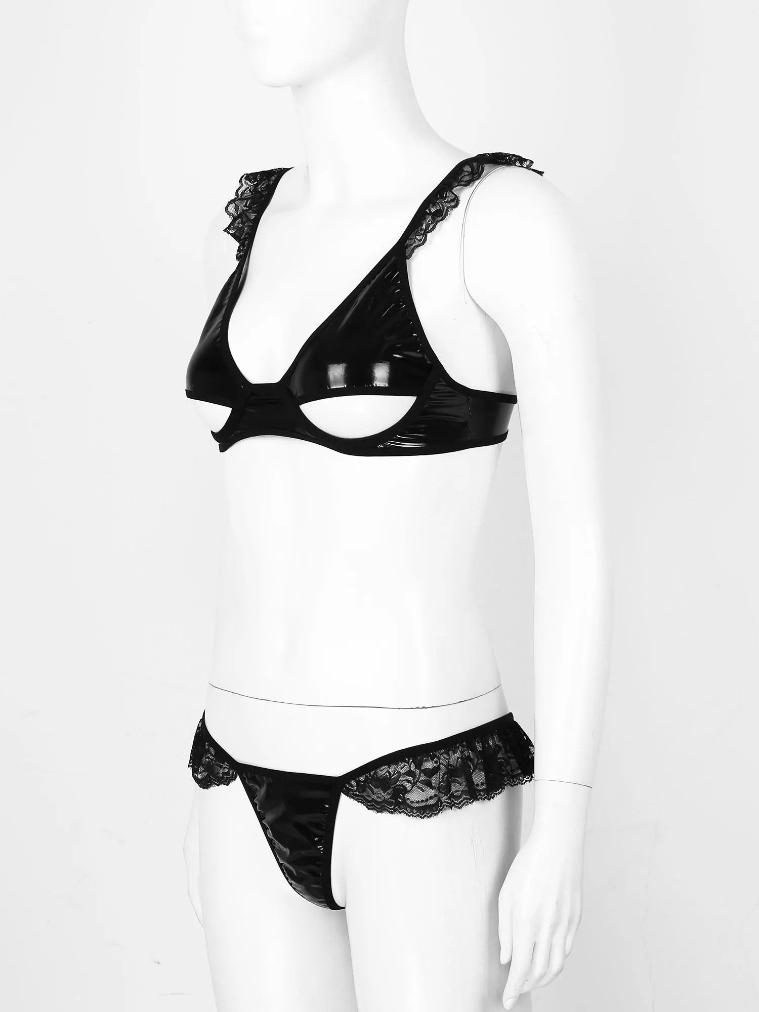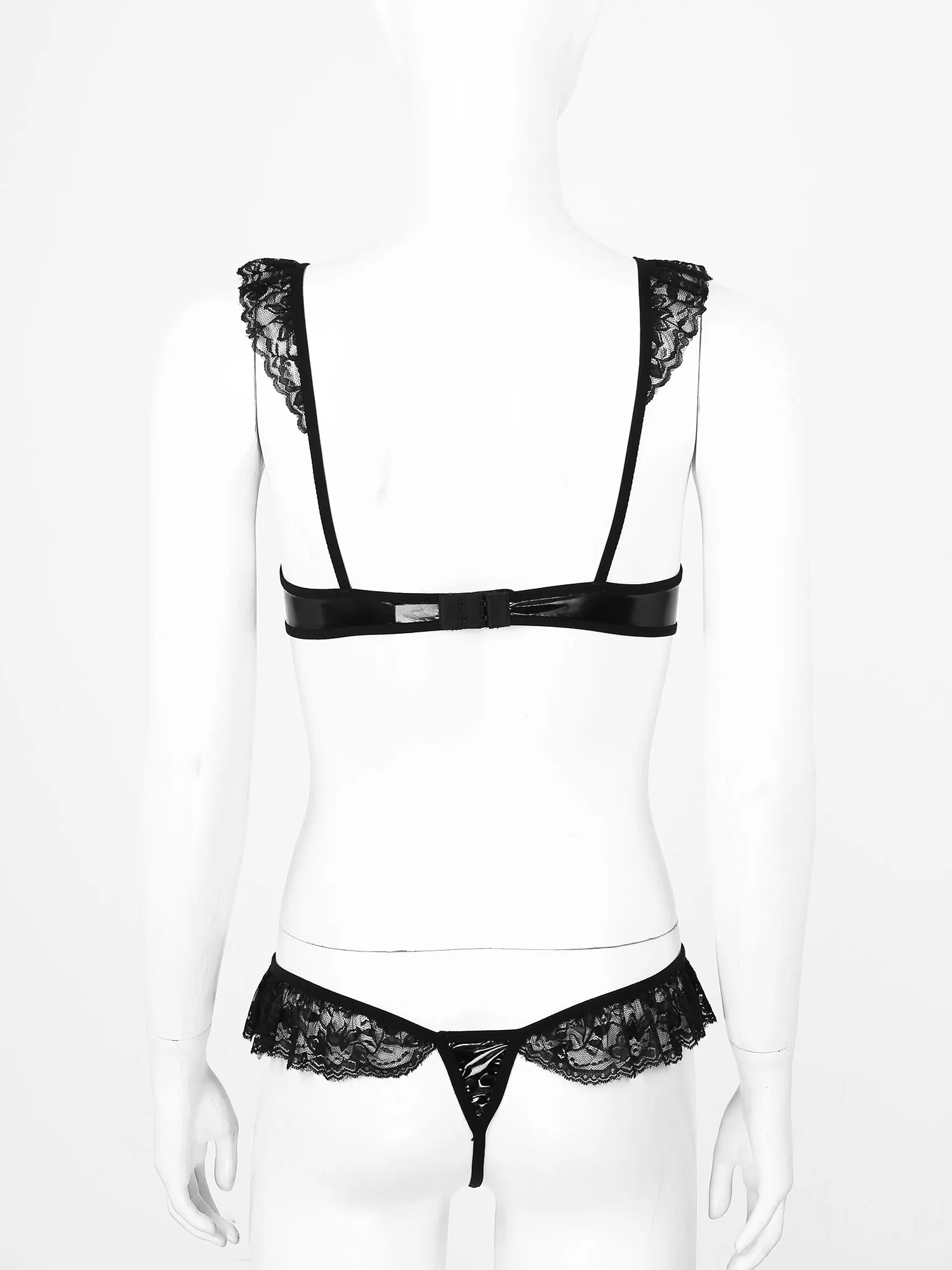 Lingerie set with bra and G-string thong. Outside with lace embroidered, inside with faux patent leather.