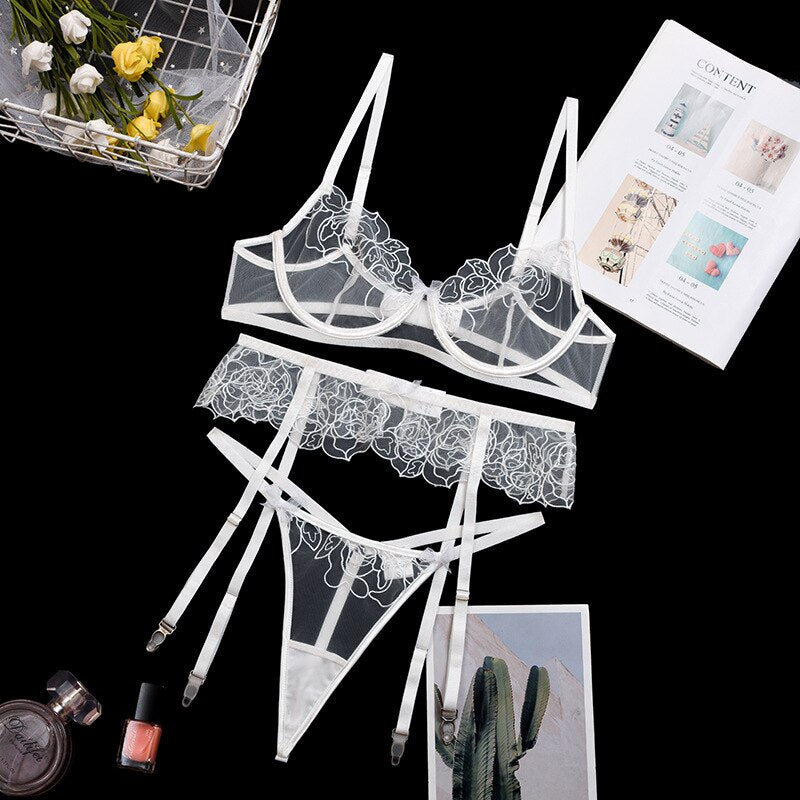 Women Sexy Lace Floral Embroidery Underwear Perspective Temptation Garters Sensual Lingerie Exotic See-through Bra Sets