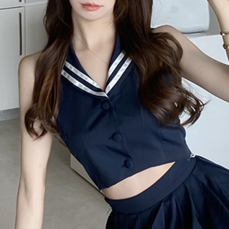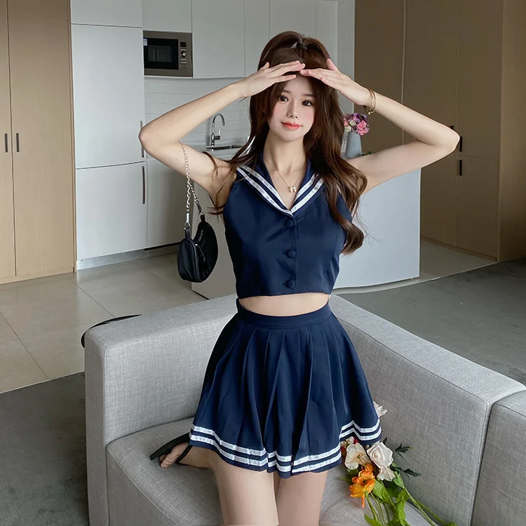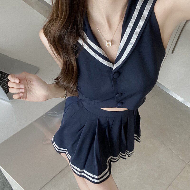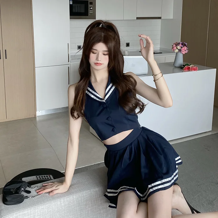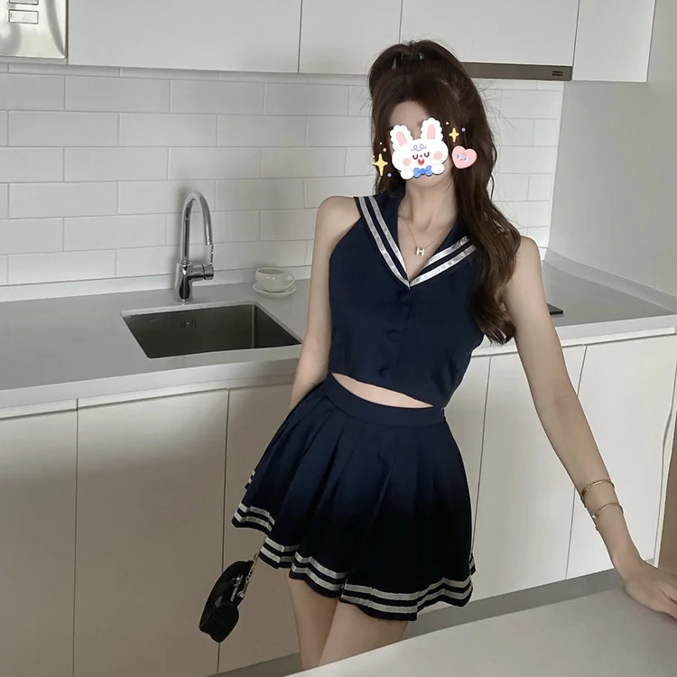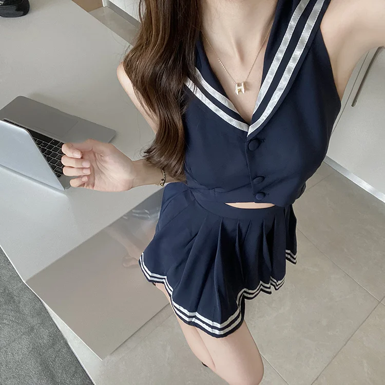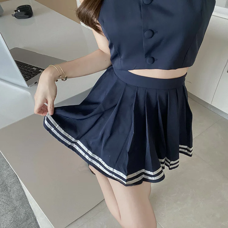 Women Two Piece Set Conjuntos De Vestido Sweet Chic Navy Collar Short Halter Top + JK Pleated Skirt Suits Ropa Mujer Verano 2021