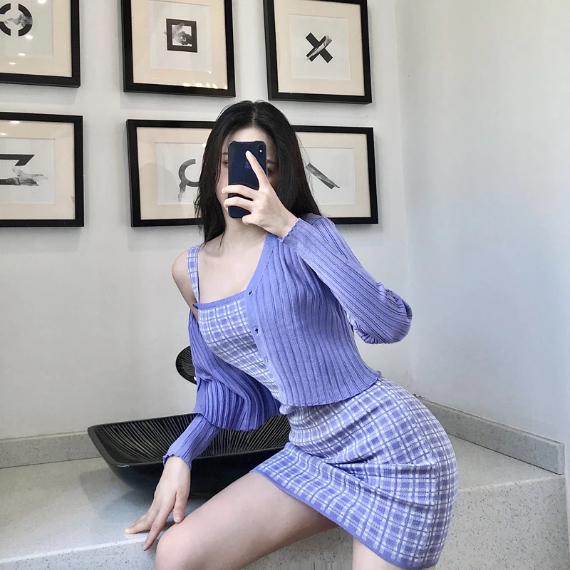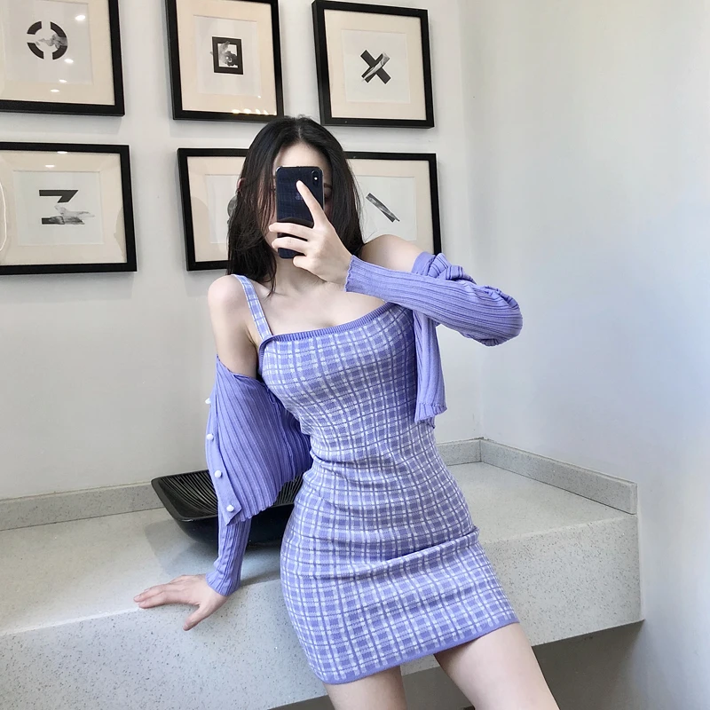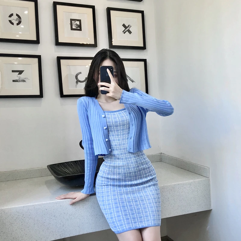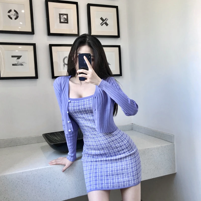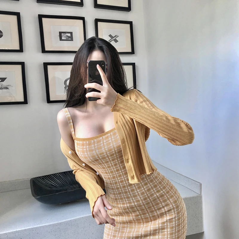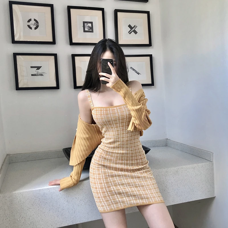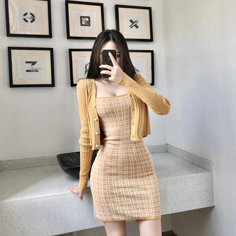Women's Autumn New Short Coat + Sexy Retro Plaid Sling Bag Hip Dress Knitted Two-Piece Sets Female