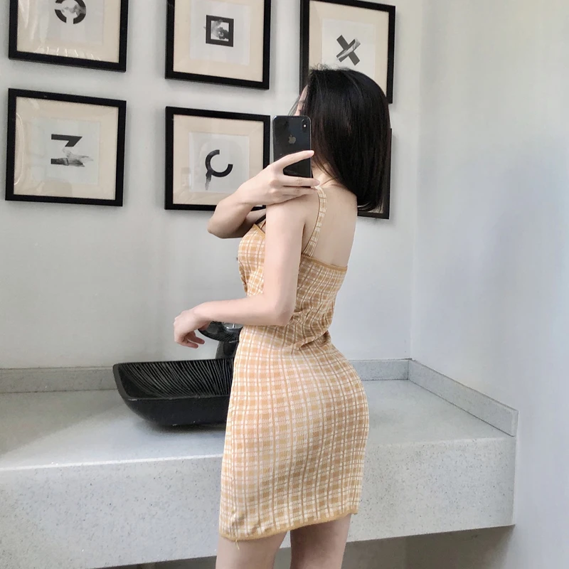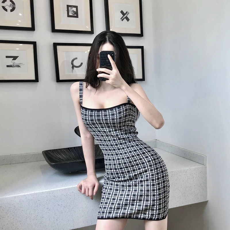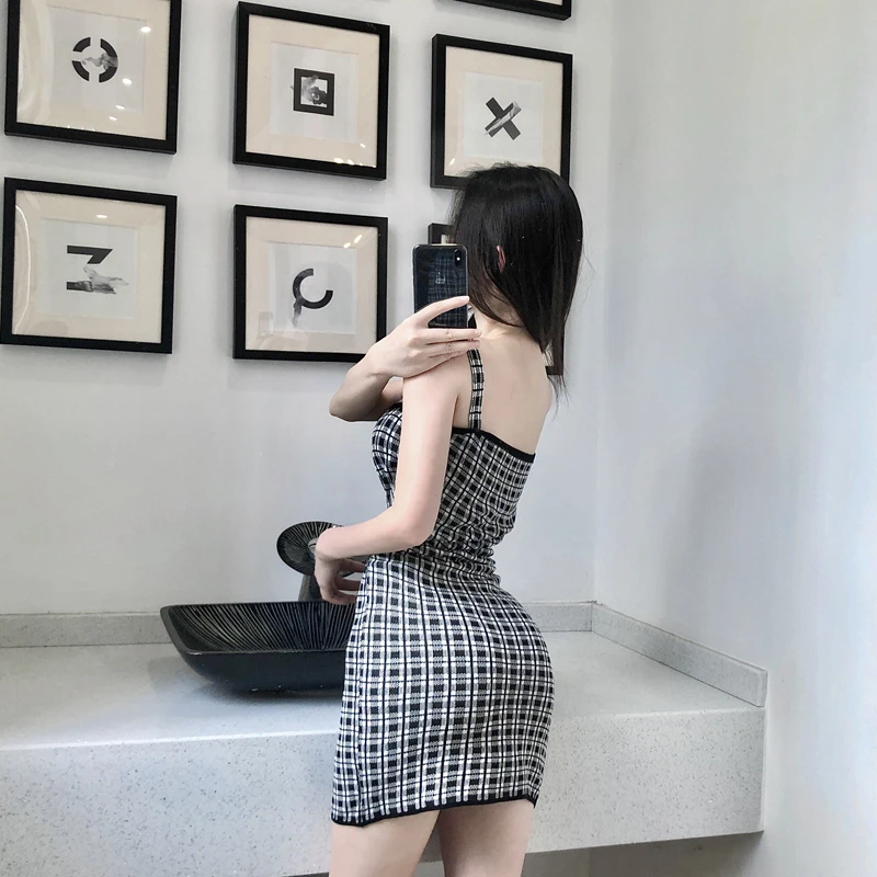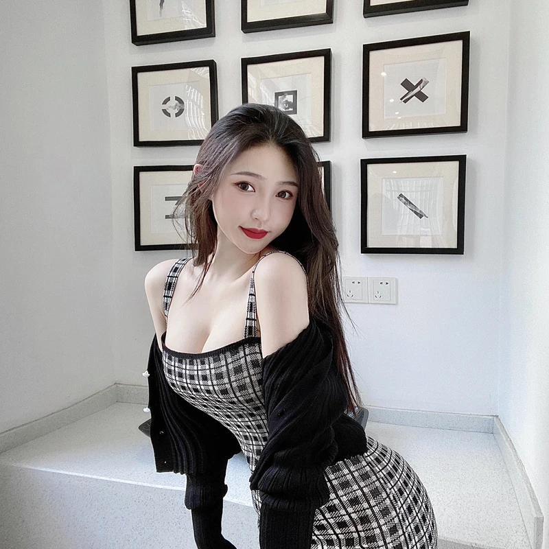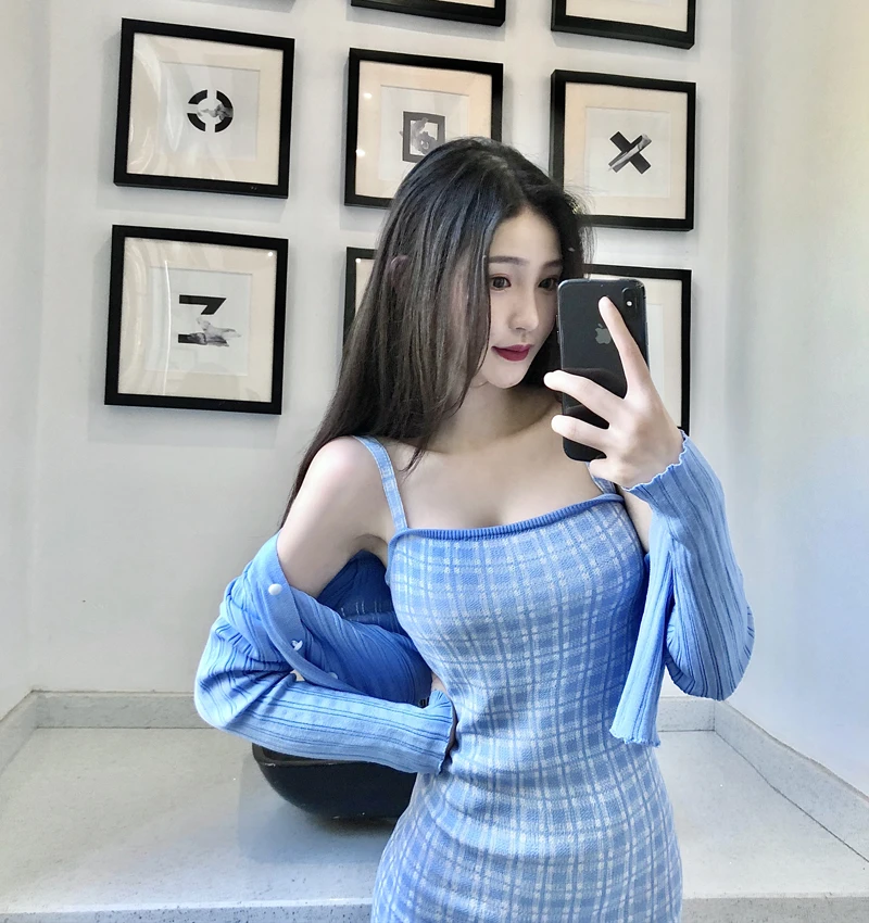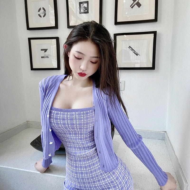 Women's Autumn New Short Coat + Sexy Retro Plaid Sling Bag Hip Dress Knitted Two-Piece Sets Female