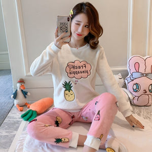 Winter Long Sleeve Thick Warm Flannel Pajama Sets Women Korean Print Coral Velvet Sleepwear Pyjama Pijama Mujer Homewear Clothes