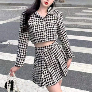 Two Piece Set Vintage Tweed Crop Top Long Sleeve Short Jacket Coat A-line Mini Skirts Korean Sets Sweet Autumn New 2022