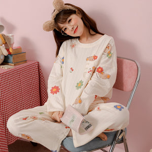 • Knitted Cotton Round Neck Korean Style Sleepwear Sets Women Long Sleeve Night Dress home wear trousers suit can be outside